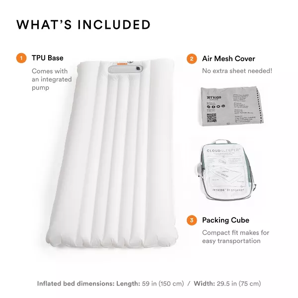 - COMPACT TRANSPORT - Unlike many travel beds, you can store and transport the CloudSleeper with minimal fuss. The included packing cube allows for compact storage and easy, lightweight transportation—it’ll even fit in your JetKids BedBox!
