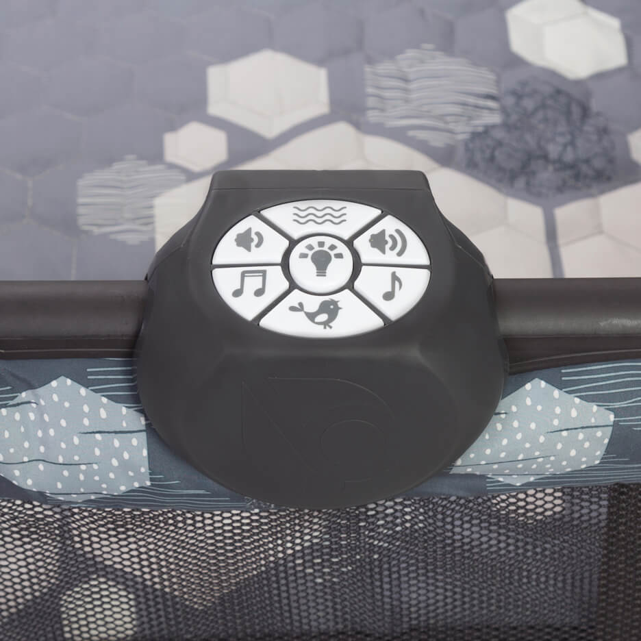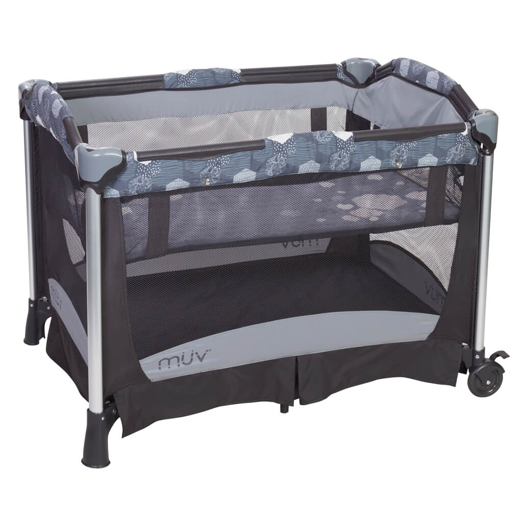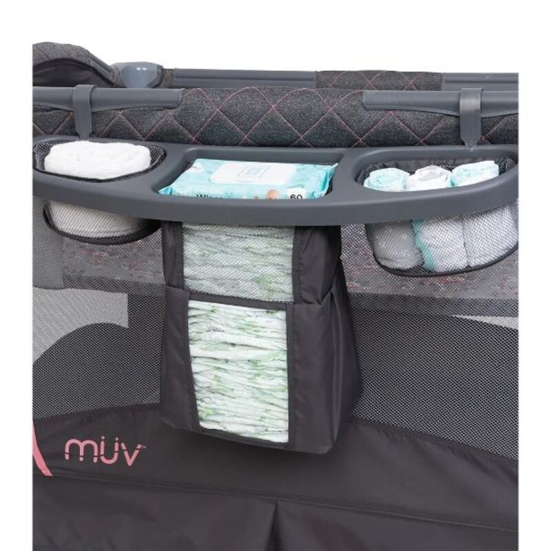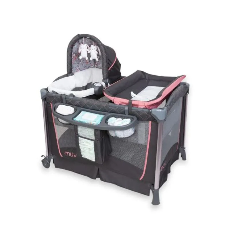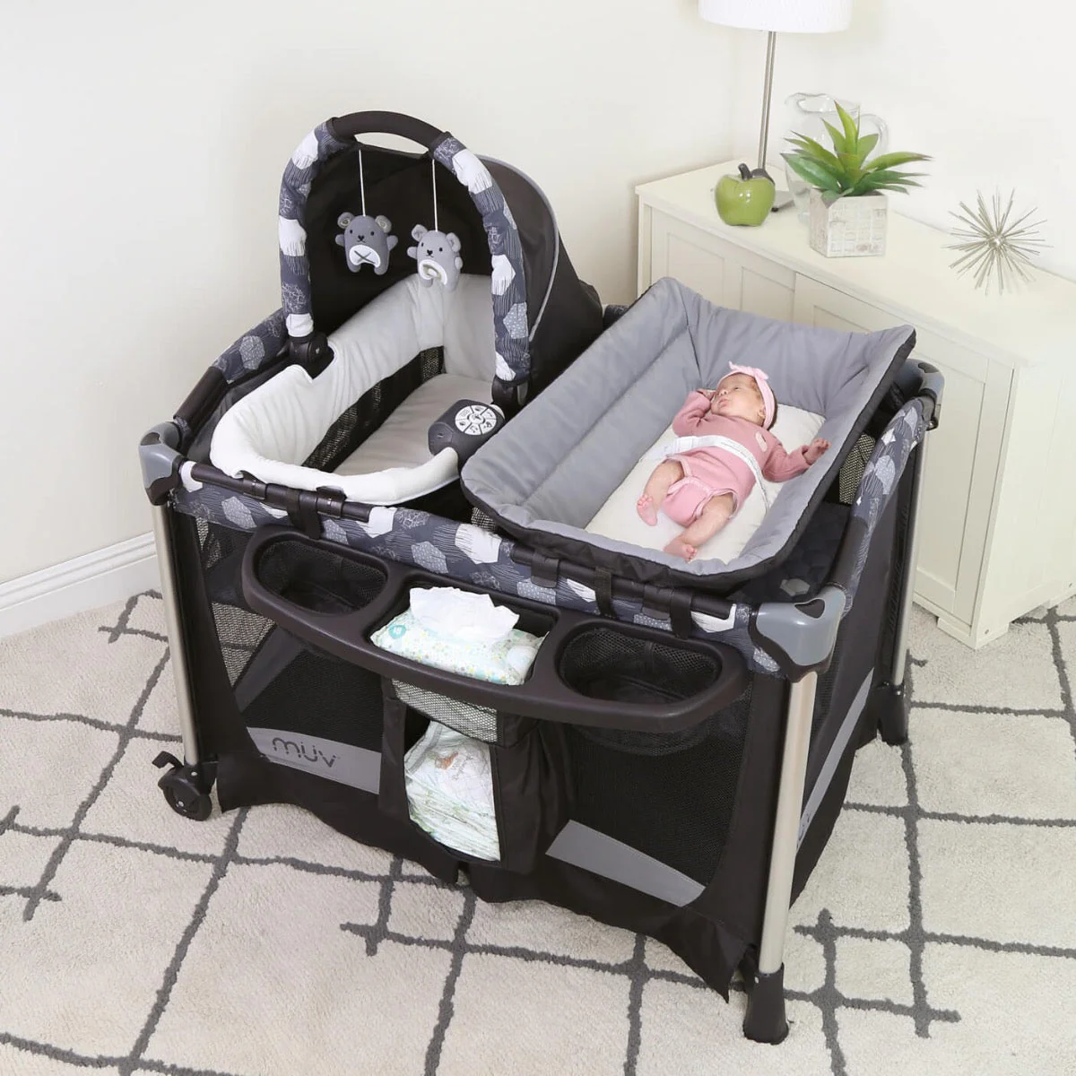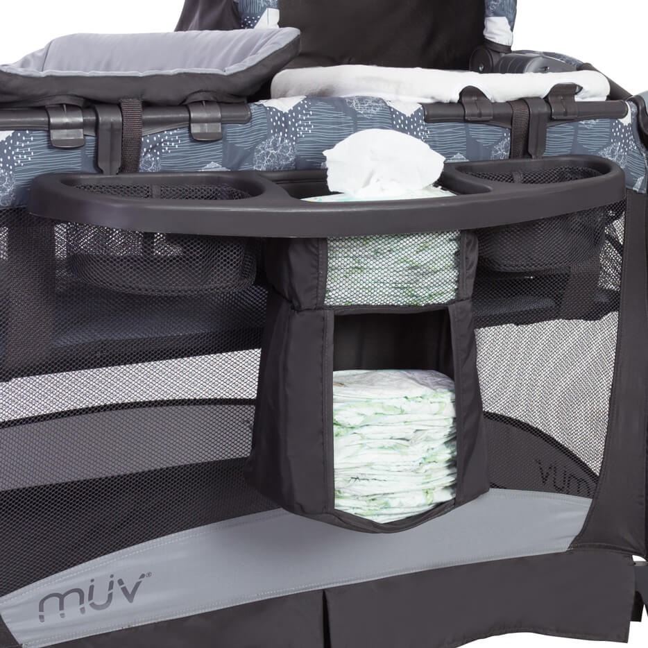 The MUV Custom Grow Nursery Center Playard features everything mom and dad need for play, sleep, changes and travel. This all in 1 center includes portable Rock-a-Bye bassinet, removable safe-surround changing table, and deluxe diaper and wipe organizer.
