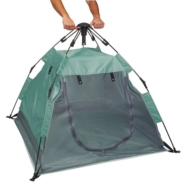 Zippered mesh opening and push lock Internal storage pockets 3/4 sun shades with magnetic closure 50% UV protection Mesh sidewalls for air flow, visibility, and to act as an insect net Designed with more head room so your child can comfortably use it at an older age Sleeping pad snaps under the floor for comfortable play or sleep Automatically pops open for use and quickly folds up to store in its own storage bag Steel frame - 5% polyfiber mattress, 88% fire-resistant poly