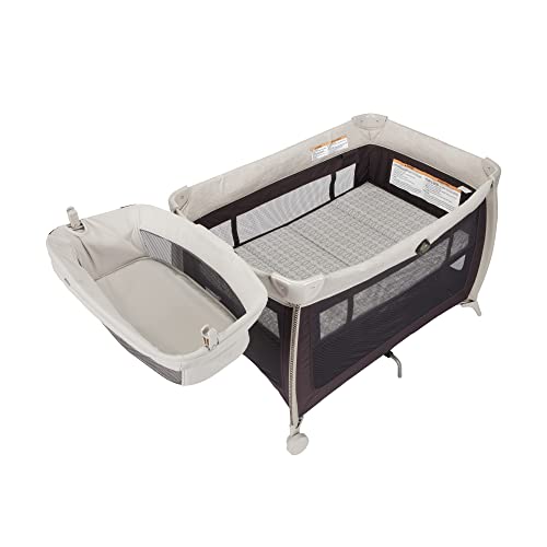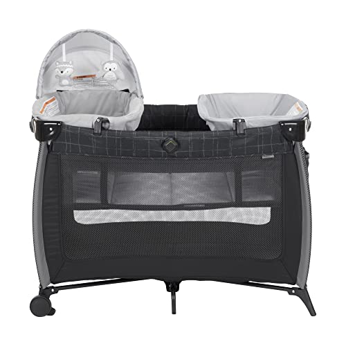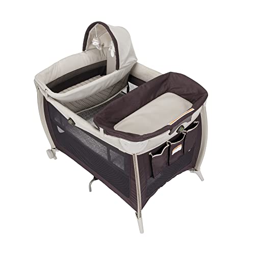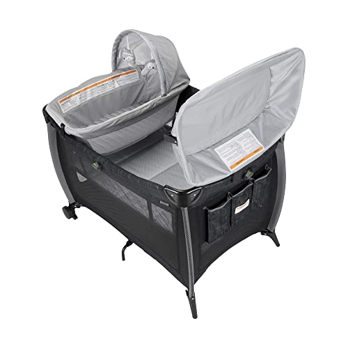 Meet the Play-and-Stay Play Yard, a 3-in-1 fashion-meets-function essential for new parents. The Play-and-Stay features a removable full bassinet, a flip-away infant bassinet with a detachable canopy and plush toys, and a flip-away changer that stores easily when not in use. Parents will appreciate the side storage pockets and premium accents—like faux-leather legs and stitching detail—as well as its two wheels that allow for ease of movement around the house.