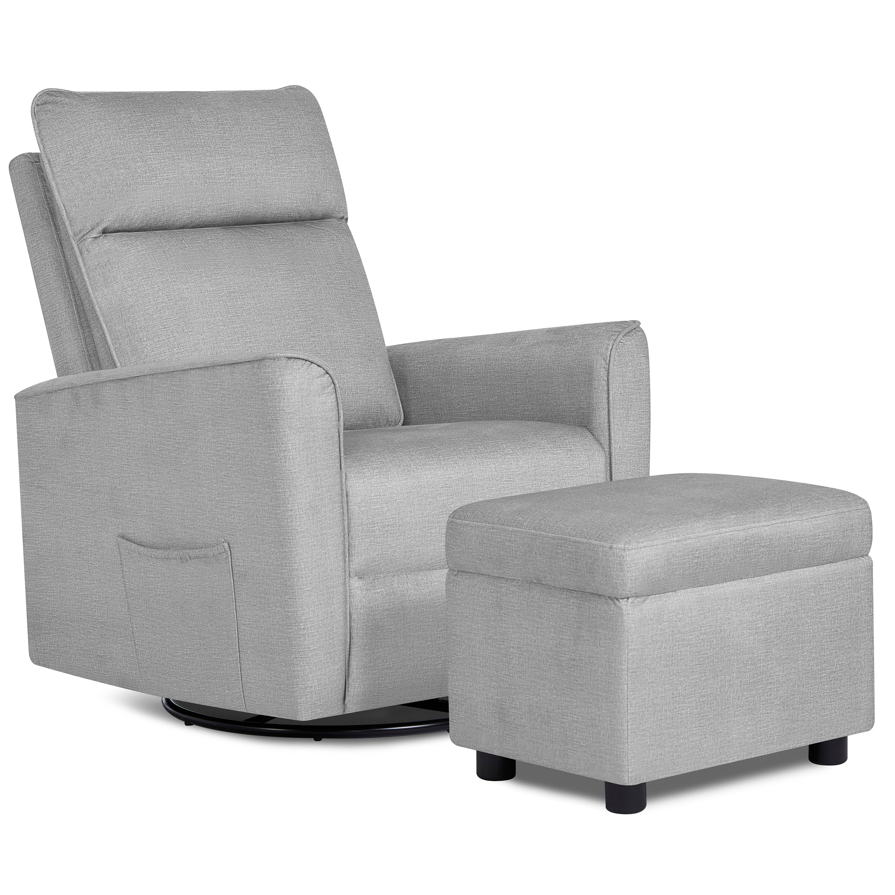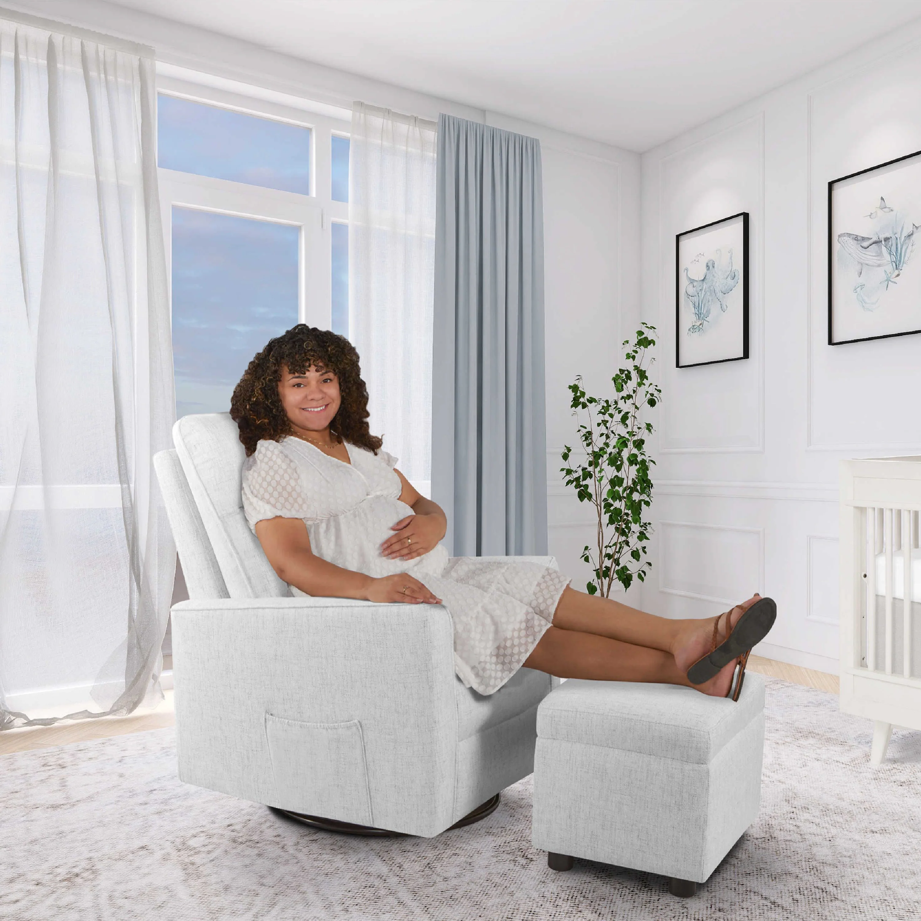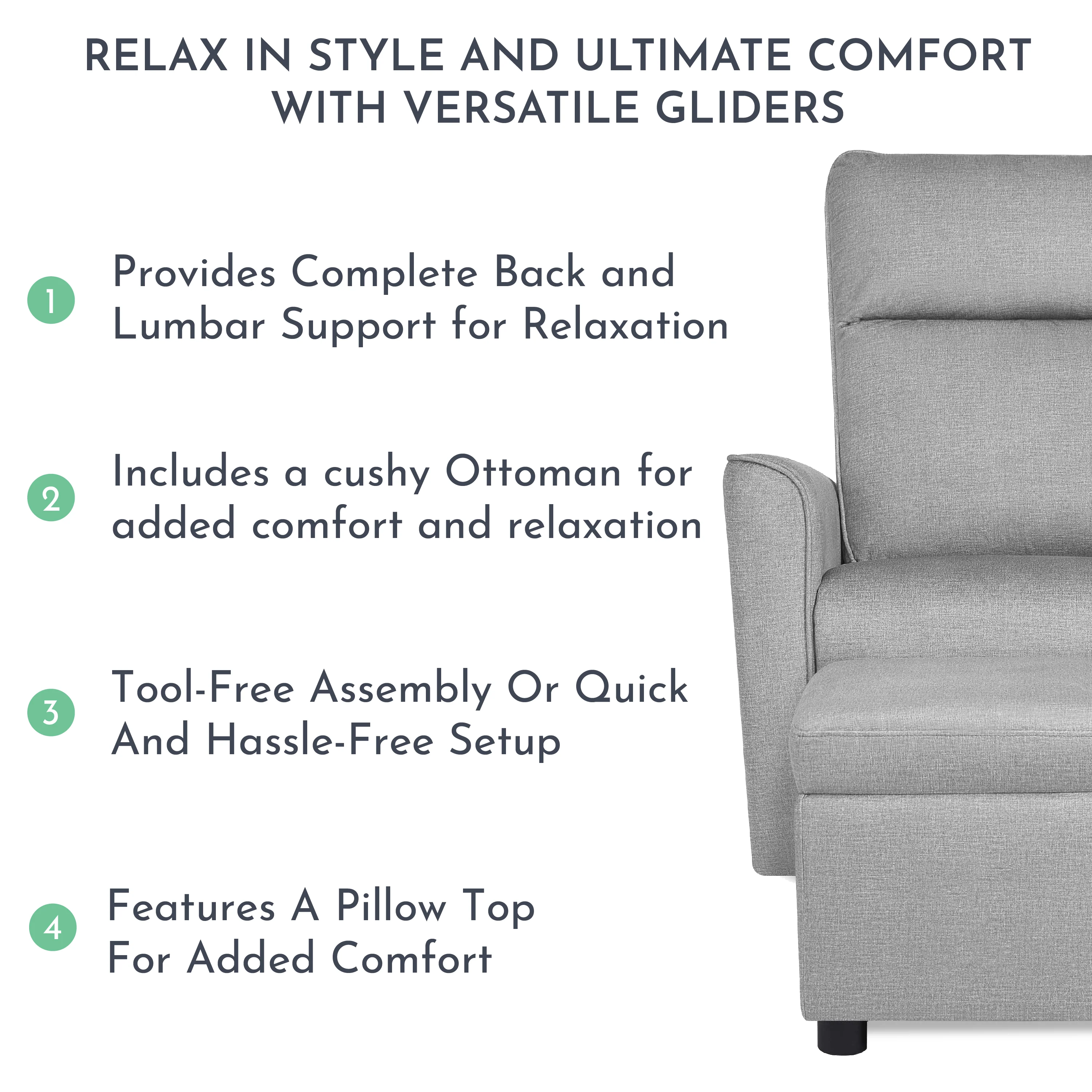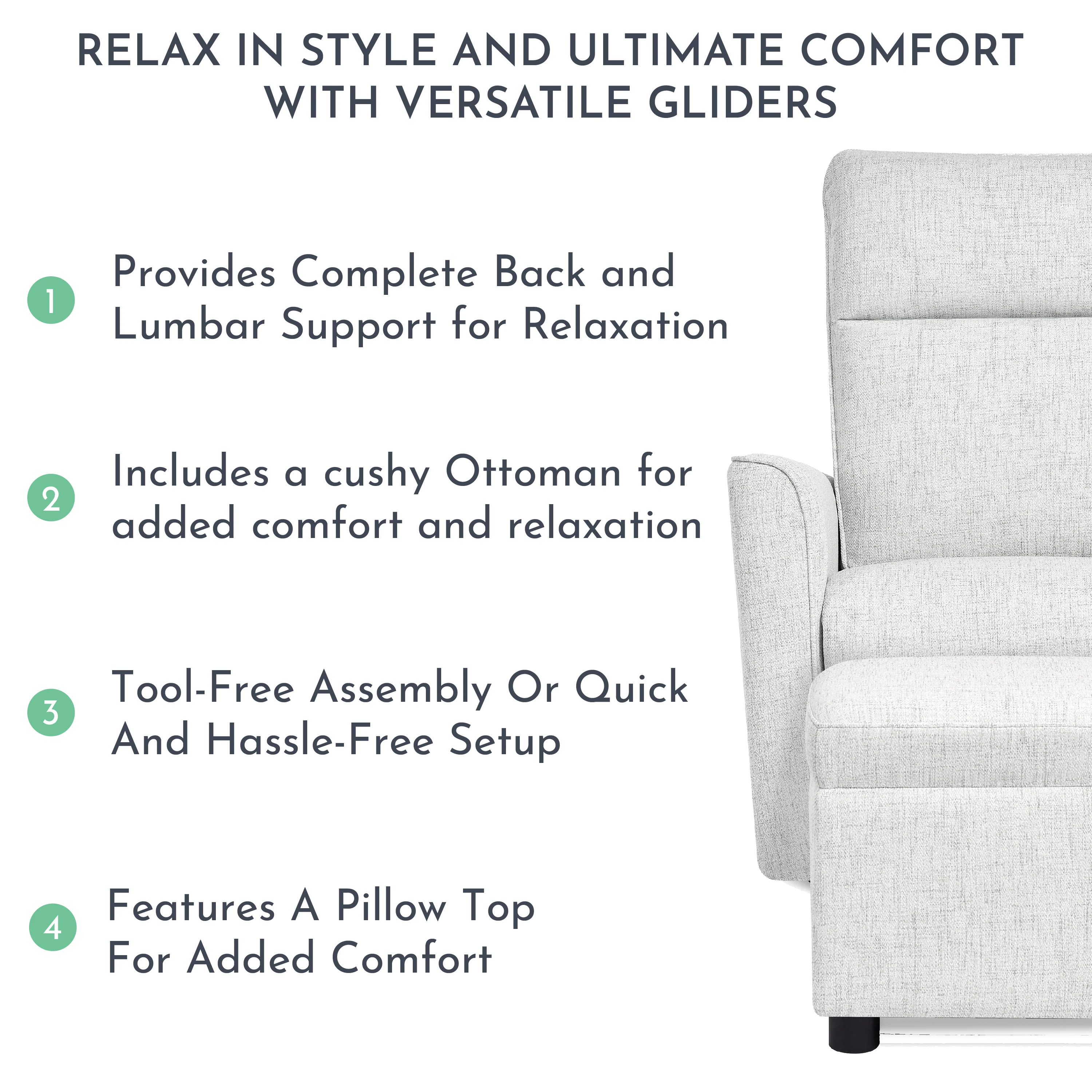 - The Evolur Aria Glider comes with a cushy Ottoman for you to sit back and kick your feet up.