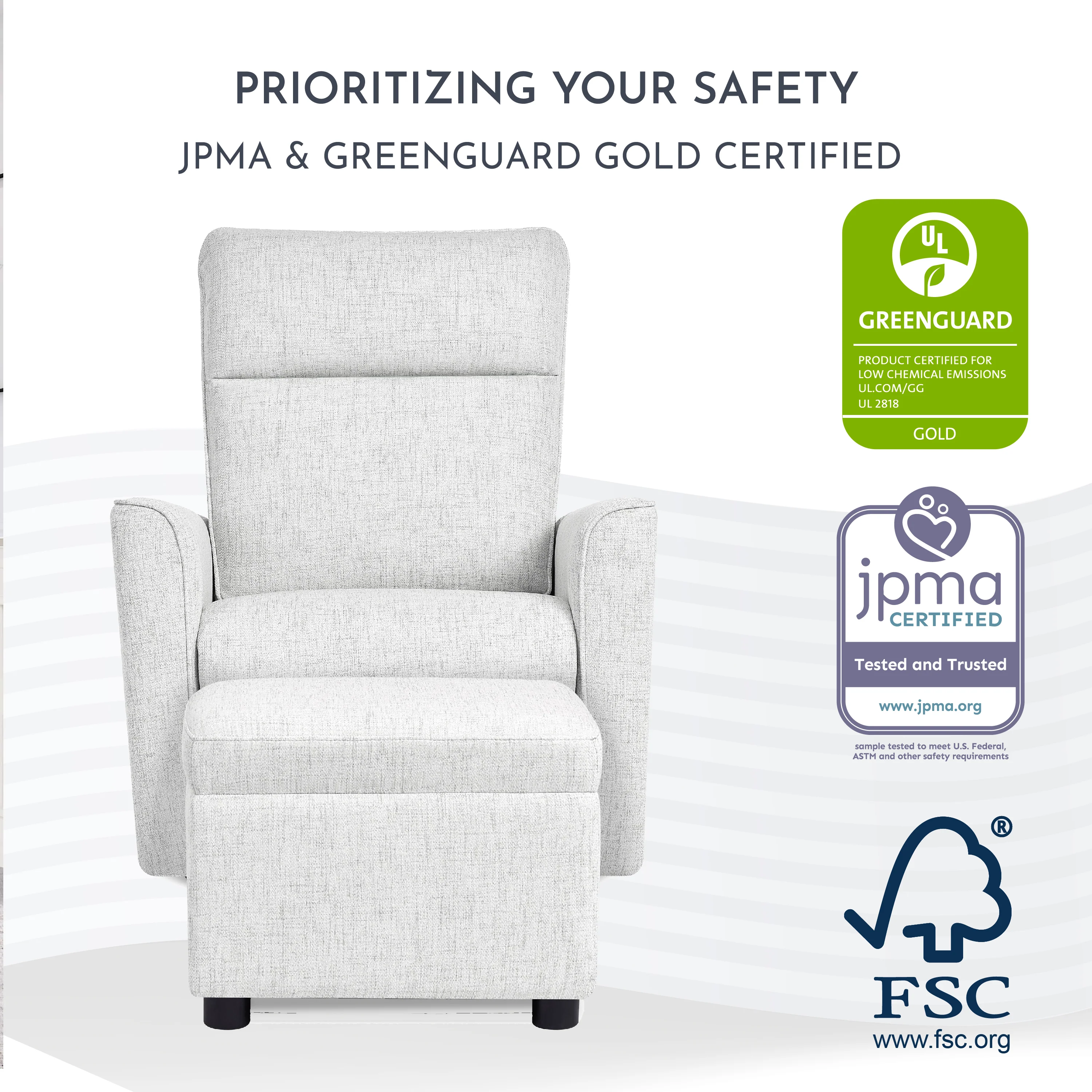 - The Glider is Greenguard Gold Certified and is made of FSC Certified wood making it a safe and ideal choice for your baby nursery.