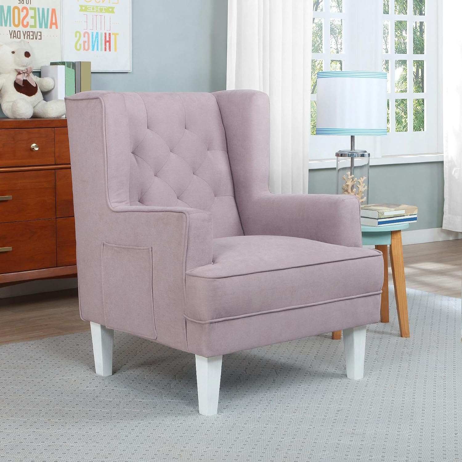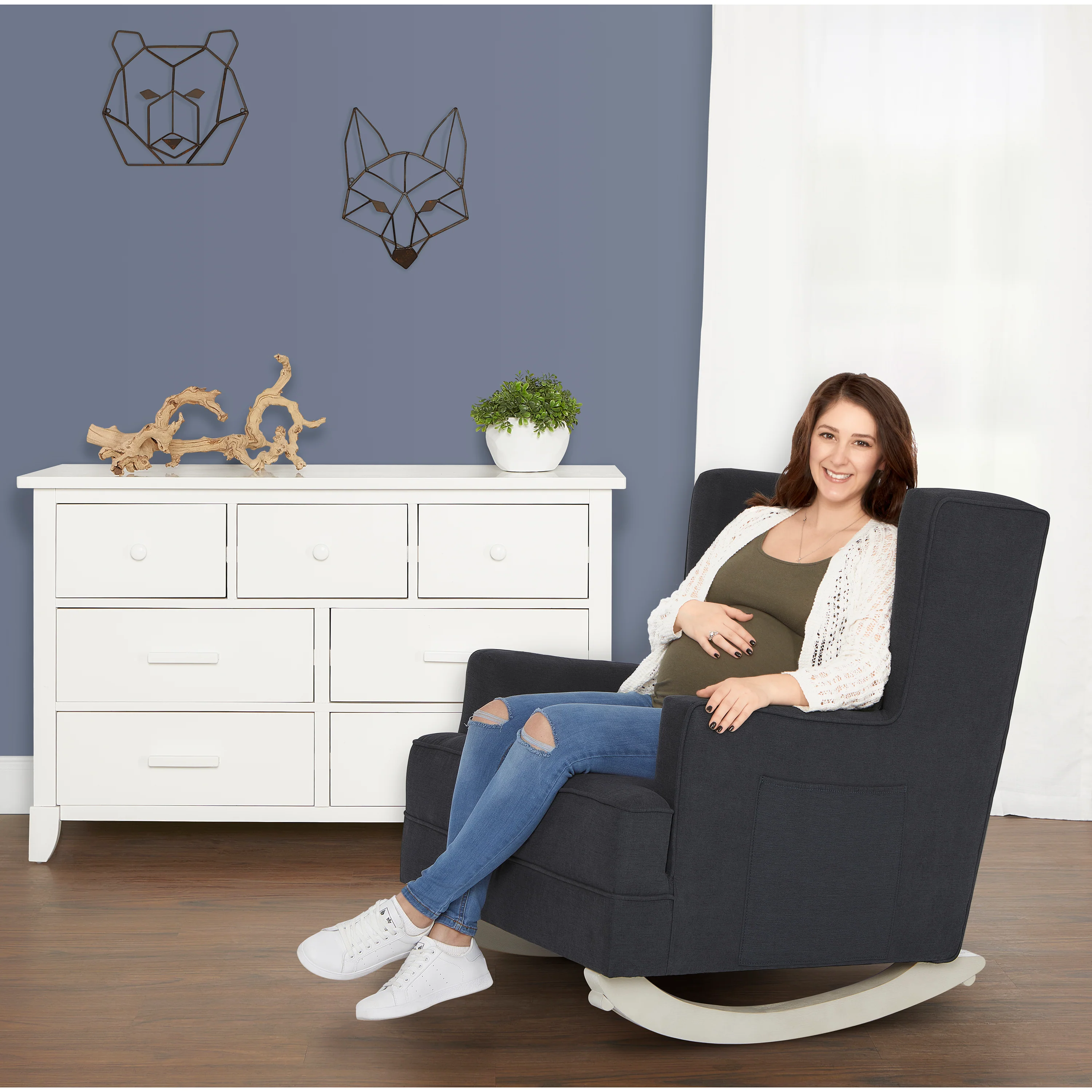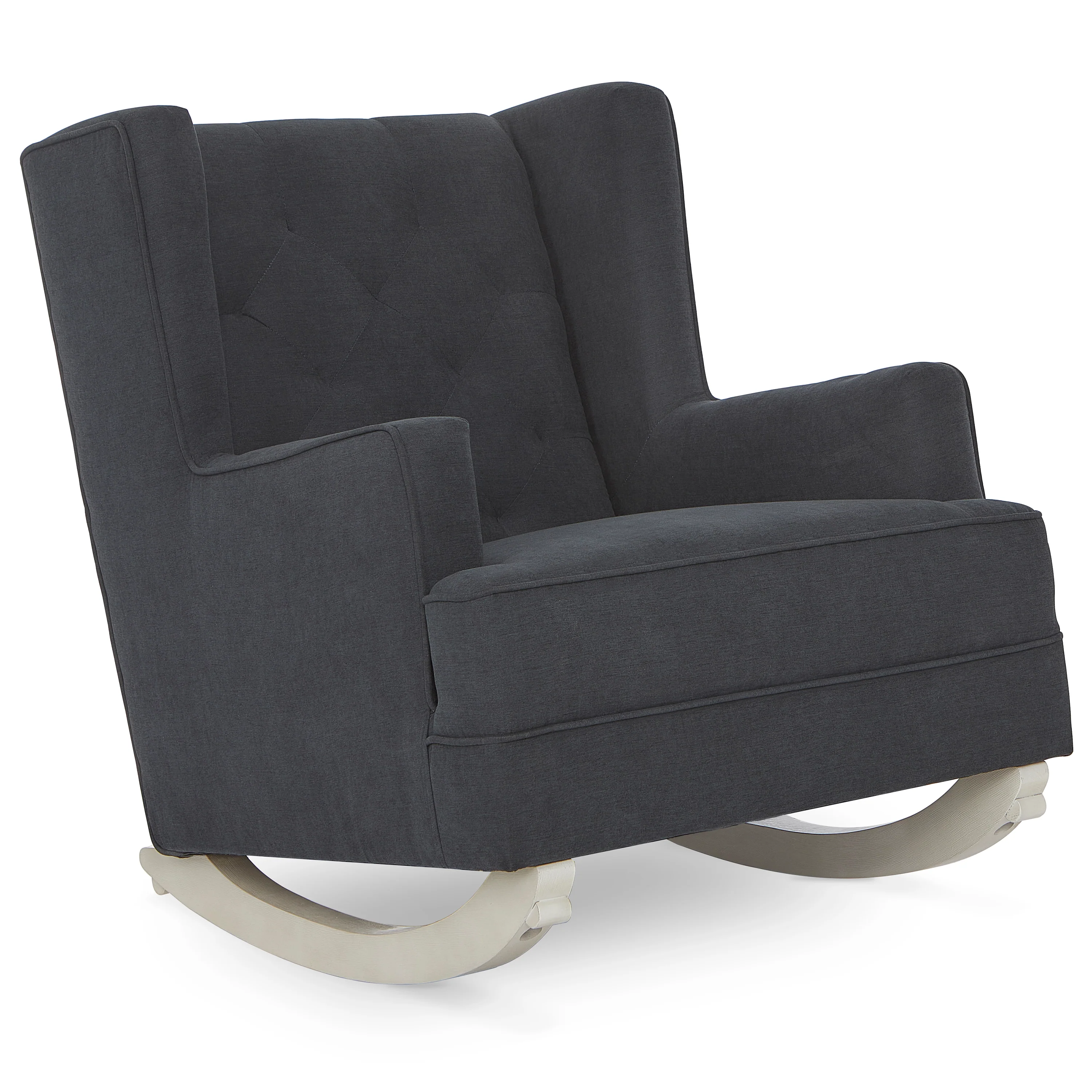 Pamper those aching muscles, nurse your baby or simply enjoy some downtime in the warm embrace of the Evolur Capri Wingback 2-in-1 Rocker and Accent Chair. From plush seating, padded armrests to deep diamond tufting backrest, the Capri spells luxury and comfort like no other! The Capri features an ergonomic high backrest, comfortable side rests, and relaxing rocking motions, designed to provide maximum comfort to your body. Best of all, it converts into a beautiful accent chair - perfect for your nursery, study or bedroom. Built to last, the Capri is constructed out of a solid hardwood frame and hardwood runners. Enjoy the advantages of a stress-free assembly with the Capri! Attach its wooden base to use as a rocker or fix the stationary feet (included) to convert it into an accent chair. The Capri is covered with an soft to touch yet durable and easy-to-clean fabric with foam filling, and features convenient side pockets. The Capri weighs 54.5 lbs. It comes with a 1-Year Limited Manufacturer’s Warranty and is Greenguard Gold Certified.