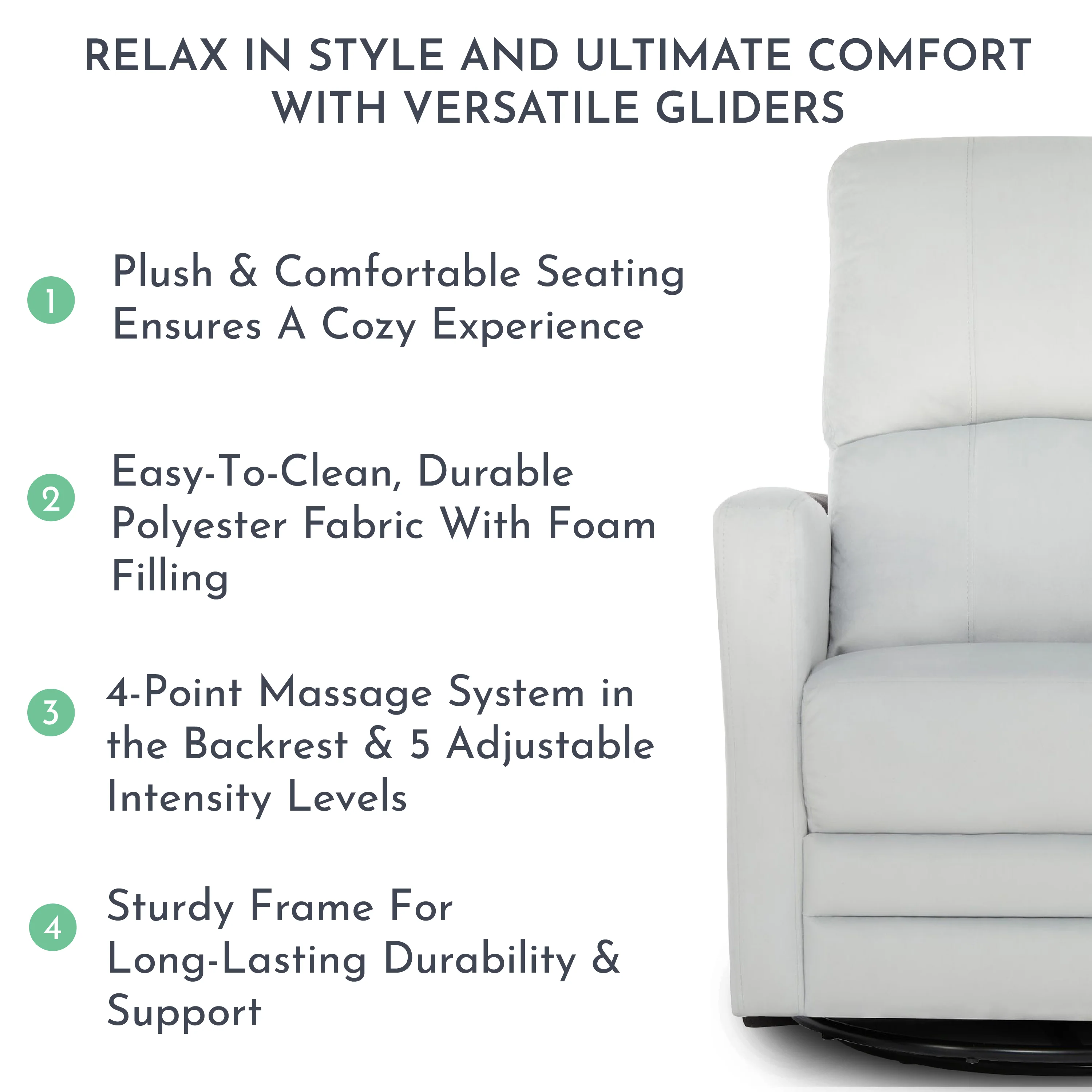 - The Habana Glider & Recliner with Massager comes with a 4-point massage system in the backrest, 8 massage modes & 5 adjustable intensity levels.
