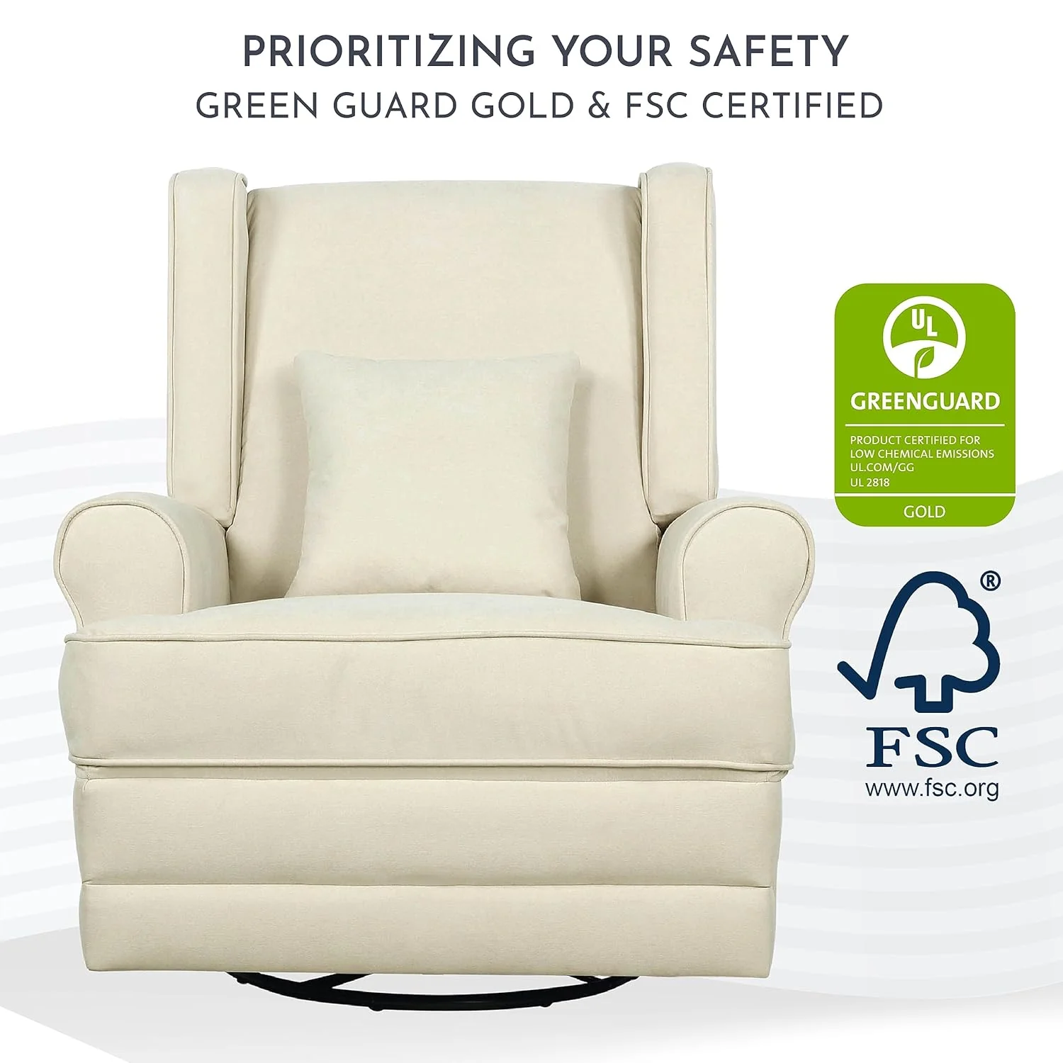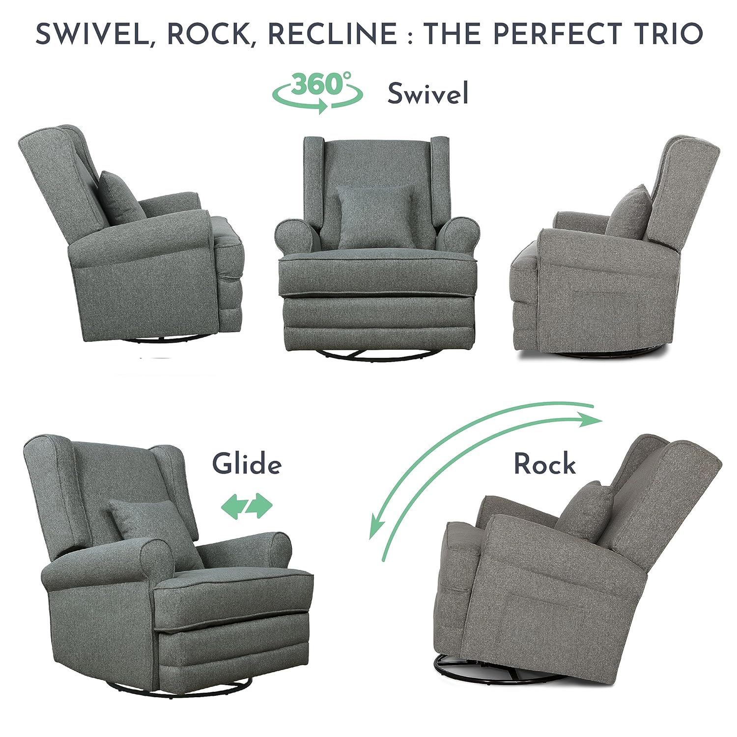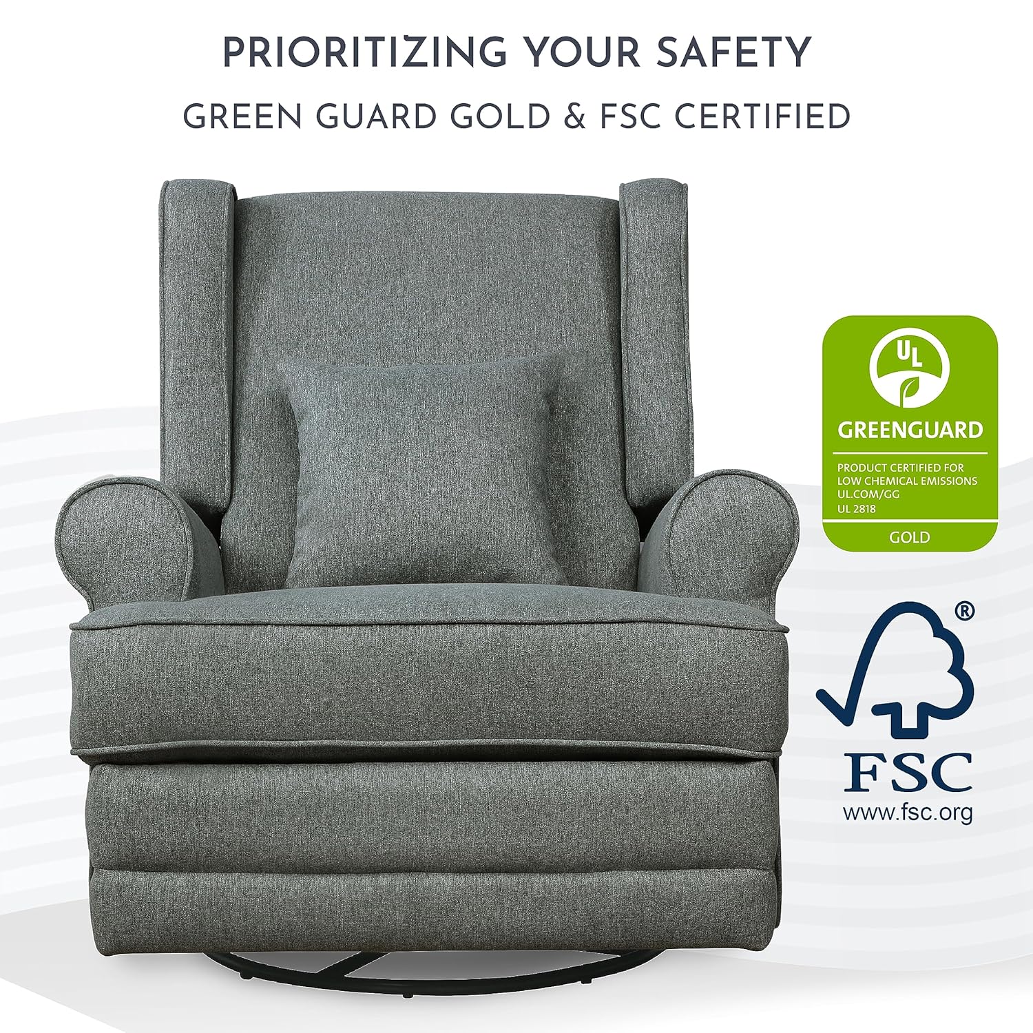 Pamper those aching muscles, nurse your baby or simply enjoy some downtime in the warm embrace of the Evolur Melbourne Wingback Swivel Glider | Nursery Glider. From an easy to operate reclining mechanism to plush seating, a bonus lumbar pillow and padded armrests, the Melbourne spells luxury and comfort like no other! The Melbourne features an ergonomic high backrest, smooth gliding movements and 360° swivel motions, designed to provide maximum comfort to your body. Enjoy the advantages of a stress-free assembly with the Melbourne! Its solid metal base supports 360-degree swivel rotation and gliding. The Melbourne is covered with an soft to touch yet durable and easy-to-clean fabric with foam filling, and features convenient side pockets. This wingback style recliner features an easy to use and reach recline mechanism. Available in a timeless Iron finish. It comes with a 1-Year Limited Manufacturer’s Warranty. This Melbourne Glider is sustainability-conscious and crafted with FSC Certified Wood. FSC (Forest Stewardship Council) Certifications recognize that the wood is ethically-sourced, ensuring the safety of our forests, environment, wildlife and human rights.