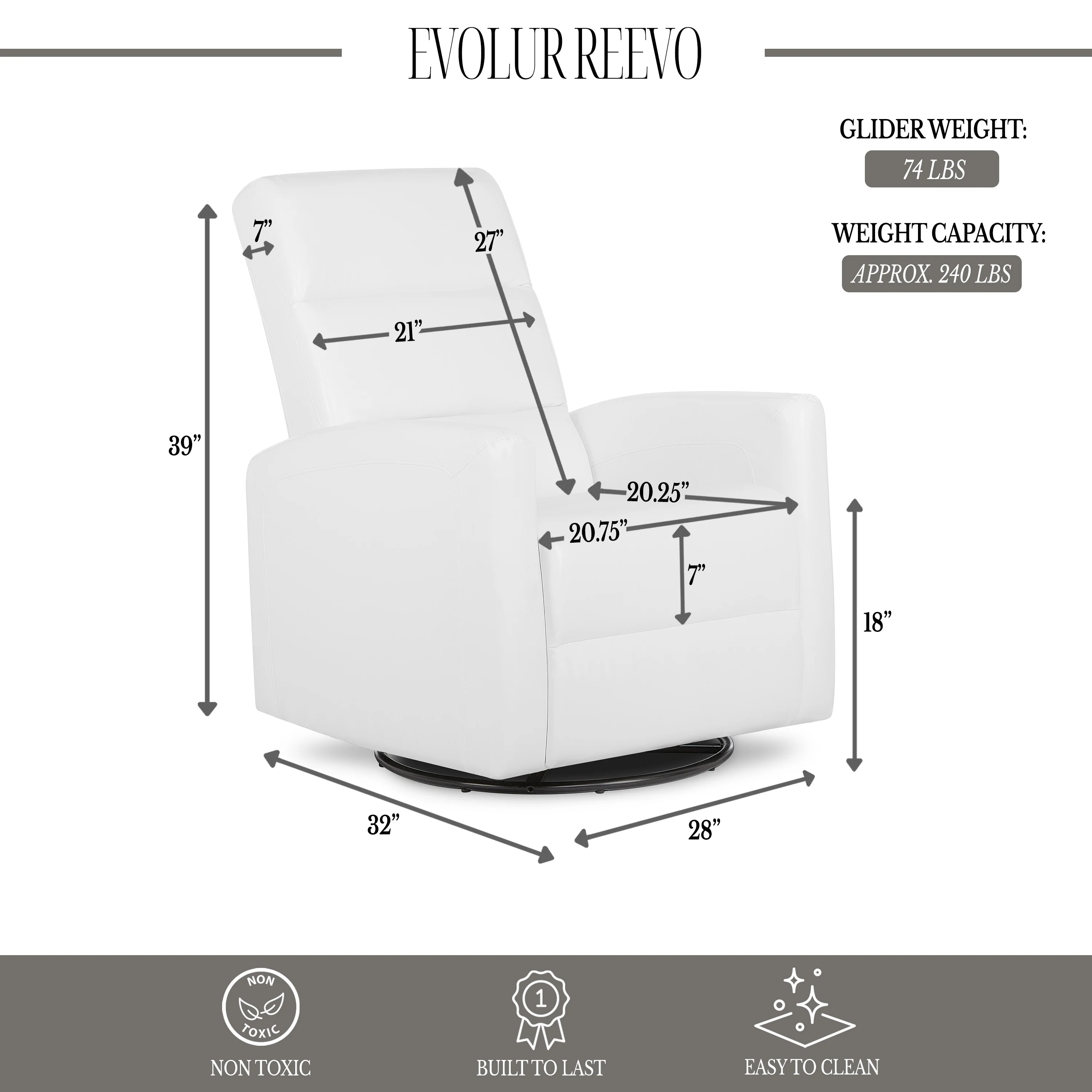 - The glider chair is easy to assemble and wipe clean. The Reevo Glider weighs 74 lbs. Weight capacity: approx 240 lbs.