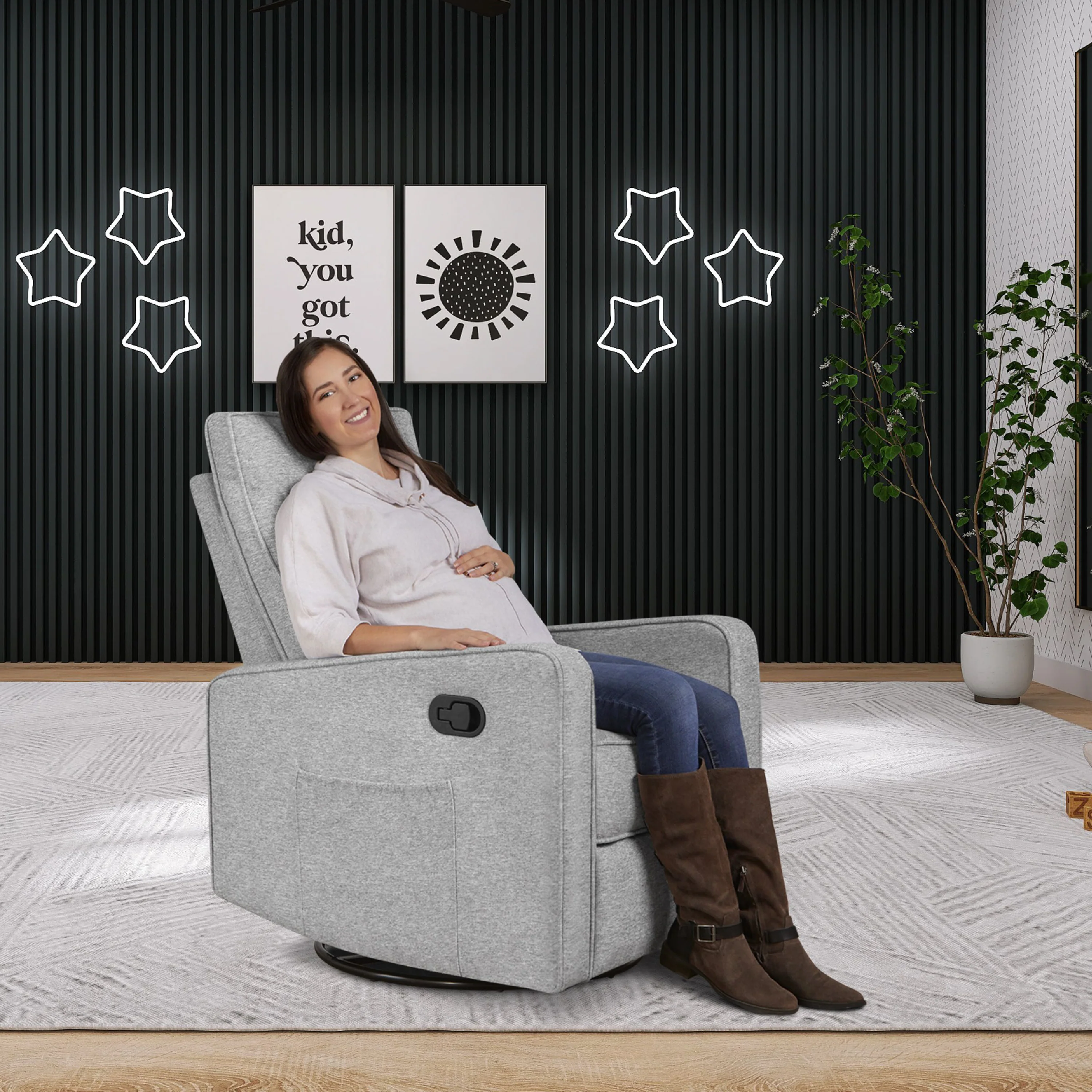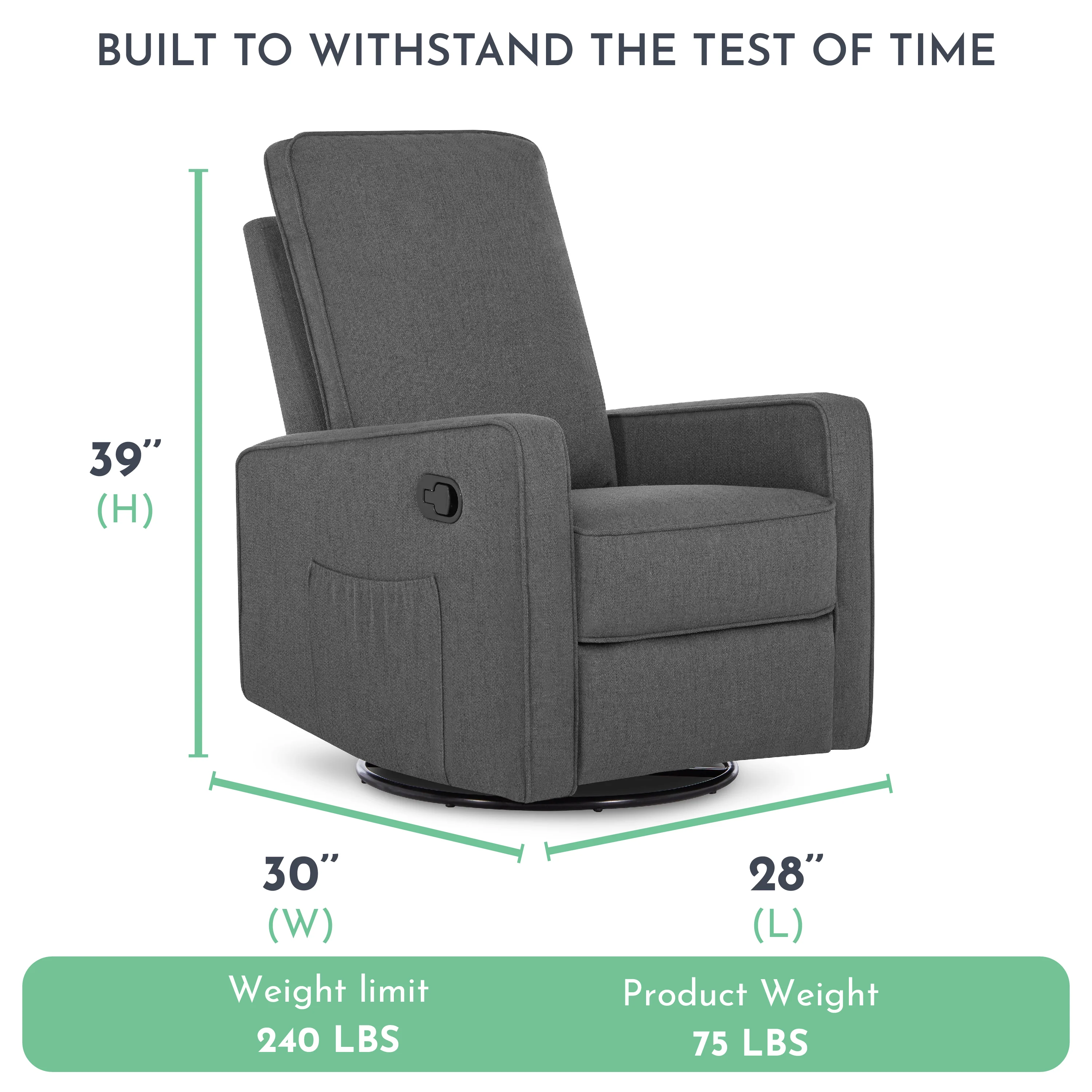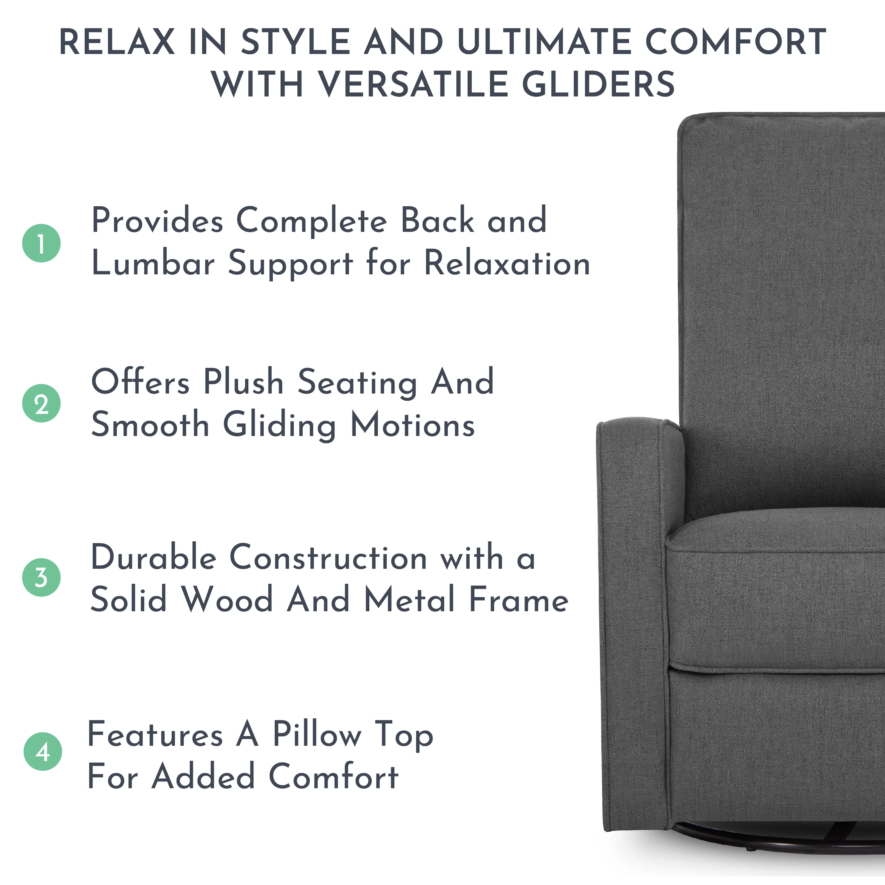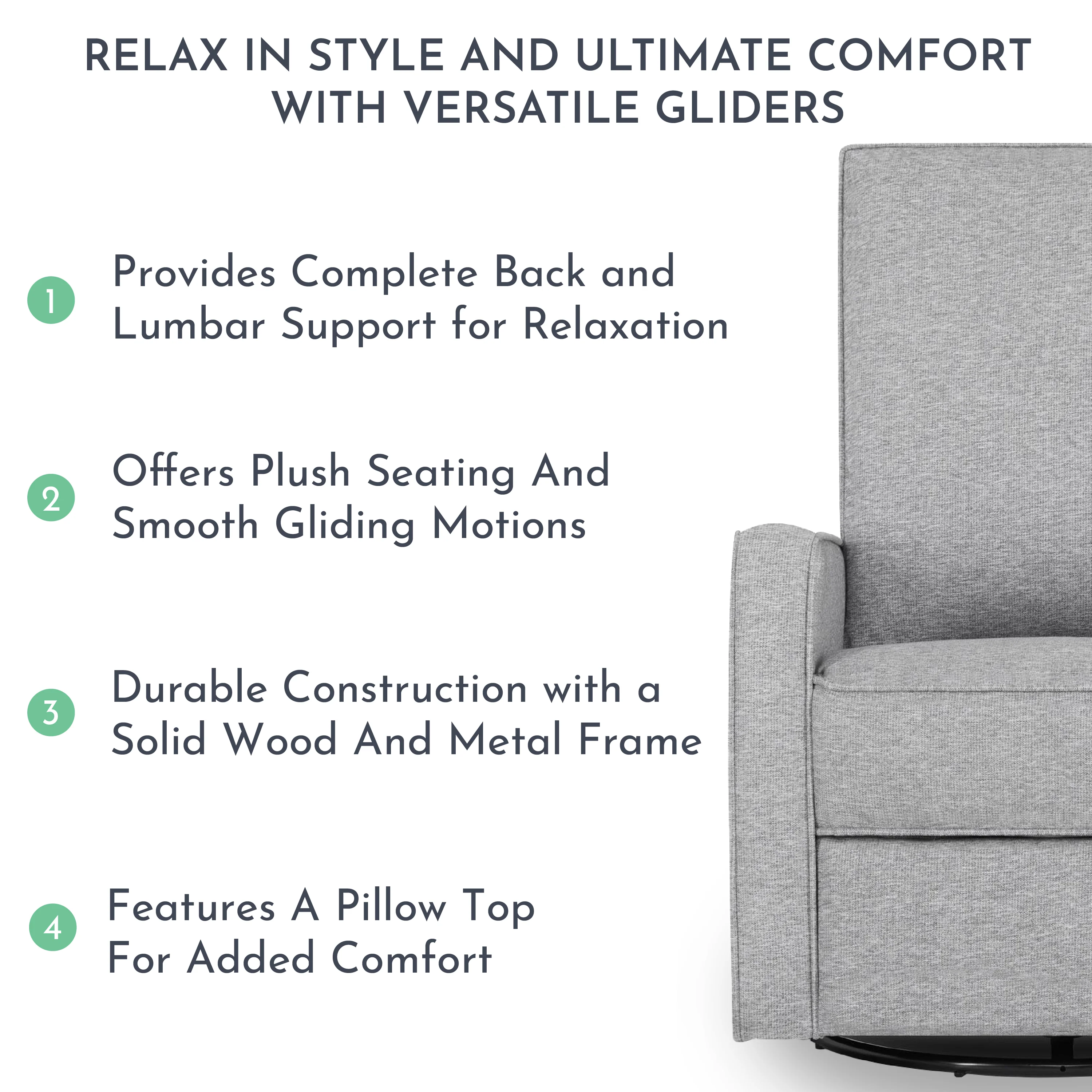 - The Evolur Skye Glider creates comfortable support for your lumbar and boasts a 360° Swivel with a reclining feature for you to relax and unwind. The pillow top provides added comfort.