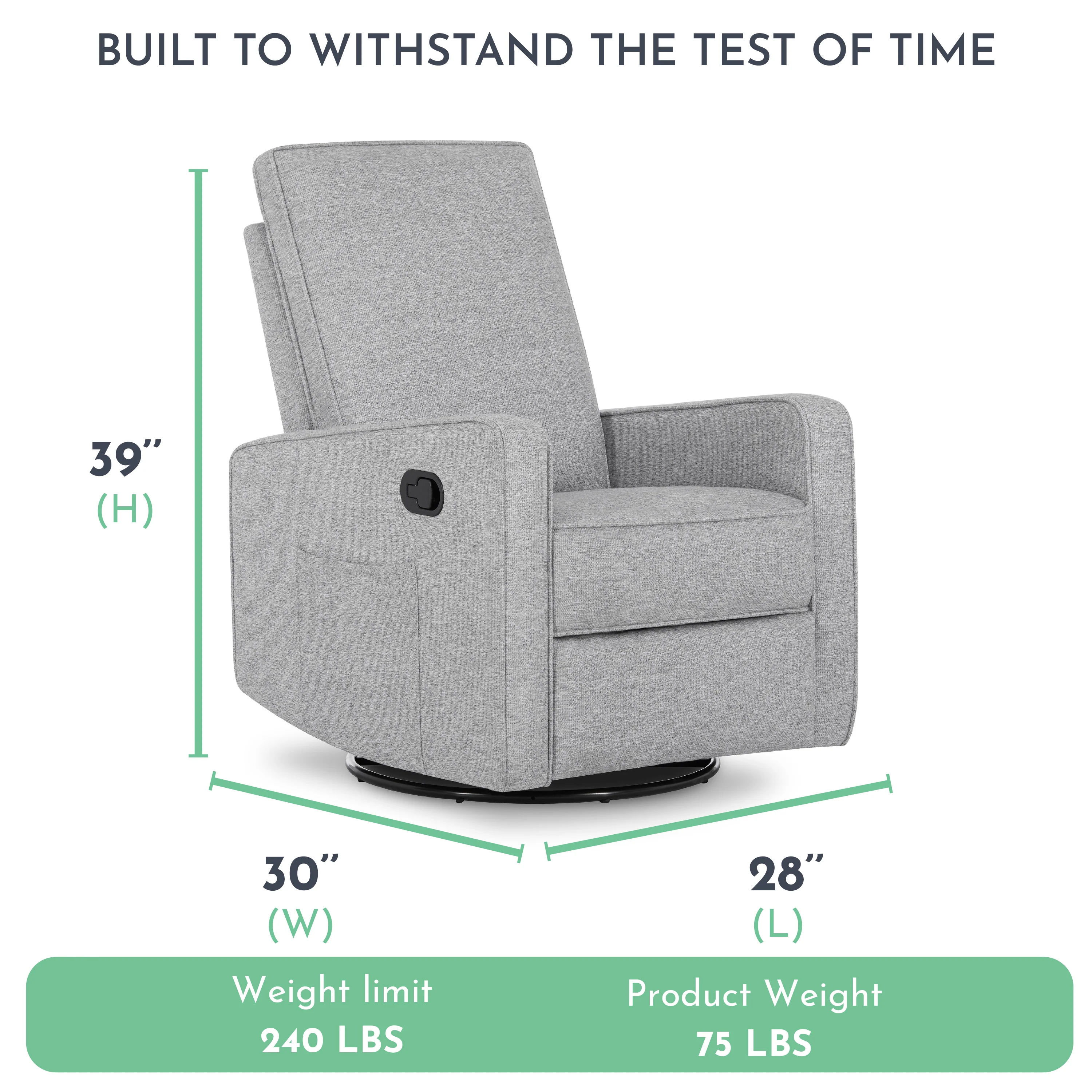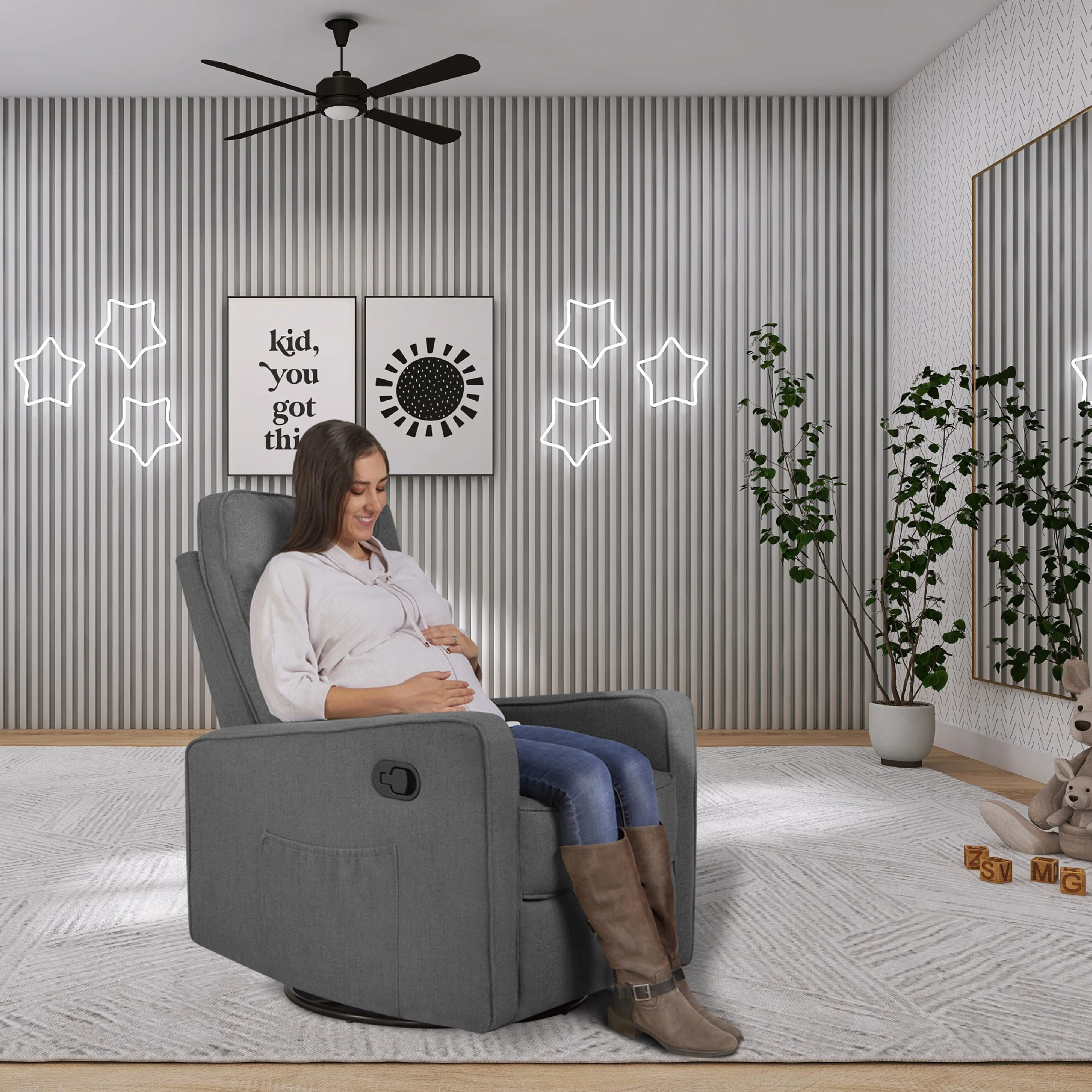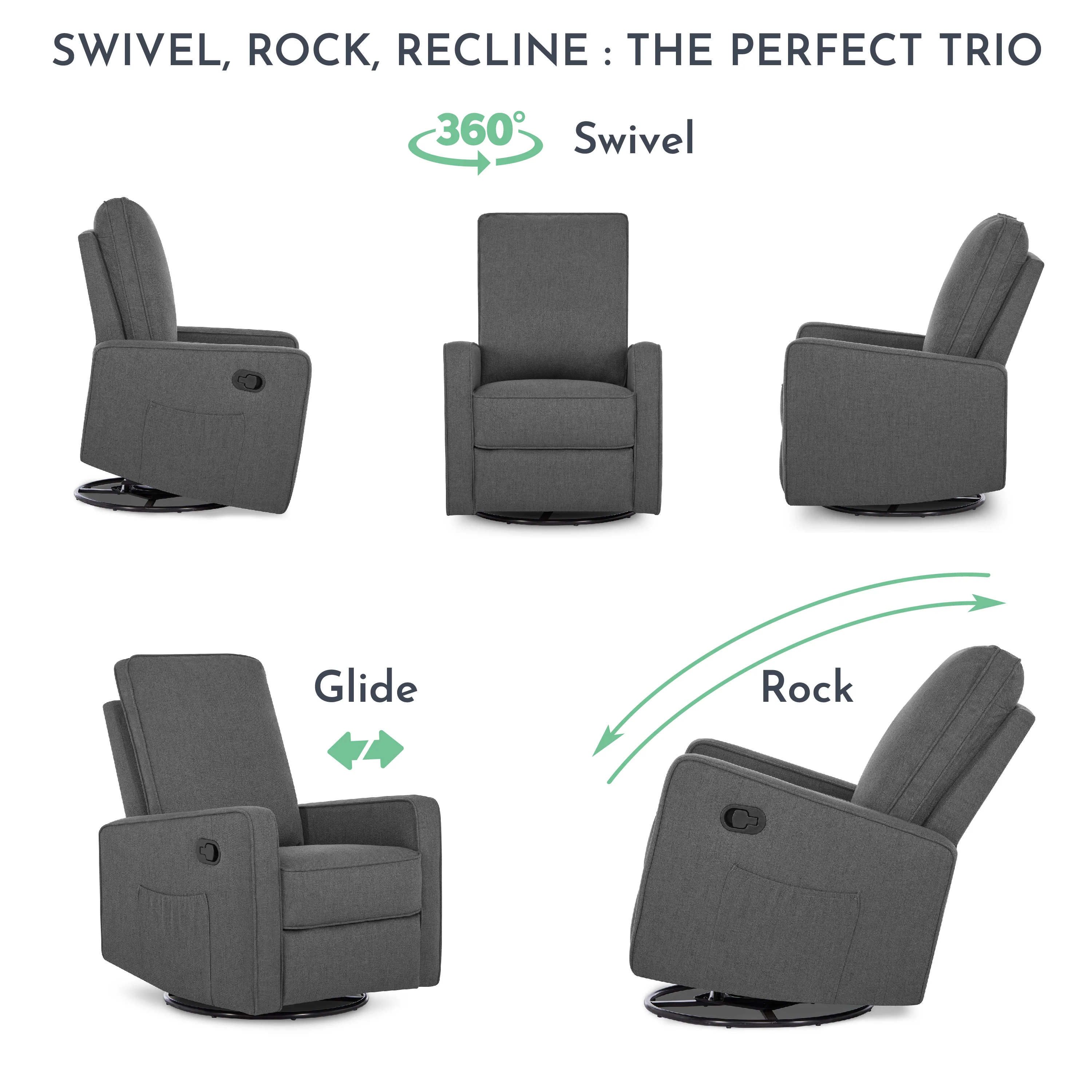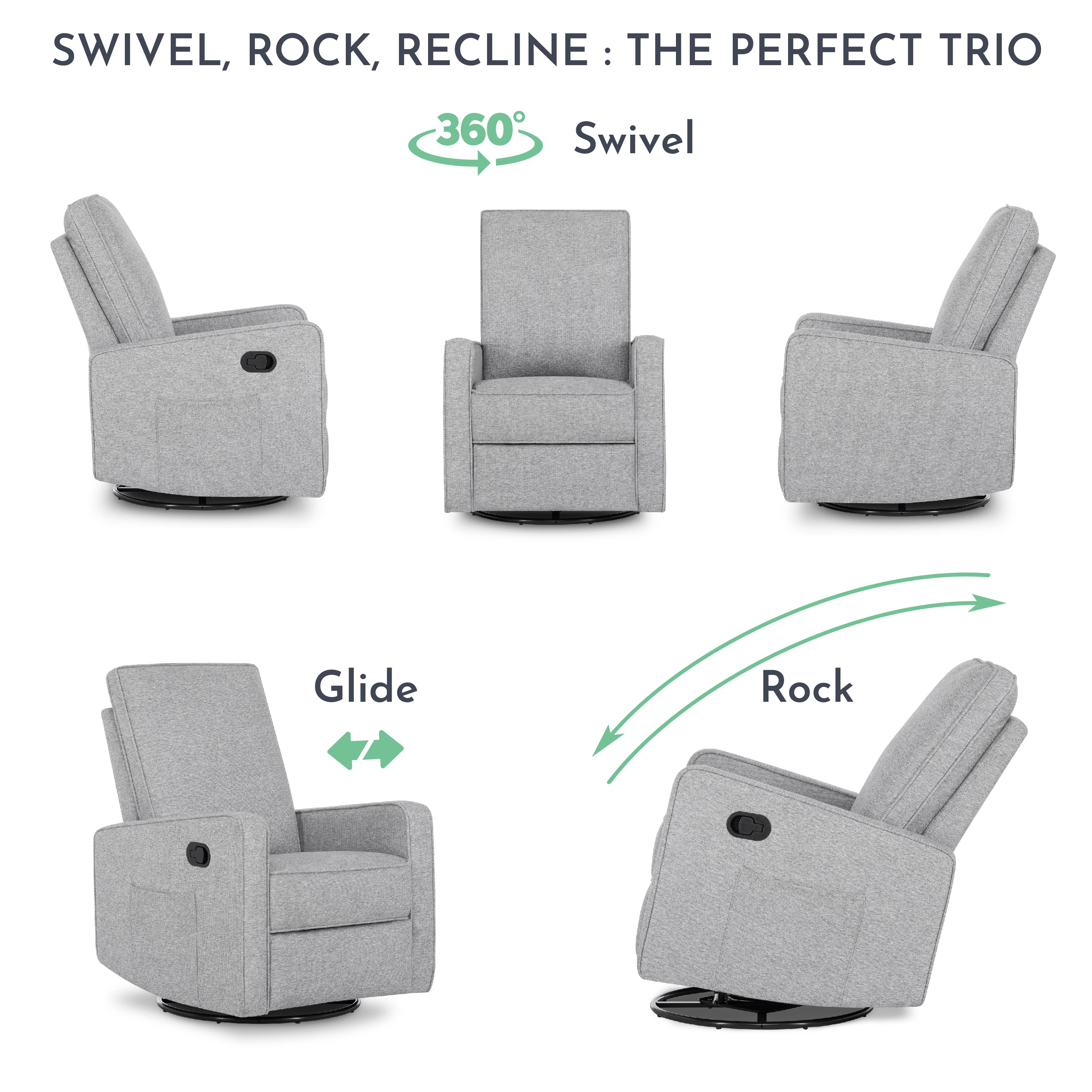 - The Evolur Skye Glider creates comfortable support for your lumbar and boasts a 360° Swivel with a reclining feature for you to relax and unwind. The pillow top provides added comfort.