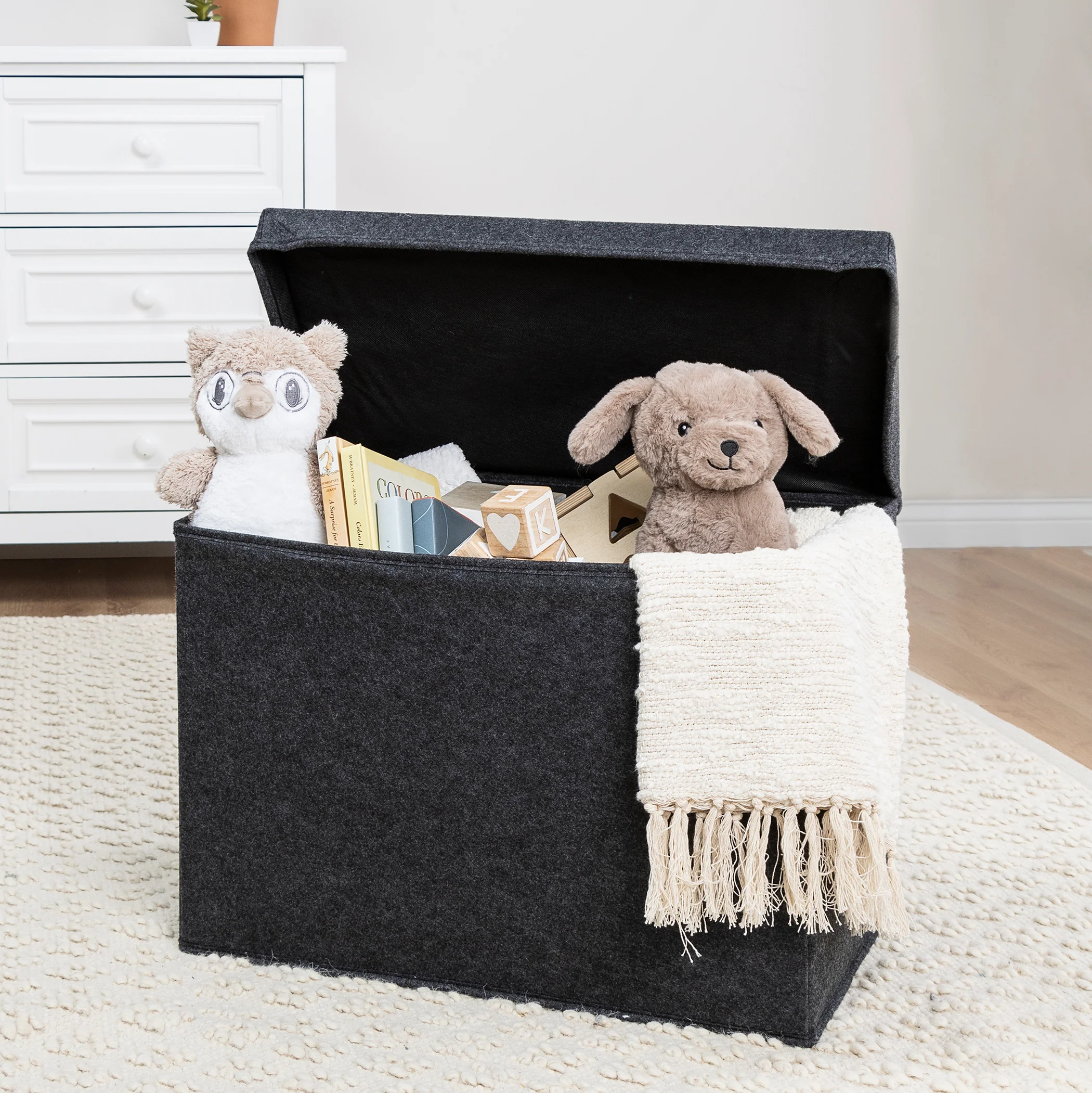 - The toy chest features a solid charcoal gray exterior and inner lining; Sturdy felt handles allow easy transport