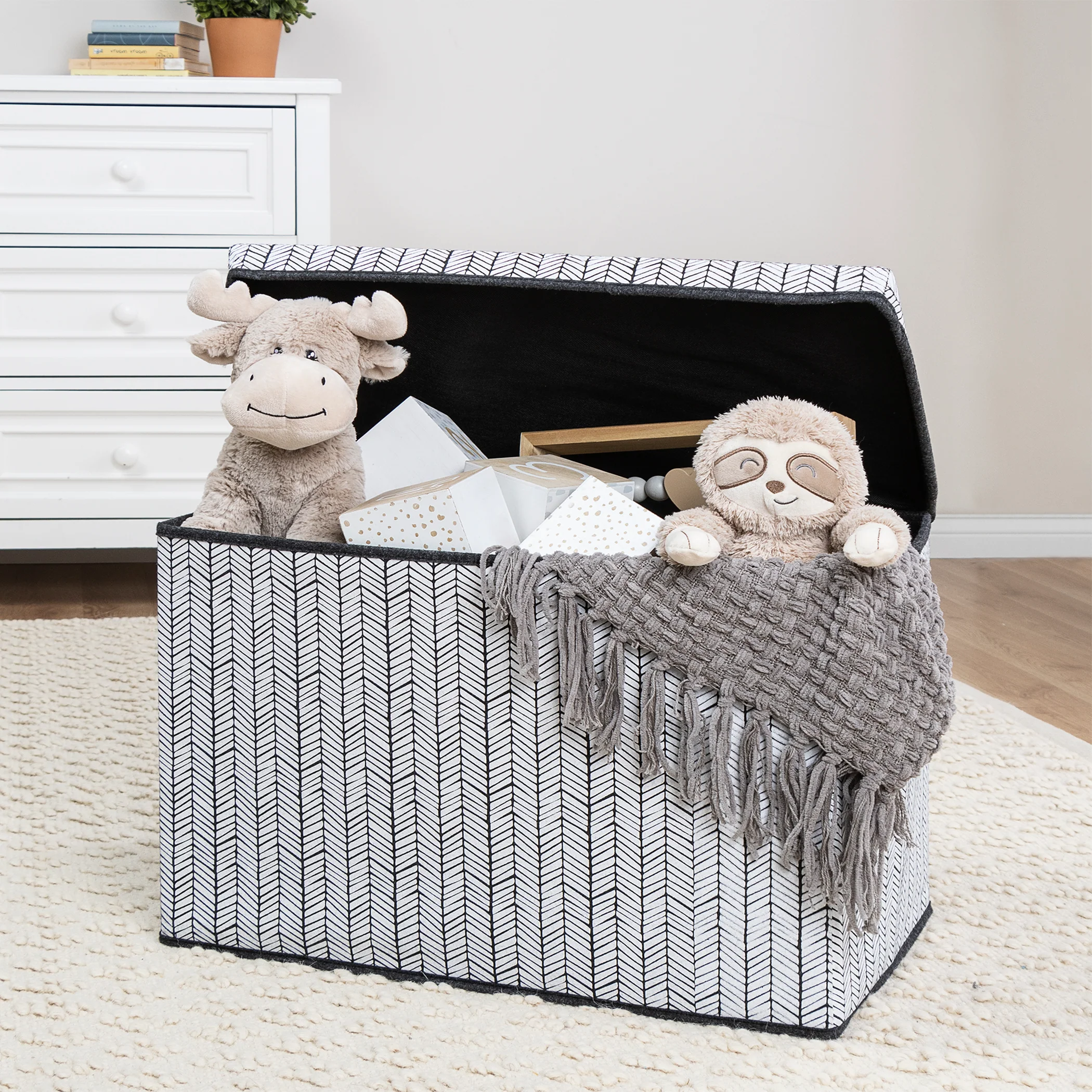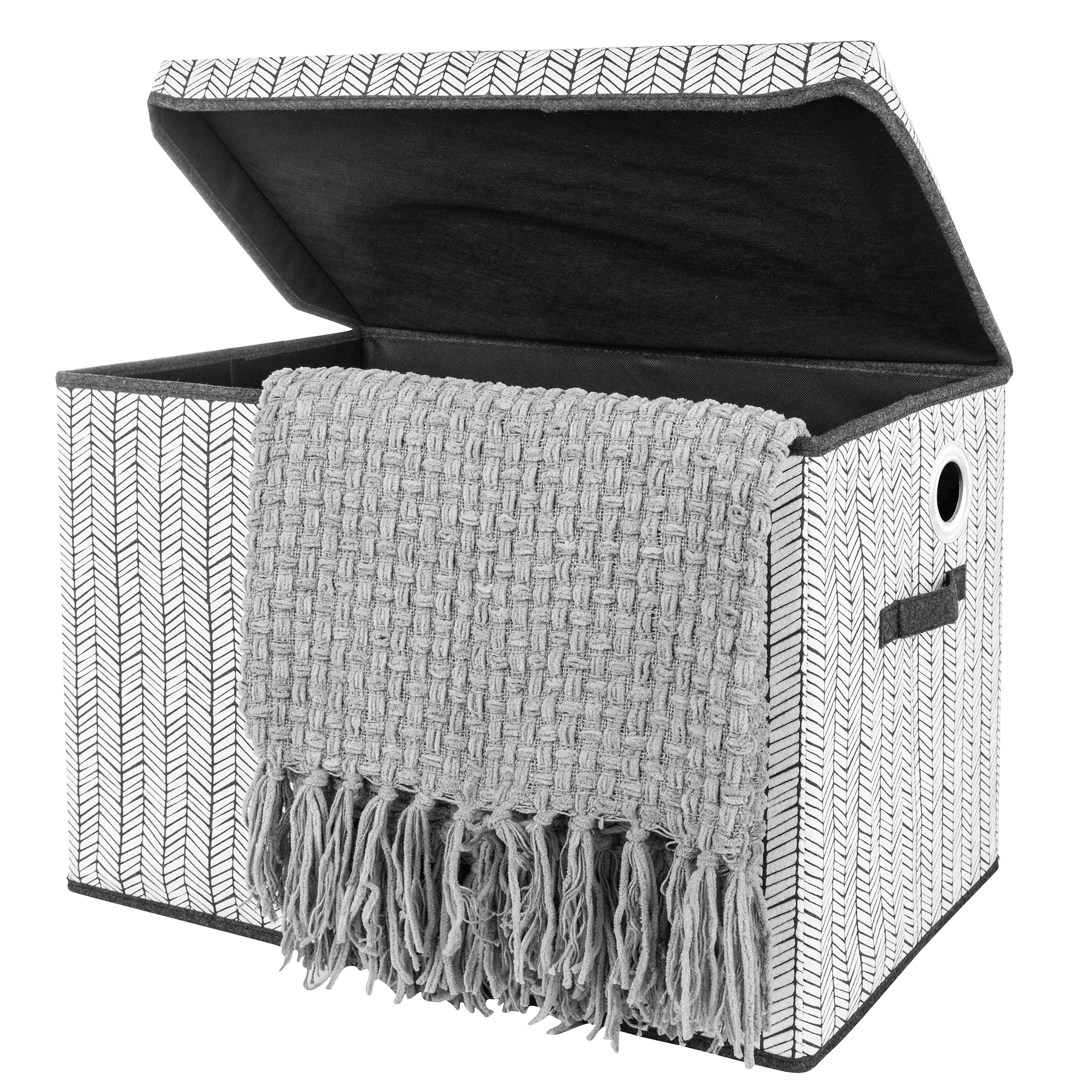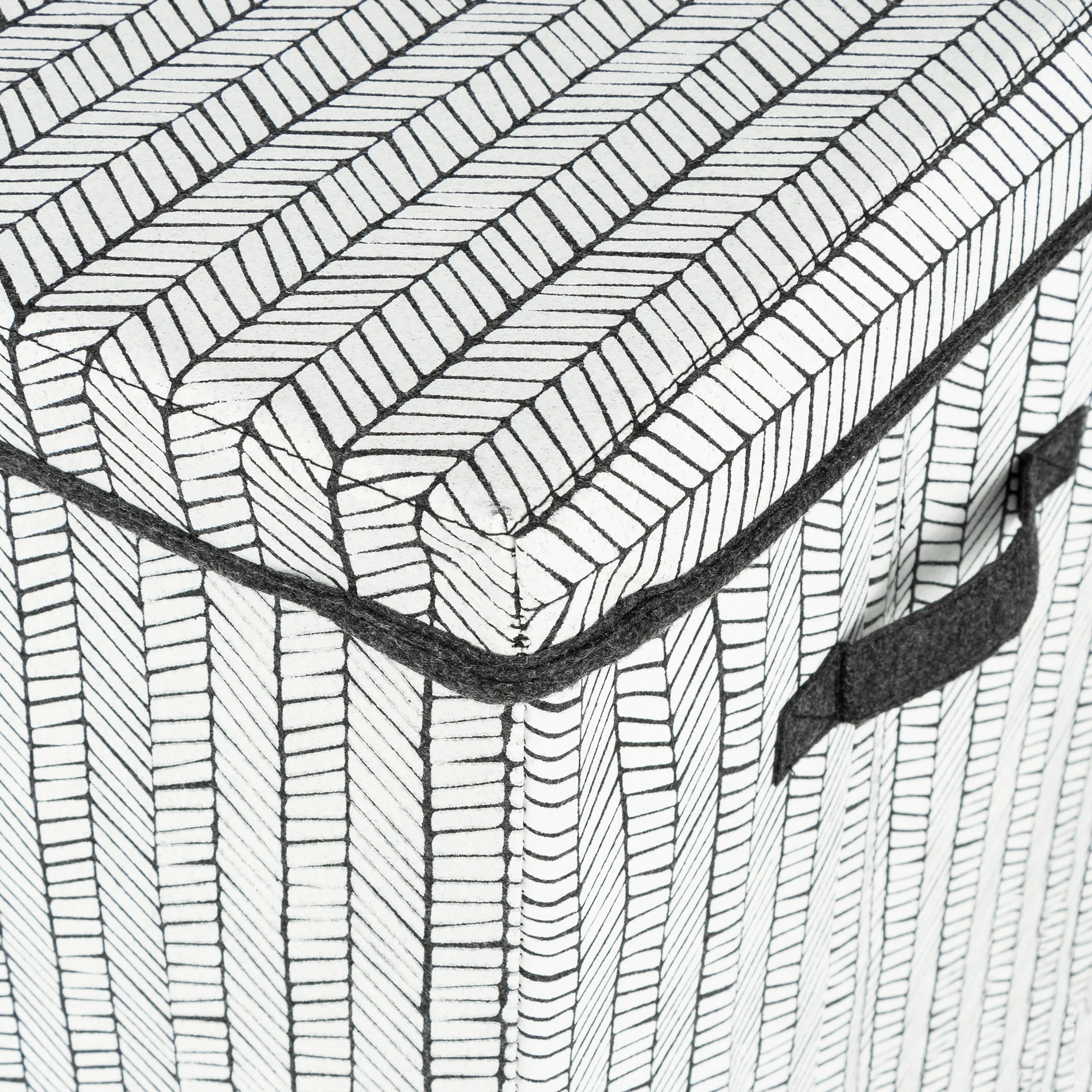 This Gray Herringbone Felt Toy Box by Sammy & Lou is a great multi-purpose storage piece for any living space. This Gray Herringbone Felt Toy Box by Sammy & Lou is a great multi-purpose storage piece for any living space. Multi-purpose storage piece Easily folds for transport or storage The attached hinged lid features a tailored fold-over finish that brings an elevated elegance to this everyday storage bin. The toy box features a white herringbone print design on the exterior and a solid charcoal gray inner lining. 1 compartment.