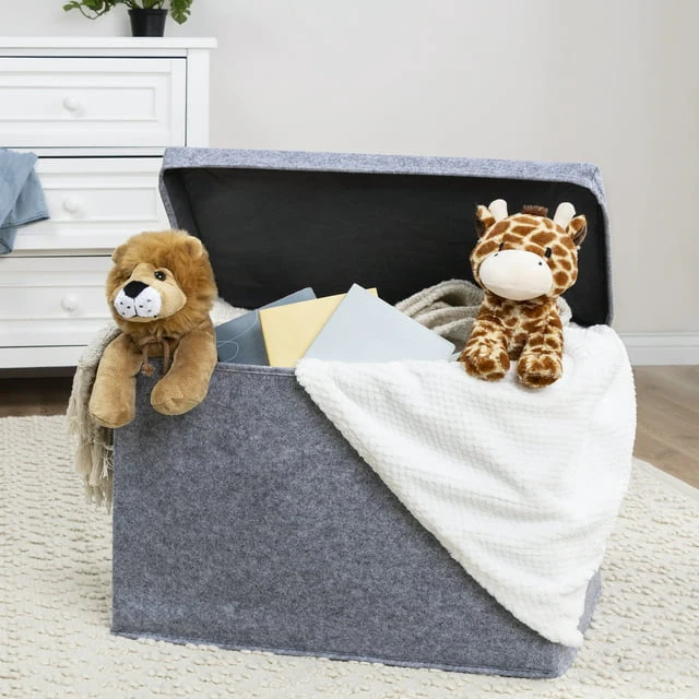 Our Sammy & Lou Light Gray Felt Toy Box is a great multi-purpose storage piece for any living space. Stash toys, books, blankets, clothes and keepsakes in this bin. The attached hinged lid features a tailored fold-over finish that brings an elevated elegance to this everyday storage bin. The toy box features a solid light gray exterior and inner lining. Perfect for infant and toddler rooms.