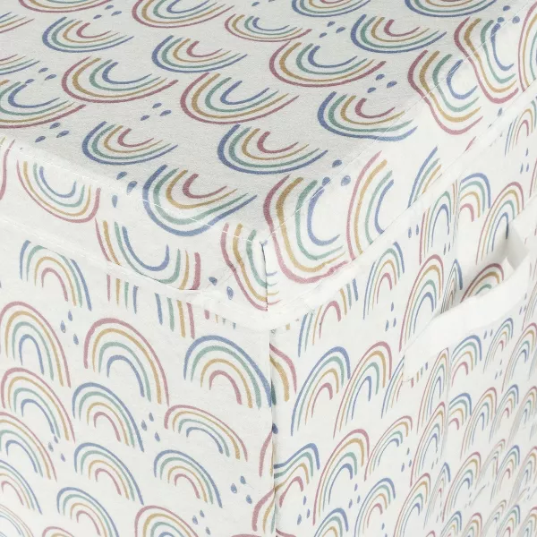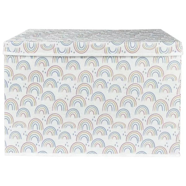 Our Painted Rainbow Felt Toy Box is a great multi-purpose storage piece for any living space. Stash toys, books, blankets, clothes and keepsakes in this bin. The attached hinged lid features a tailored fold-over finish that brings an elevated elegance to this everyday storage bin. The toy box features a pink, yellow, teal, and blue rainbow with blue raindrops print on the exterior and a solid Gray inner lining. Coordinating accessories and room décor by Sammy and Lou are available and sold separately.