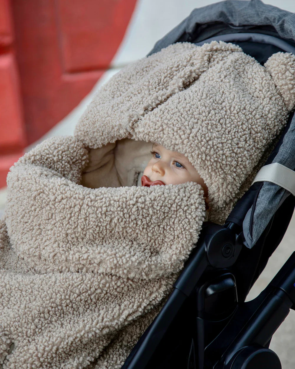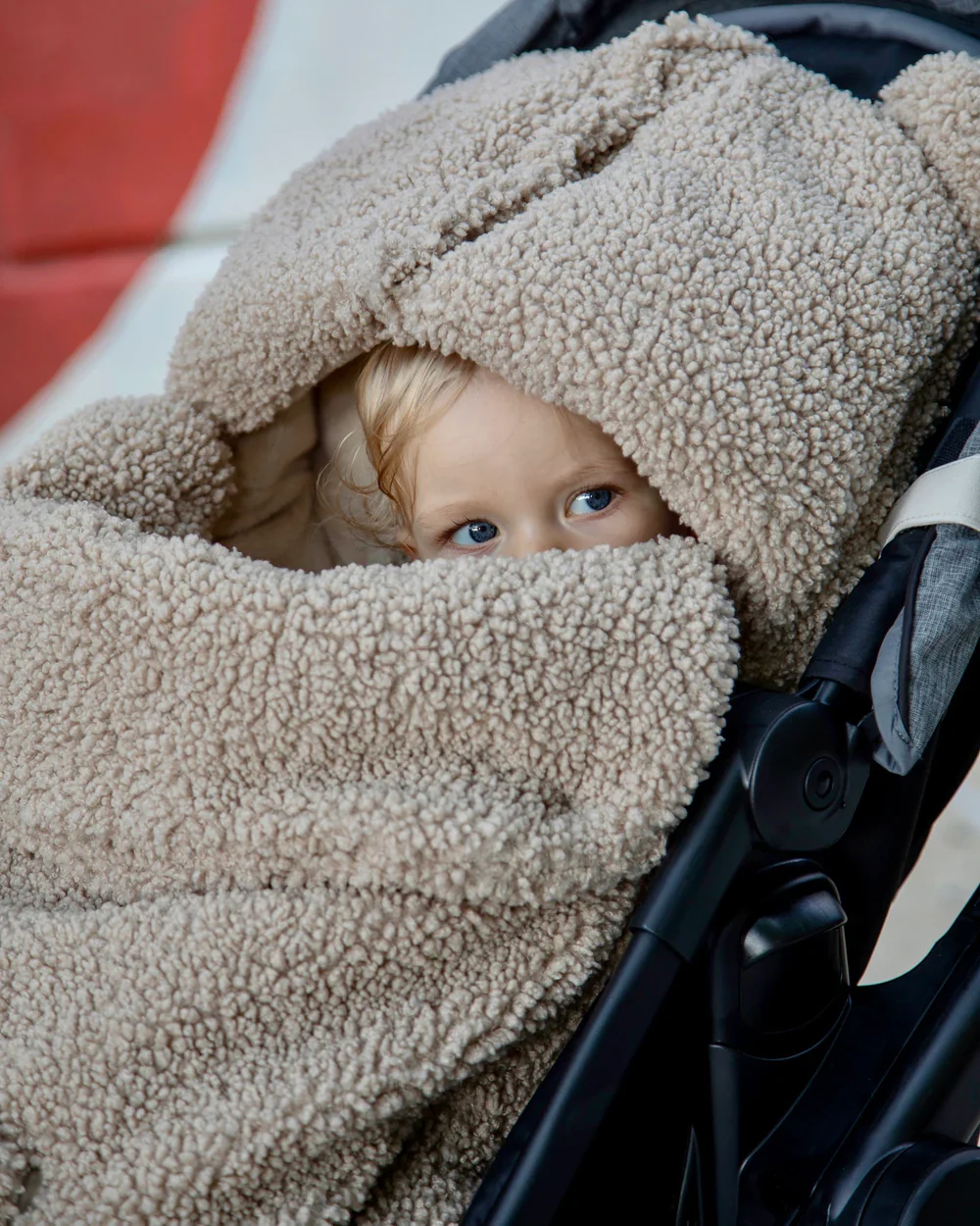 - Front flap can be pulled up and fastened to hood to protect child��s face from the elements
