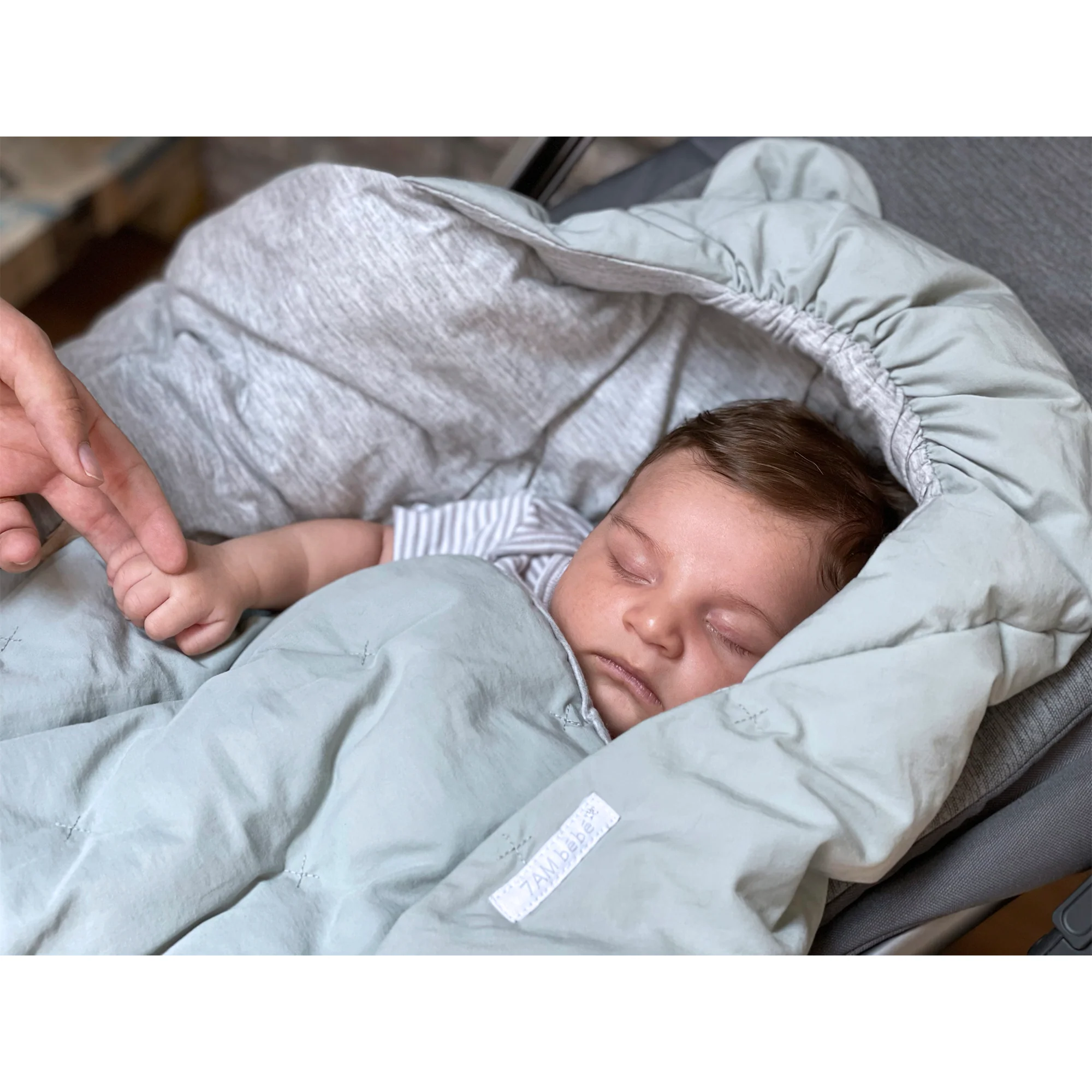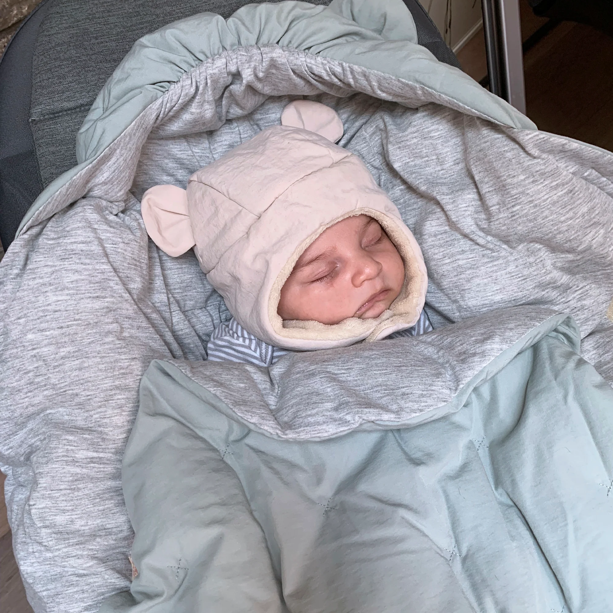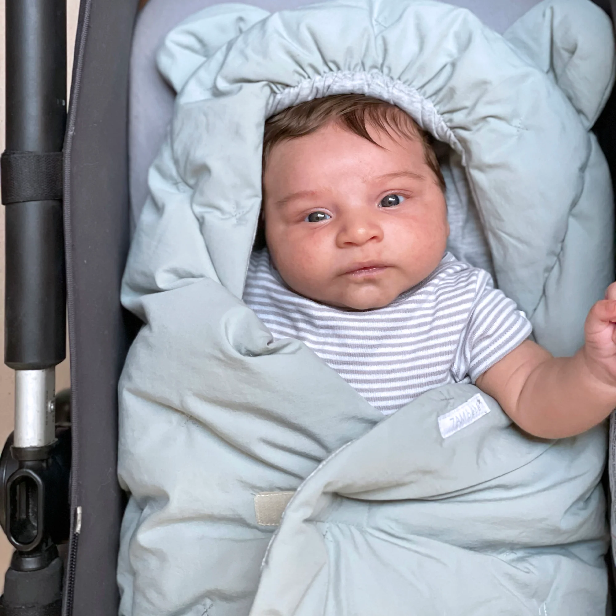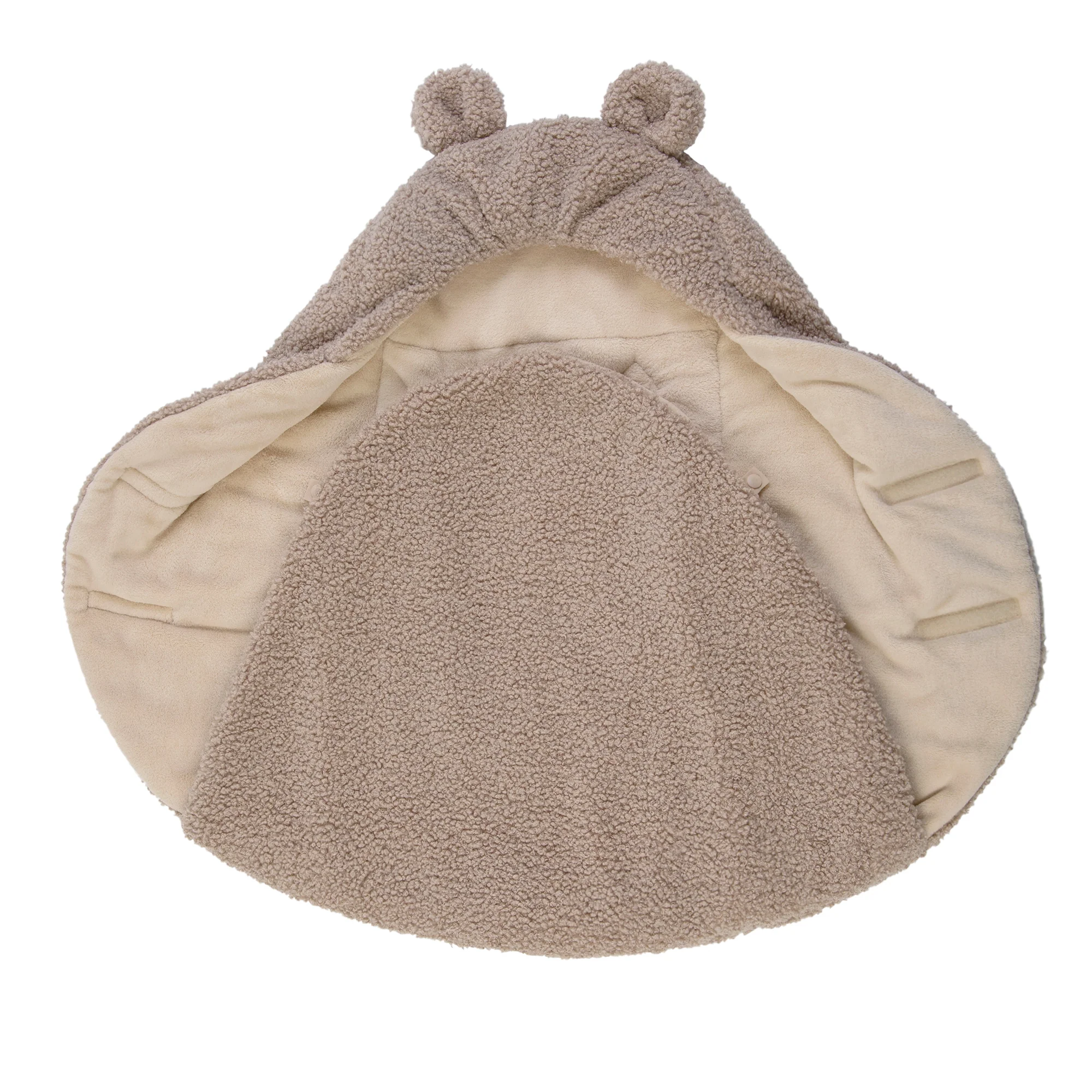 Like a nest, the 7AM Enfant Nido Bebe Infant Wrap is designed as an easy, safe, and cozy sweatshirt-like wrap for baby's first 6 months. The 3 folding flaps and uni-leg muff replace the need for over-bundling.