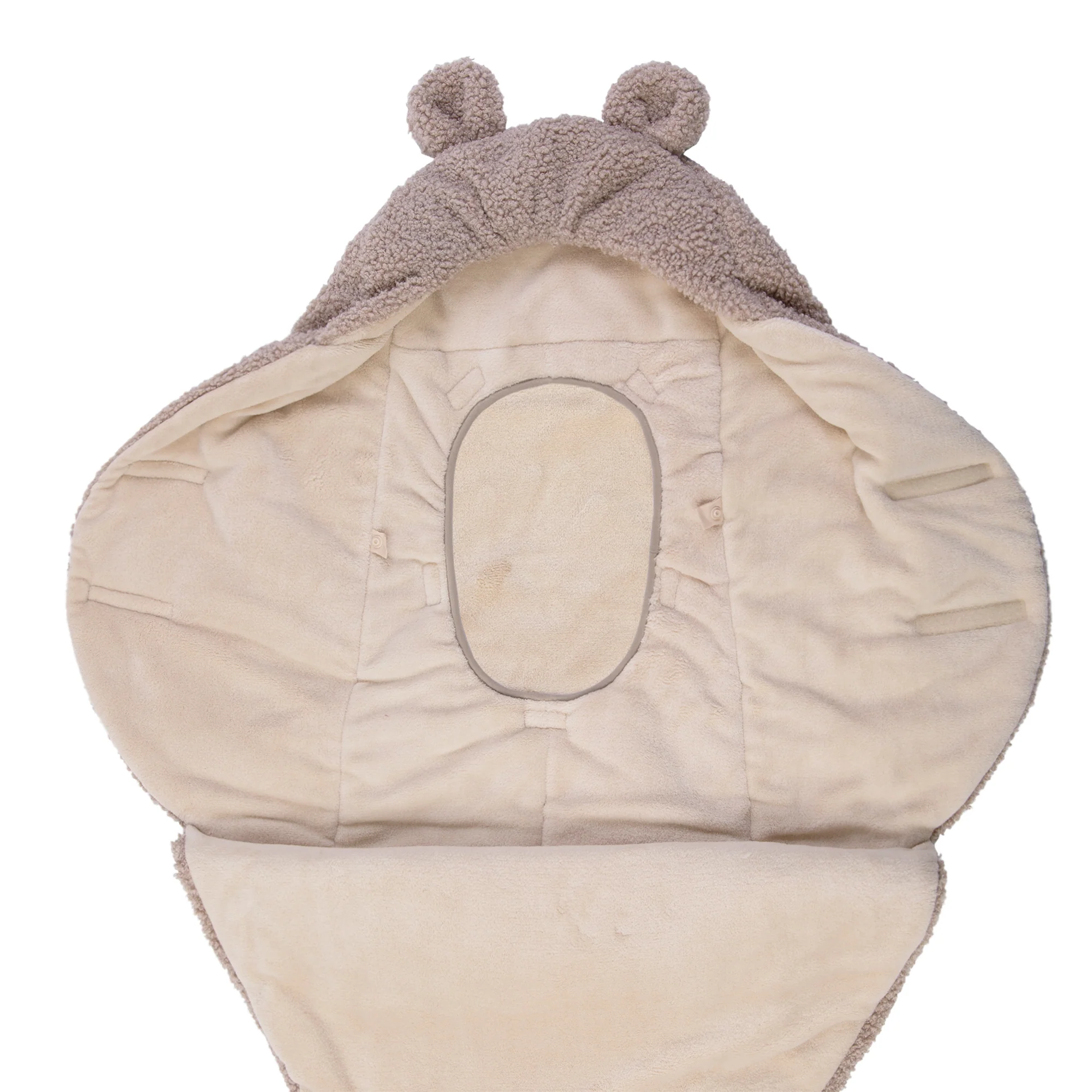 - Horizontal shoulder zippers for uncovering baby's head
