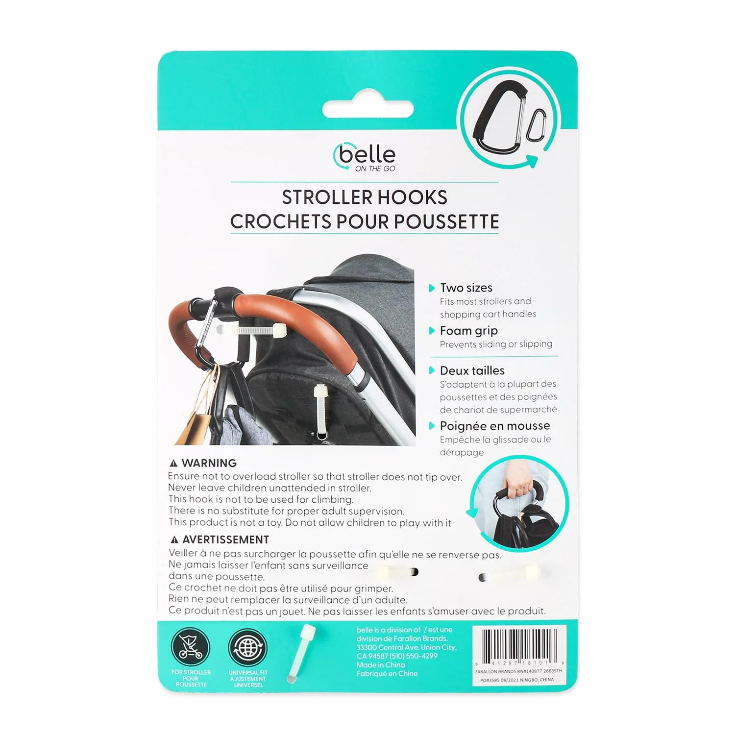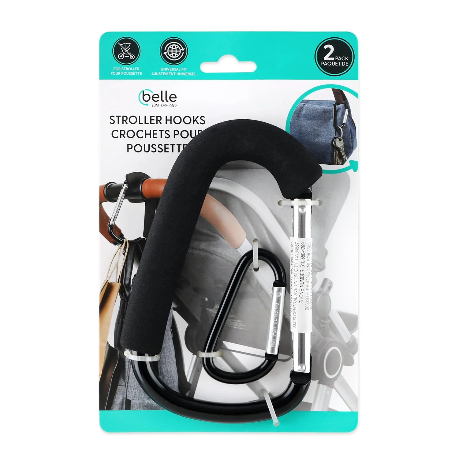 Use these Stroller Hooks from Belle ON THE GO to hold a diaper bag, shopping totes, or anything that you need to bring with you, but don't want to carry. The set of 2 hooks are different sizes to handle big and small bags.