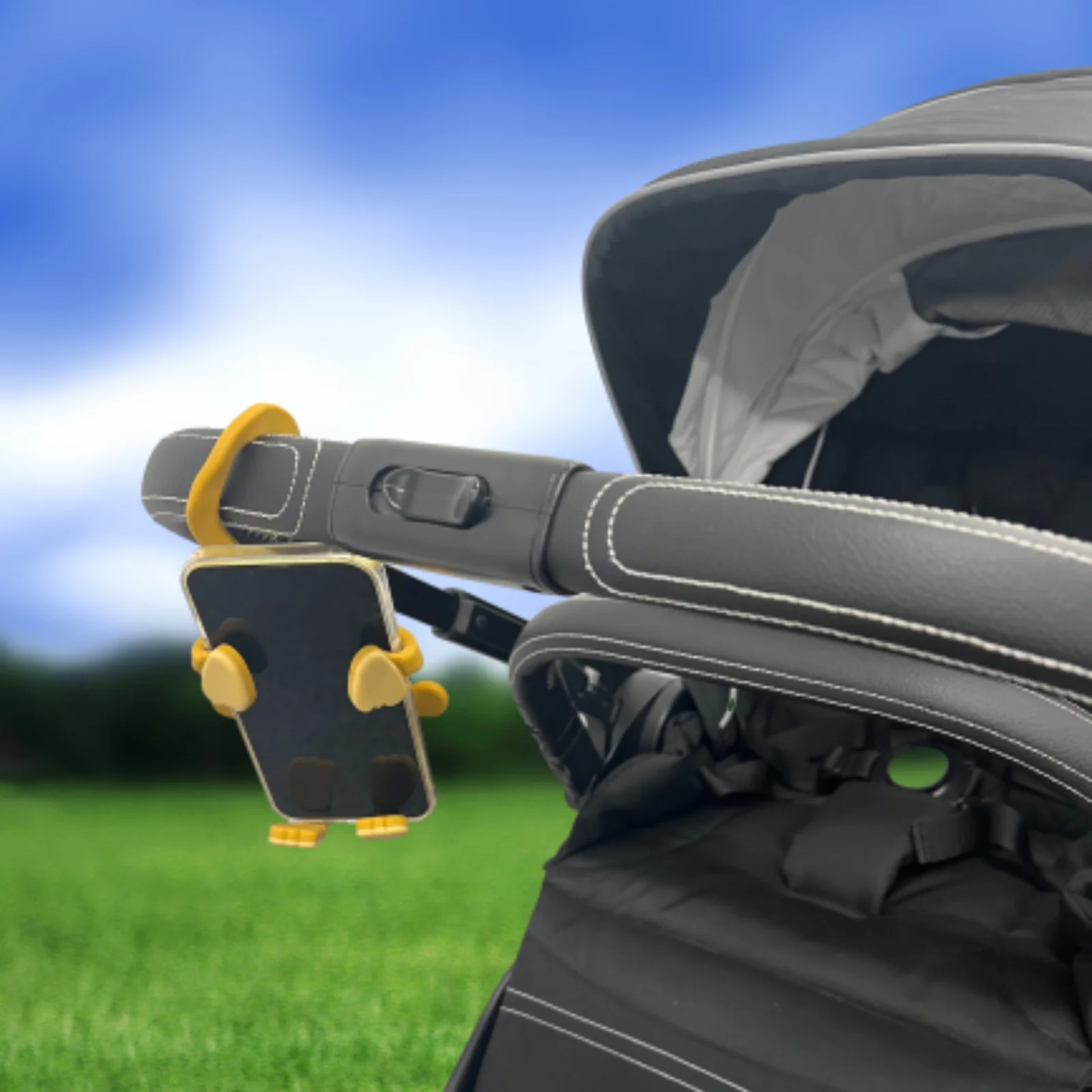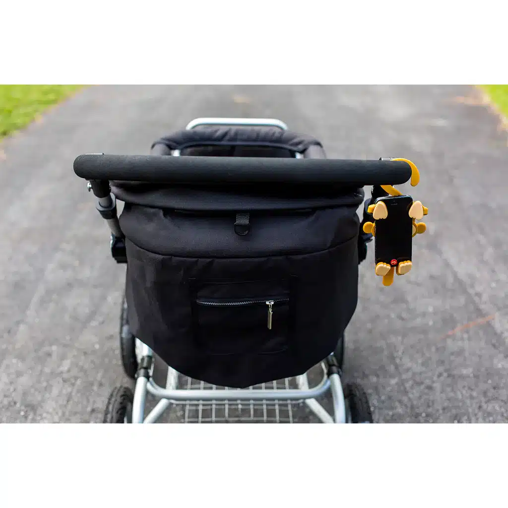 - Easily grips to any stroller crossbar and hangs on tightly while walking or running