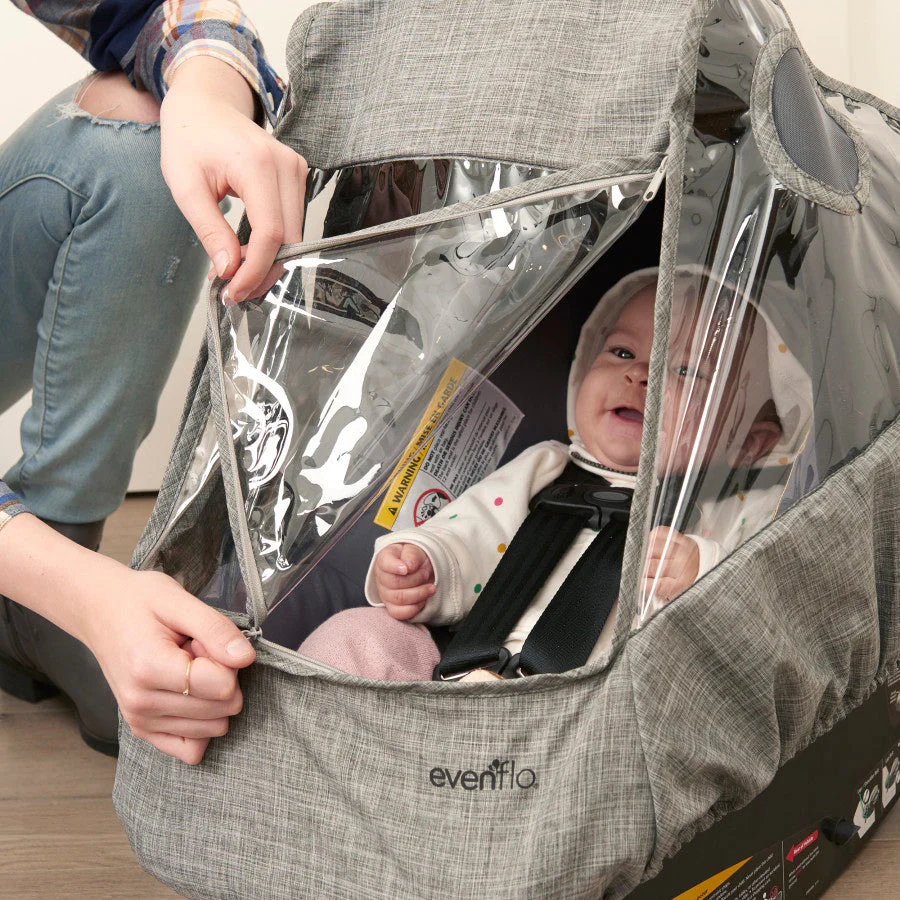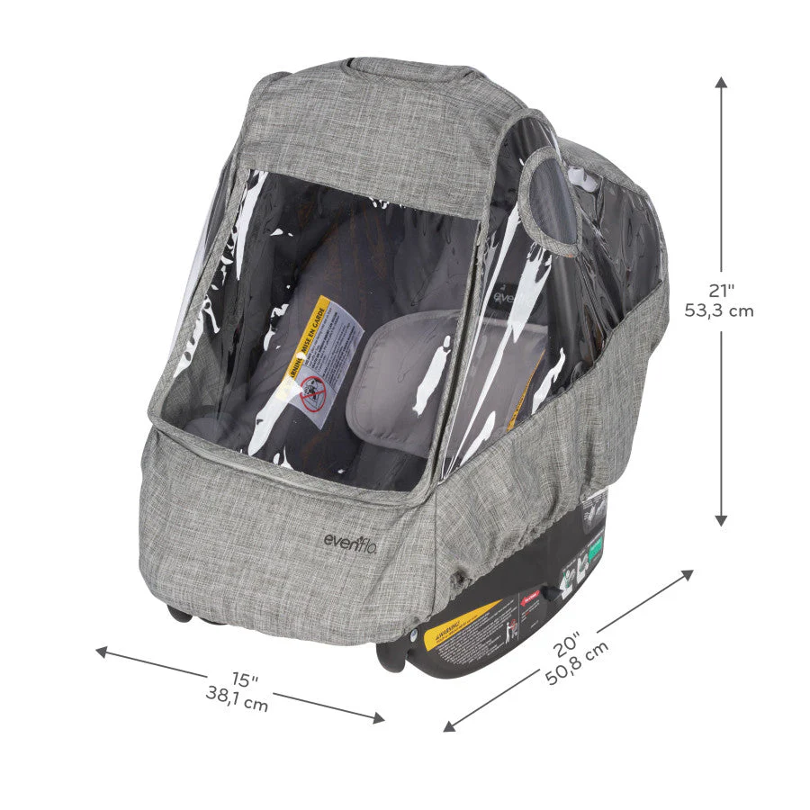 Protect your child from the rain, wind and other outdoor elements with the Even铿�o庐 Infant Car Seat Weather Shield/Rain Cover. The universal size 铿�ts all Even铿�o infant car seats. Mesh side holes offer ventilation for your child and the Velcro庐 closure top 铿�ap opens for access to the infant seat handle. The clear front window allows you to clearly see your child, and has a zippered opening to access your child if needed. Elastic edges easily stretch around the bottom of the infant seat for quick installation. High quality materials are easy to wipe clean, ensure durability and eliminate shrinking.