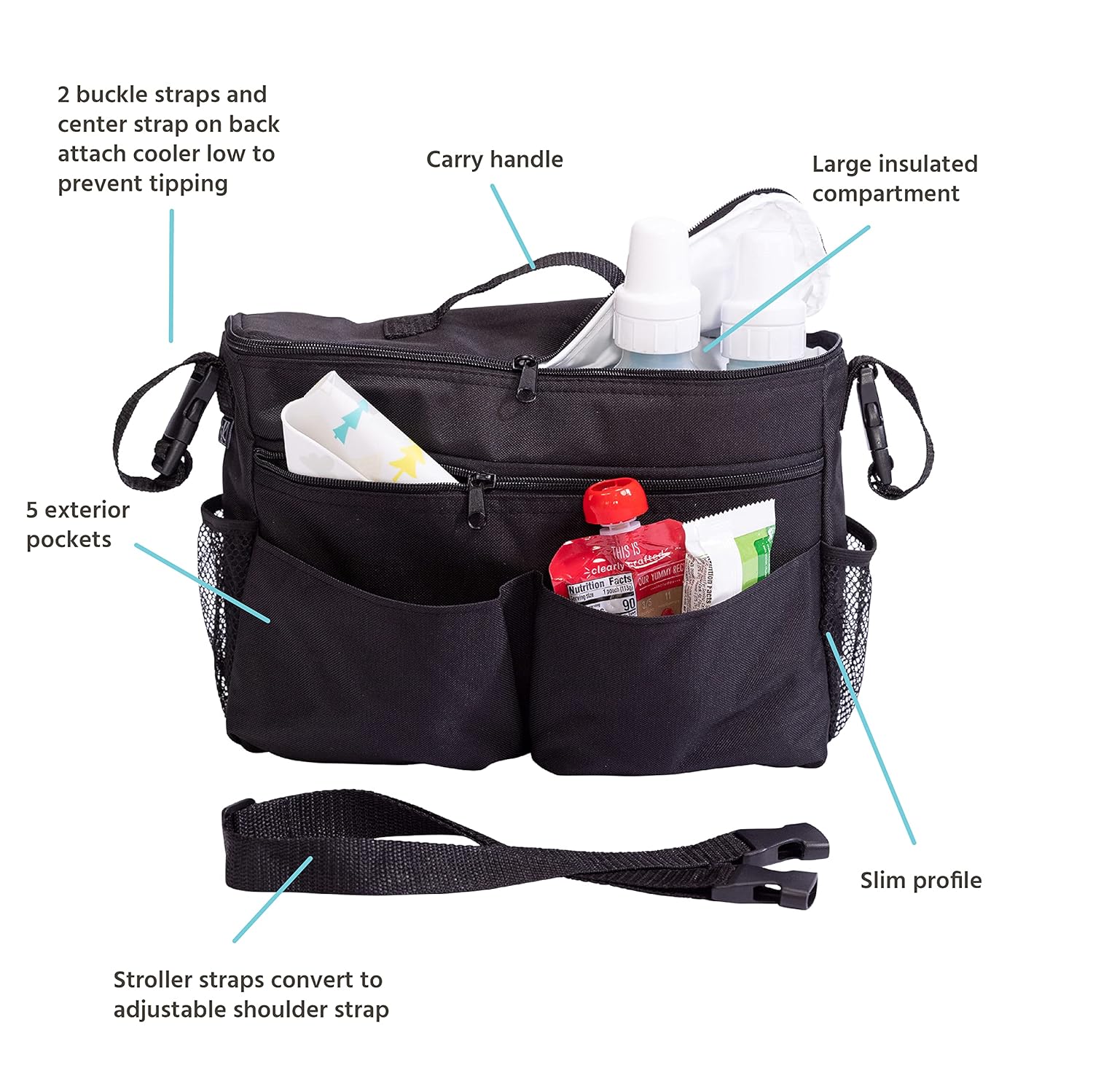 Save money by bringing family snacks and meals with you in the fully insulated Cool ��N Cargo Stroller Cooler! This soft cooler bag is specially designed to attach to your stroller and features a large insulated compartment and convenient pockets to carry and organize bottles, sippy cups, juice boxes, food jars, personal items and more. The Stroller Cooler features 2 adjustable buckle straps and a center Velcro strap that securely attach the cooler to a stroller��s basket or side bars. Specially designed to attach low on the stroller, the Stroller Cooler provides safe weight distribution to prevent tipping. A webbing strap on top of the cooler assists in lifting the cooler off the stroller. An adjustable, detachable strap allows you to conveniently carry the Stroller Cooler over your shoulder. One long exterior zippered pocket, two deep front pockets and 2 side mesh pockets allow you to organize and conveniently access sippy cups, keys, pacifiers, camera and more. The Stroller Cooler is also multi-functionally designed for use as a diaper bag.