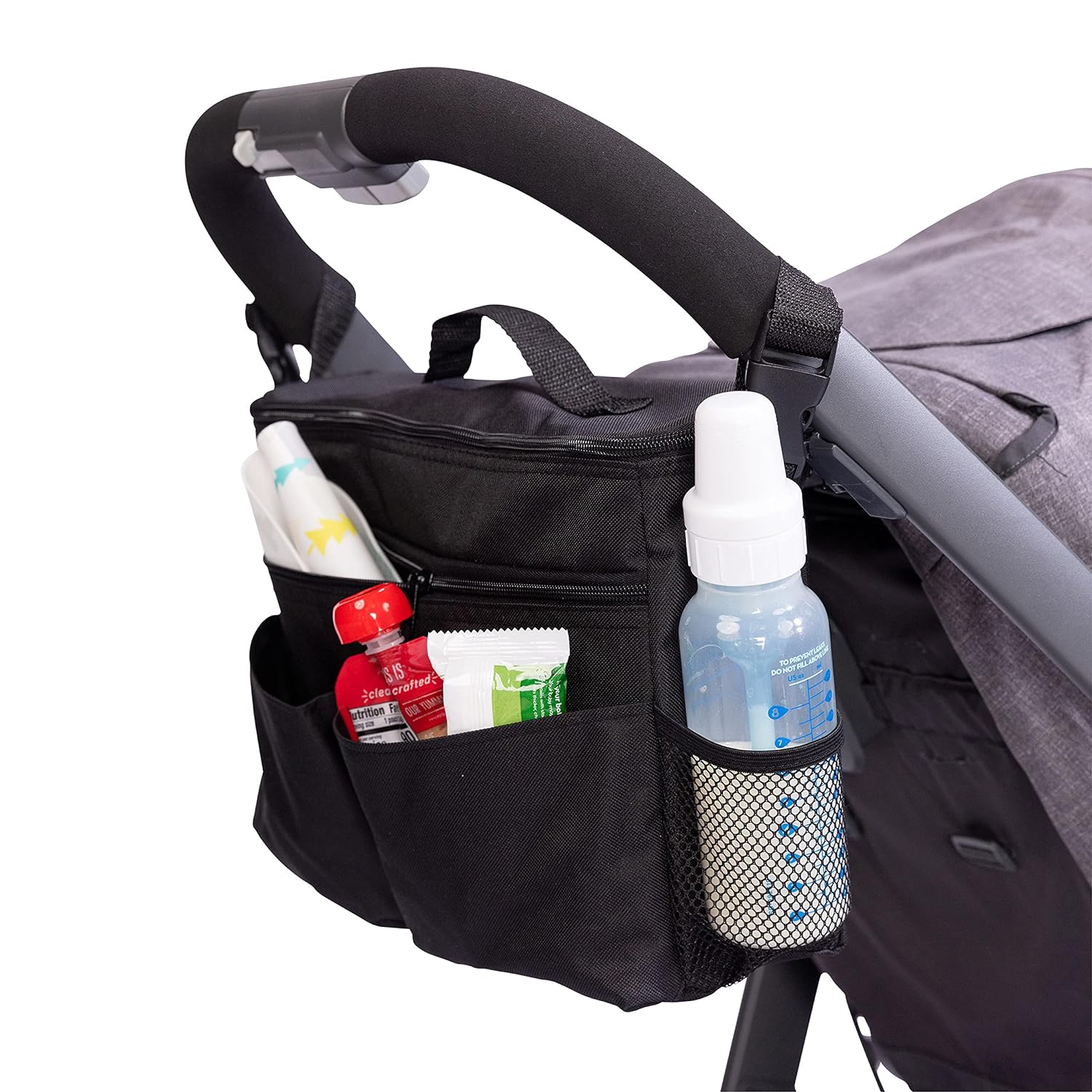 - Large insulated compartment and convenient pockets to carry and organize bottles, sippy cups, juice boxes, food jars, personal items and more