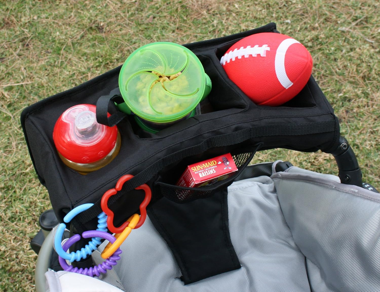 - The Food ��N Fun Toddler Tray securely attaches over the stroller front bar with a heavy-duty non-slip, hook & loop strap. The tray is functionally designed to keep toddler��s needs organized & within reach. Plenty of pockets, compartments and loops hold cups, snacks, and toys. A no-throw strap attaches to cup handles to prevent dropping and the tray��s high-density foam construction provides rigidity. TIP: For best results, position the tray ON TOP of the stroller bar, tightly wrap the non-slip material around the stroller bar and attach the hook and loop. When an item is placed inside, the tray will rotate forward into position.