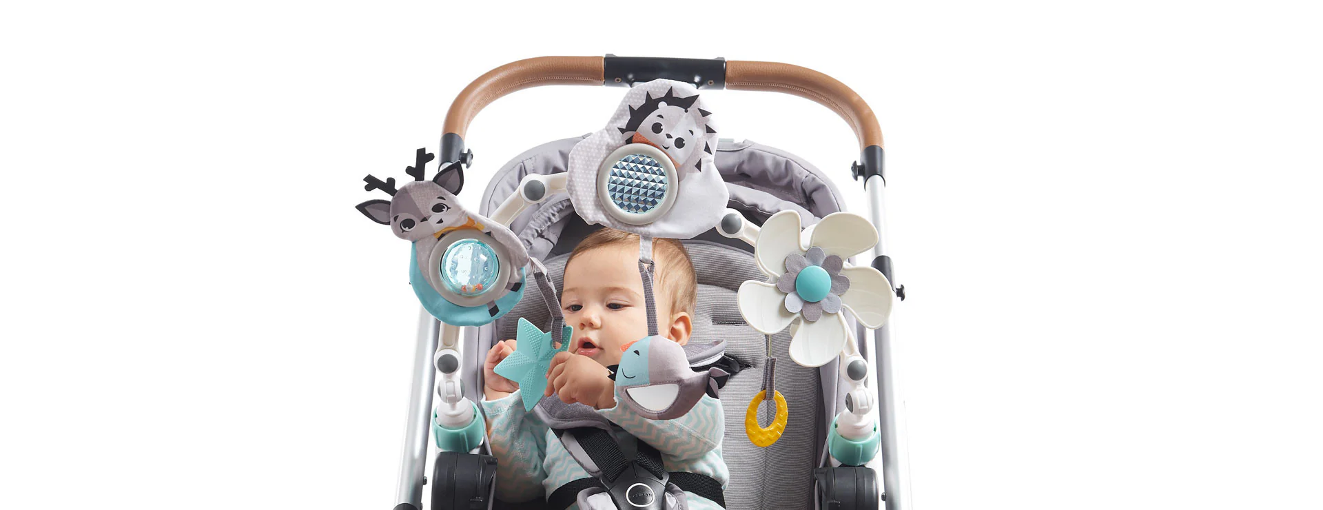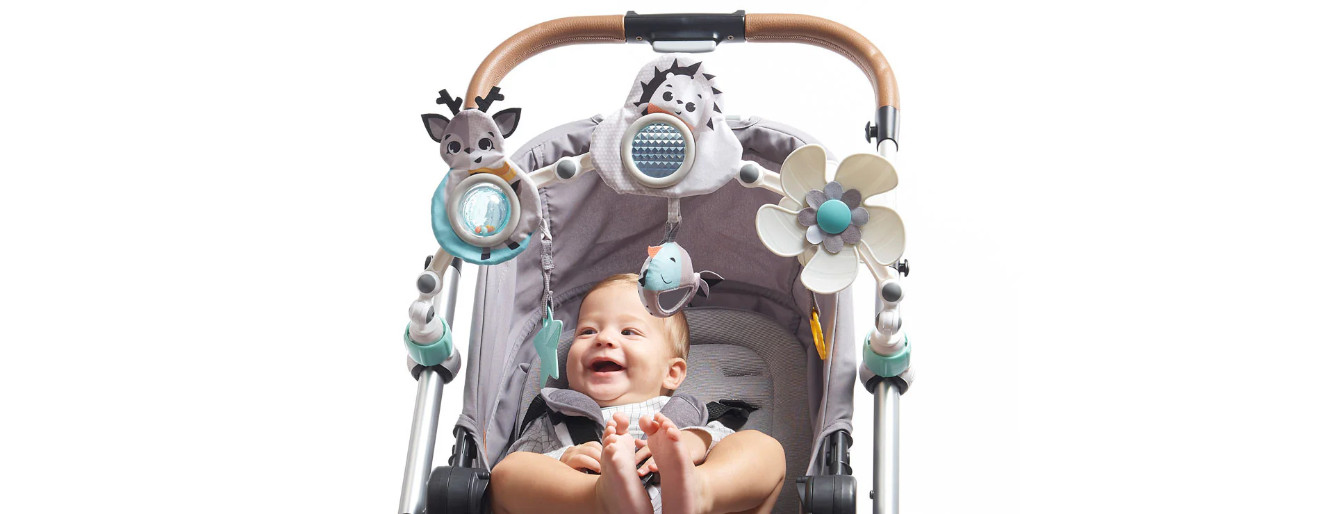 - Flexible stroller arch features a variety of colorful dangling toys and a mirror to keep your little one entertained