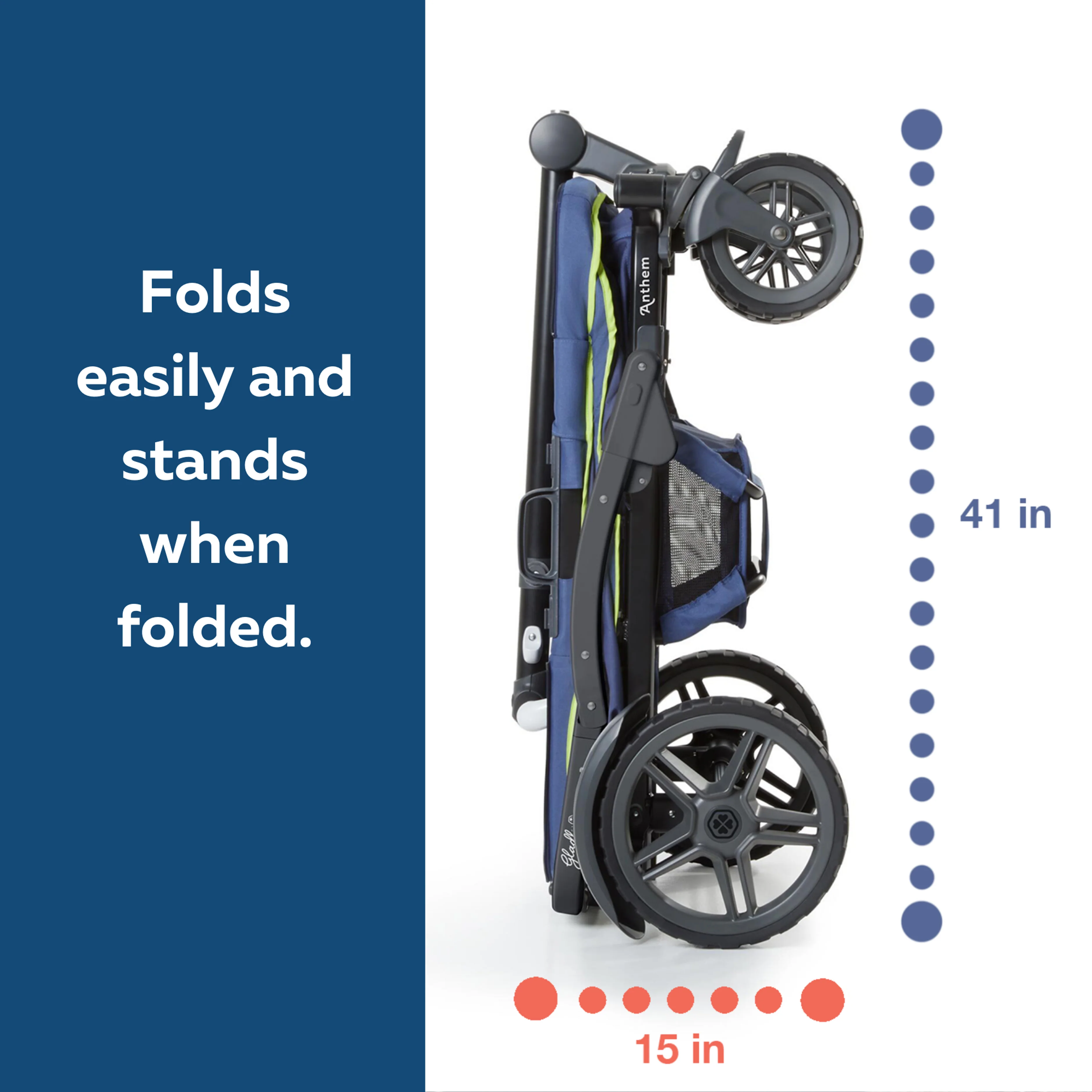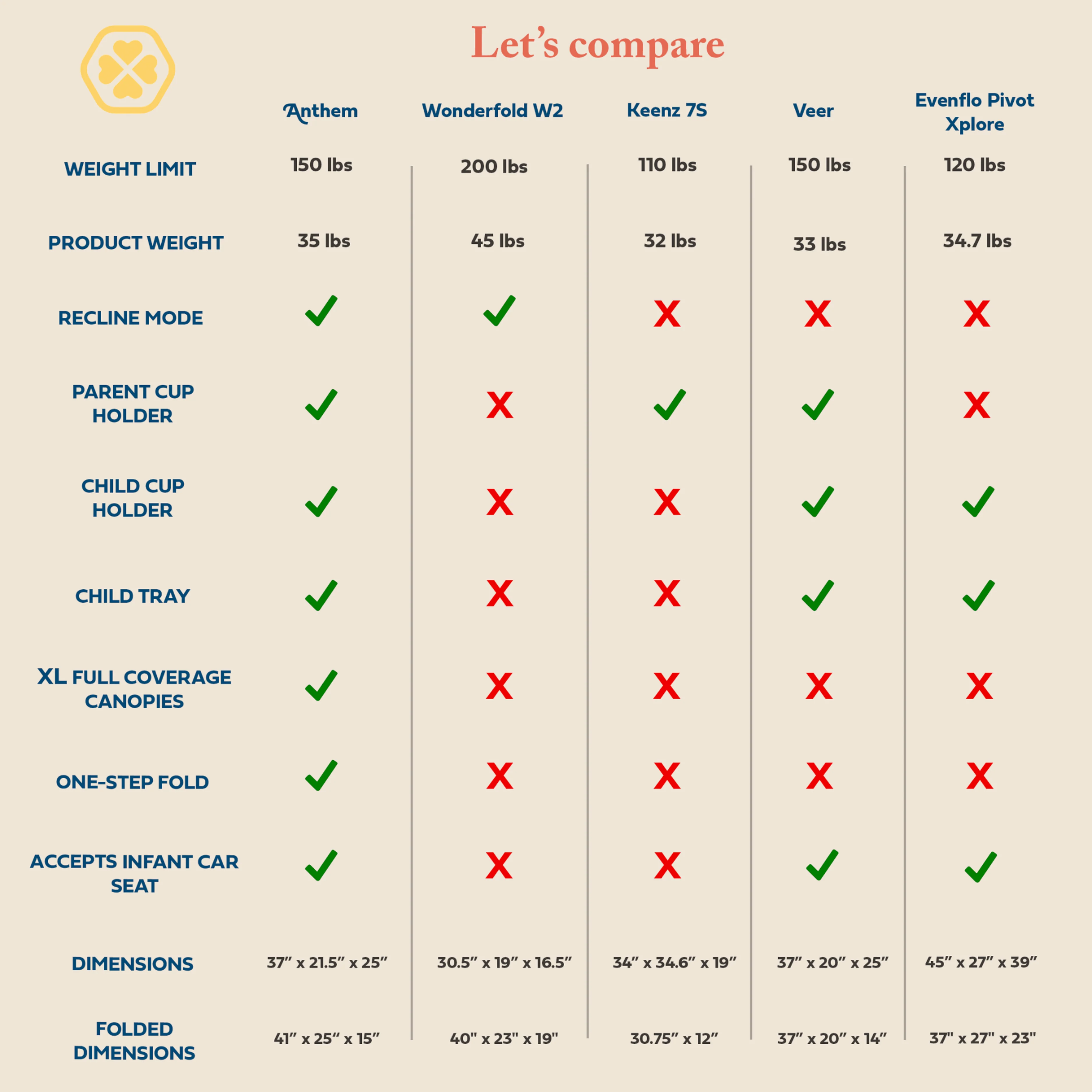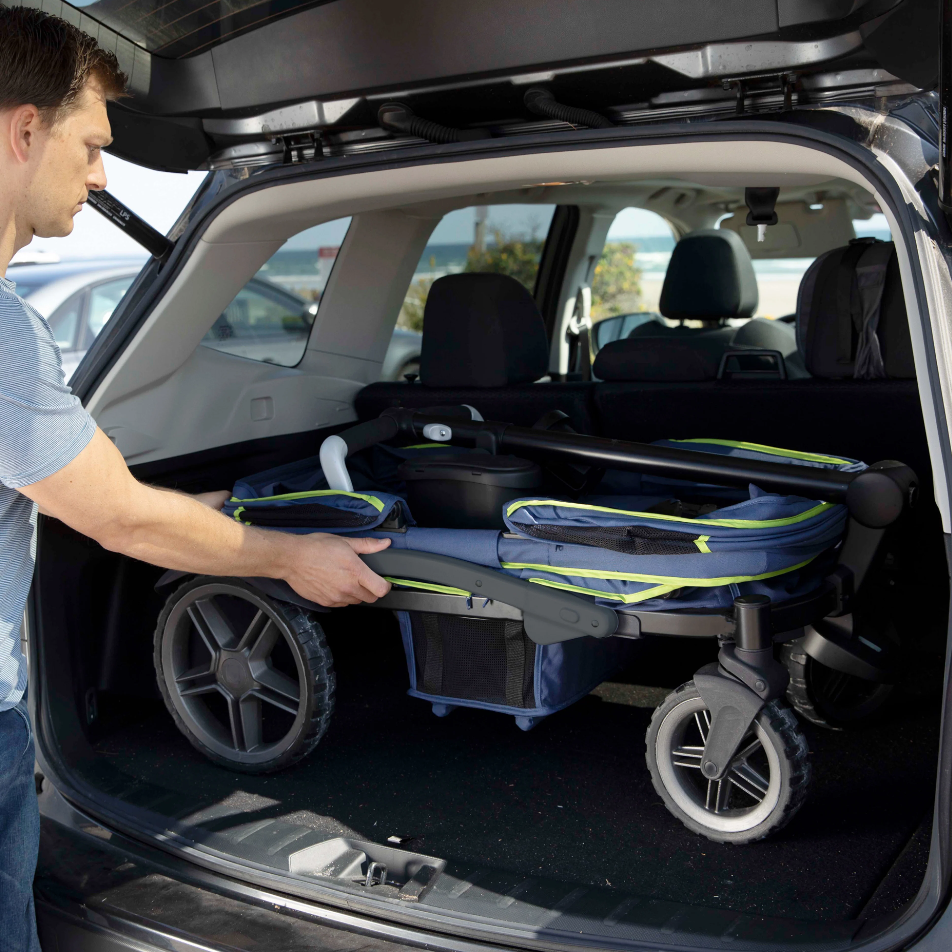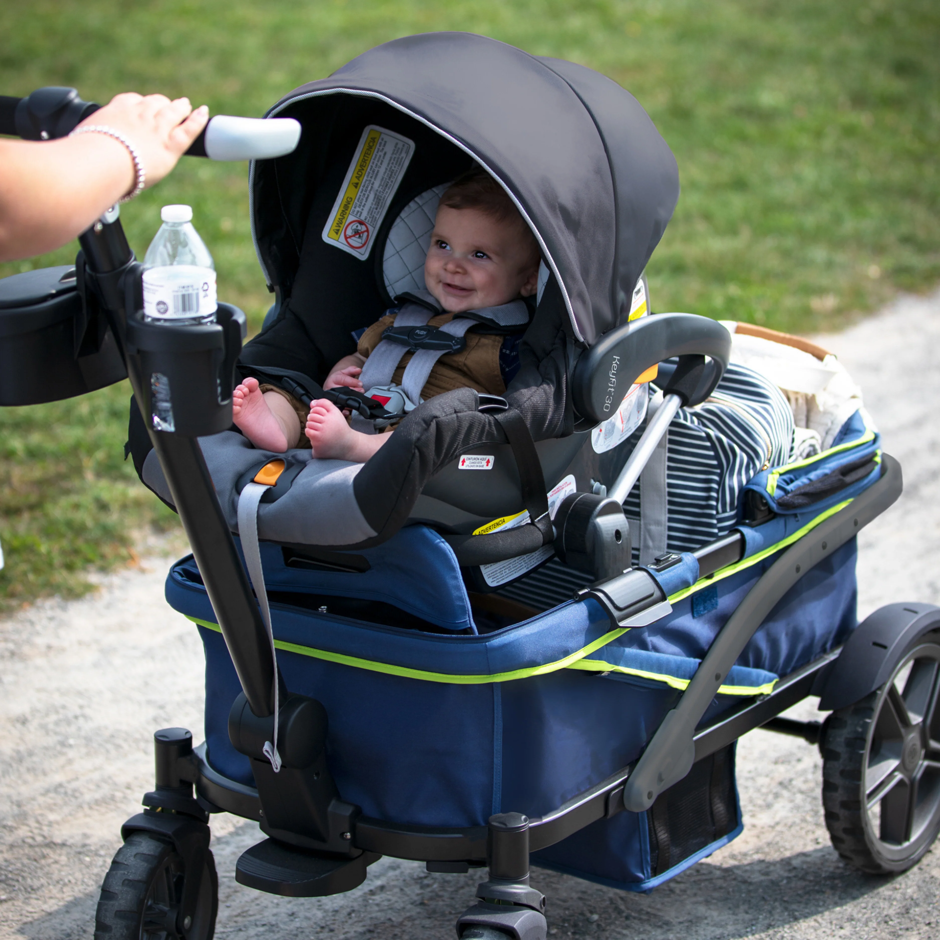This stroller wagon is a stylish and functional option for getting around with your little ones. It's equipped with rugged wheels and a sturdy frame for tackling all types of terrain, and comes with two XL canopies, a parent cup holder, and lounge pad. The Anthem2 also folds flat and can be used with an infant car seat when you purchase our universal adapter (sold separately).