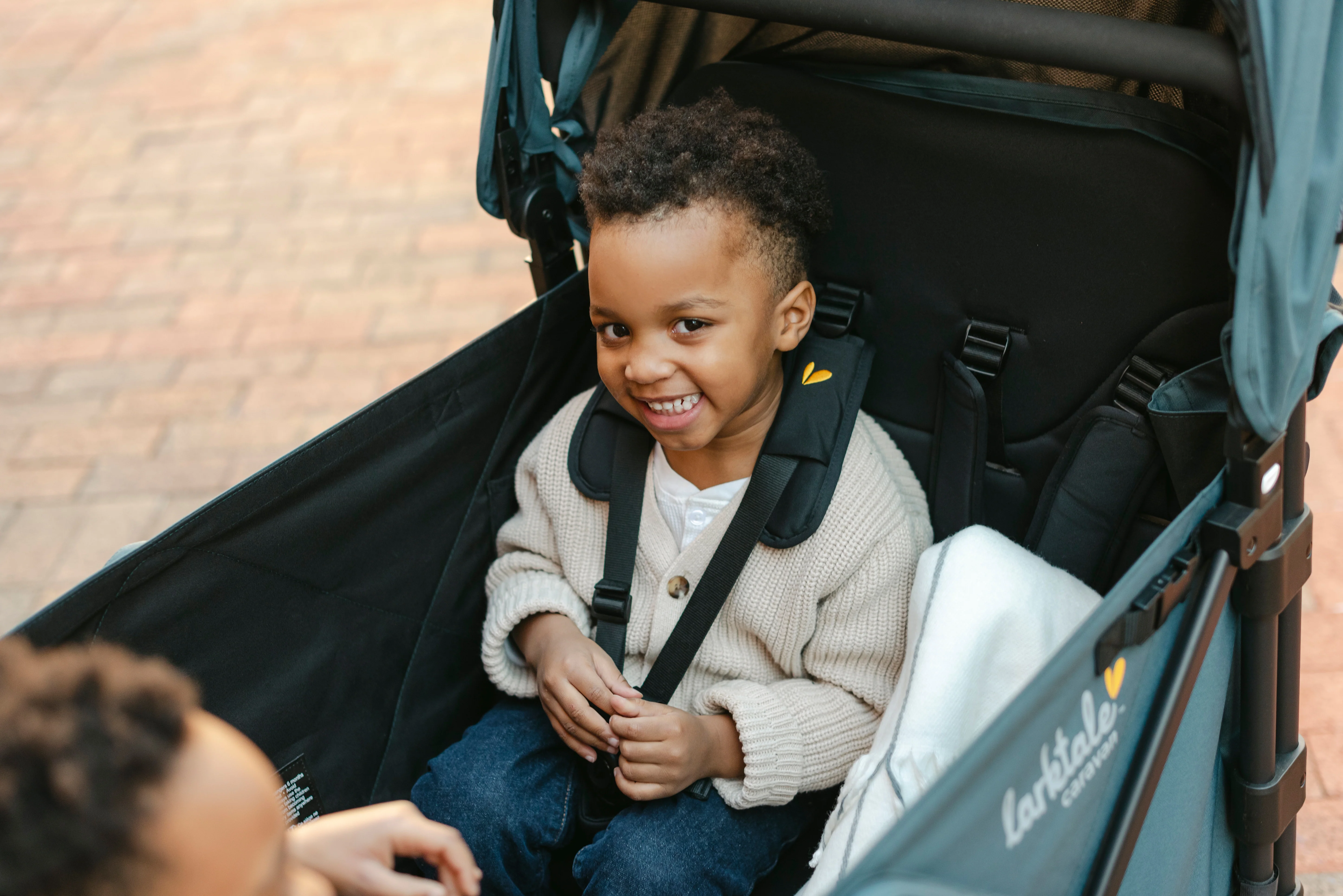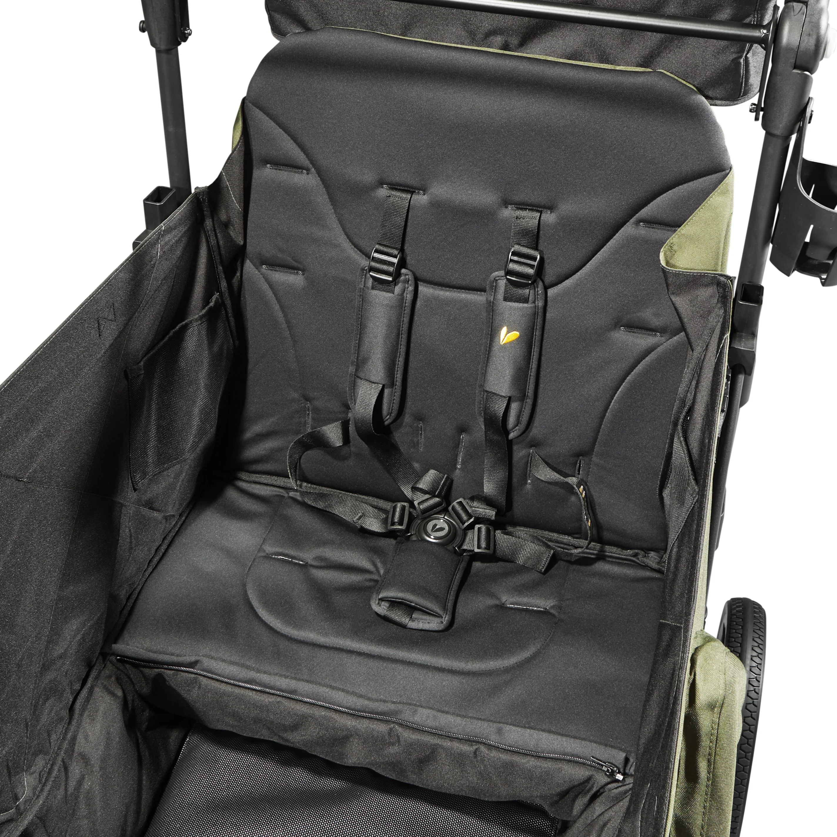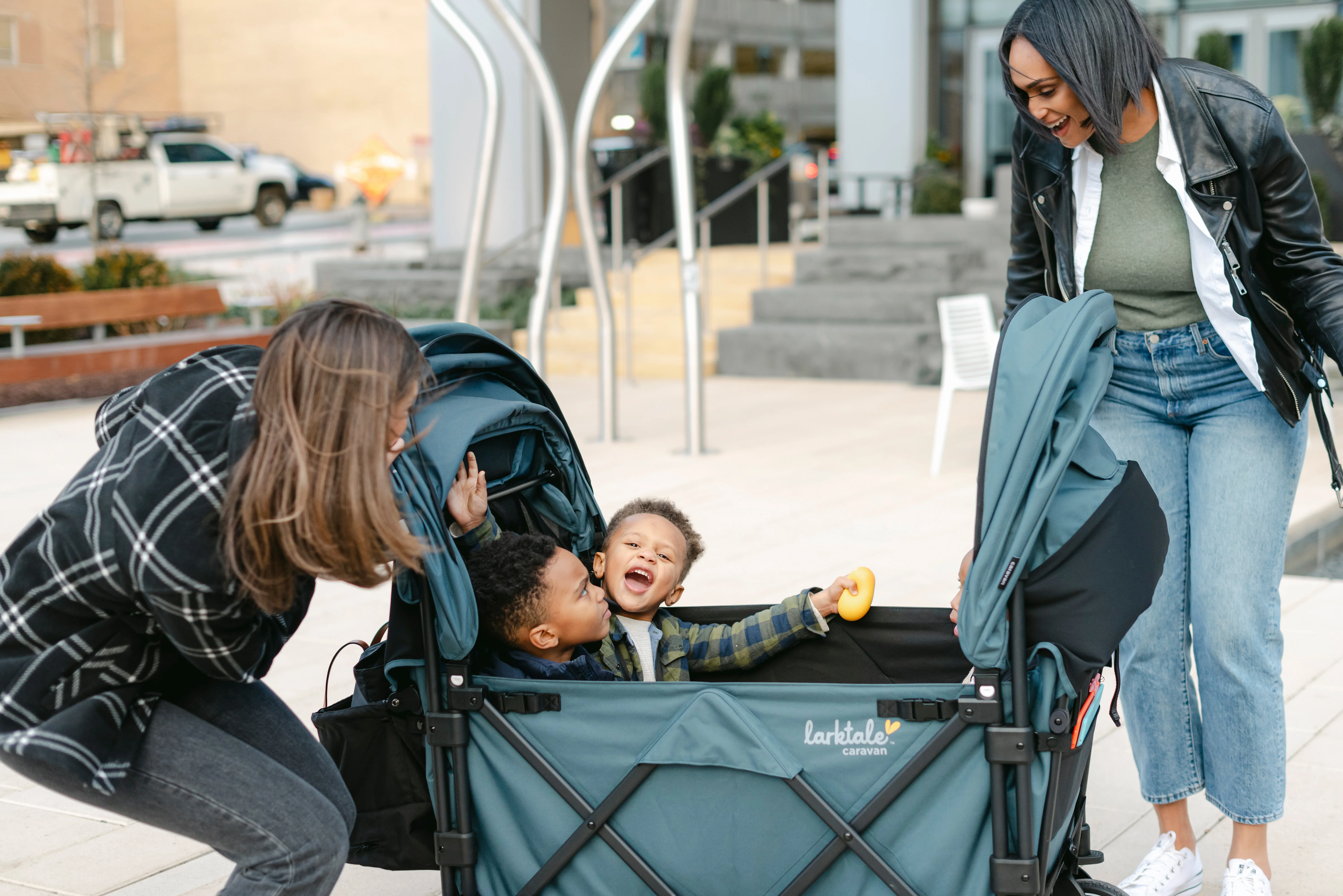 The Larktale caravan™ Quad has interior seating for up to four passengers in multi-position reclining seats and a shared drop-down footwell for comfortable stroller-style seating. With all the same great features as our 2-seater caravan, the caravan Quad is suitable from 6 months to 48.5 lbs per seat. The unique no-rethread harness system can be reconfigured to seat either one or two passengers per side and the roomy interior can safely accommodate a newborn using a caravan quad car seat adapter (sold separately). If you need space to haul cargo or let your little ones stretch their legs, simply attach the included footwell cover to provide a secure flat base interior to suit your needs. The footwell cover can even be stowed in the storage basket when not in use. The large rubber wheels and all-wheel suspension system provides easy maneuverability, putting even more activities in play such as sporting events, outdoor festivals, camping, and the beach. Parents will also love the dual adjustable sun canopies with peek-a-boo windows, height-adjustable leatherette handlebar, multiple storage compartments, included cup holder, and parent handlebar console.