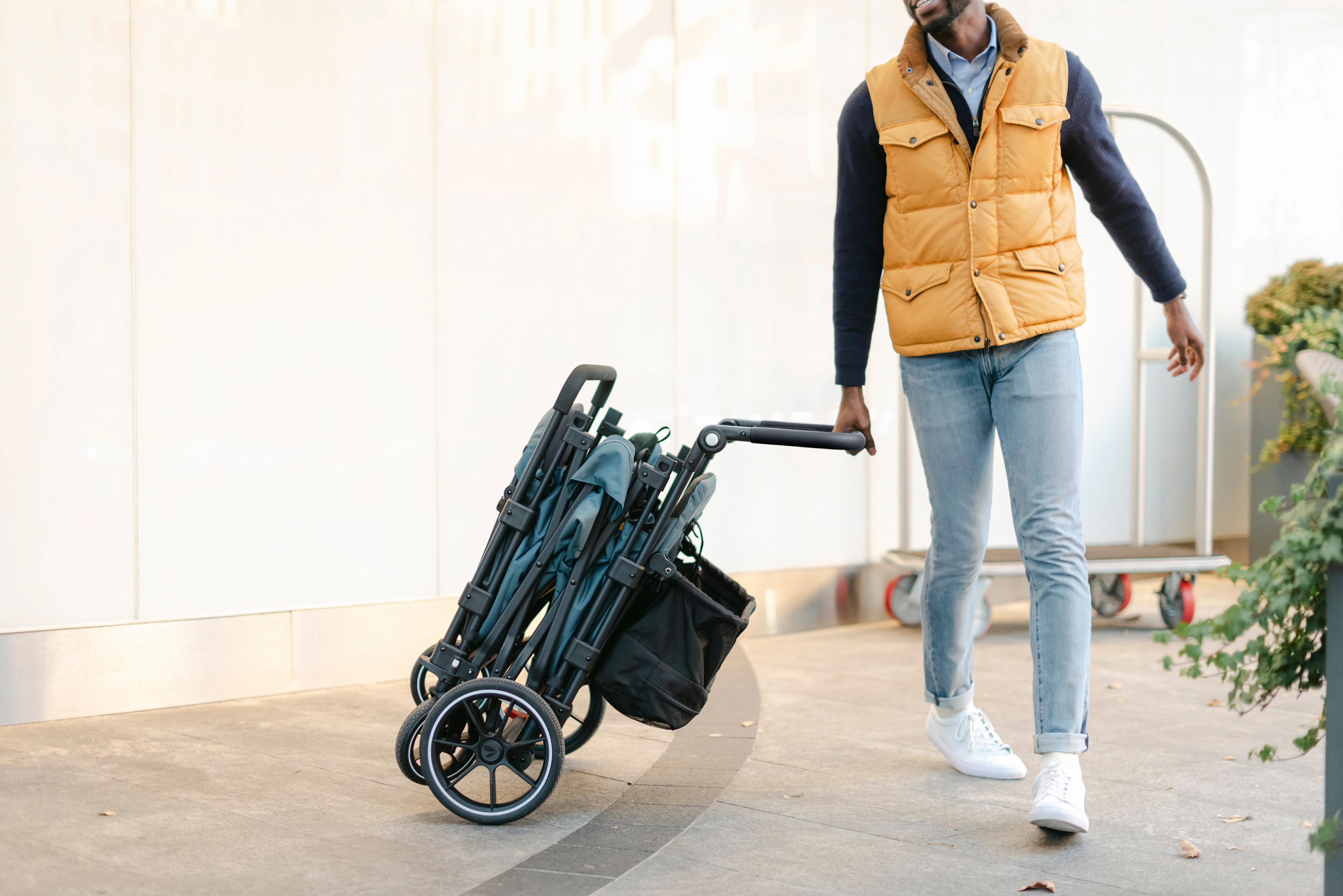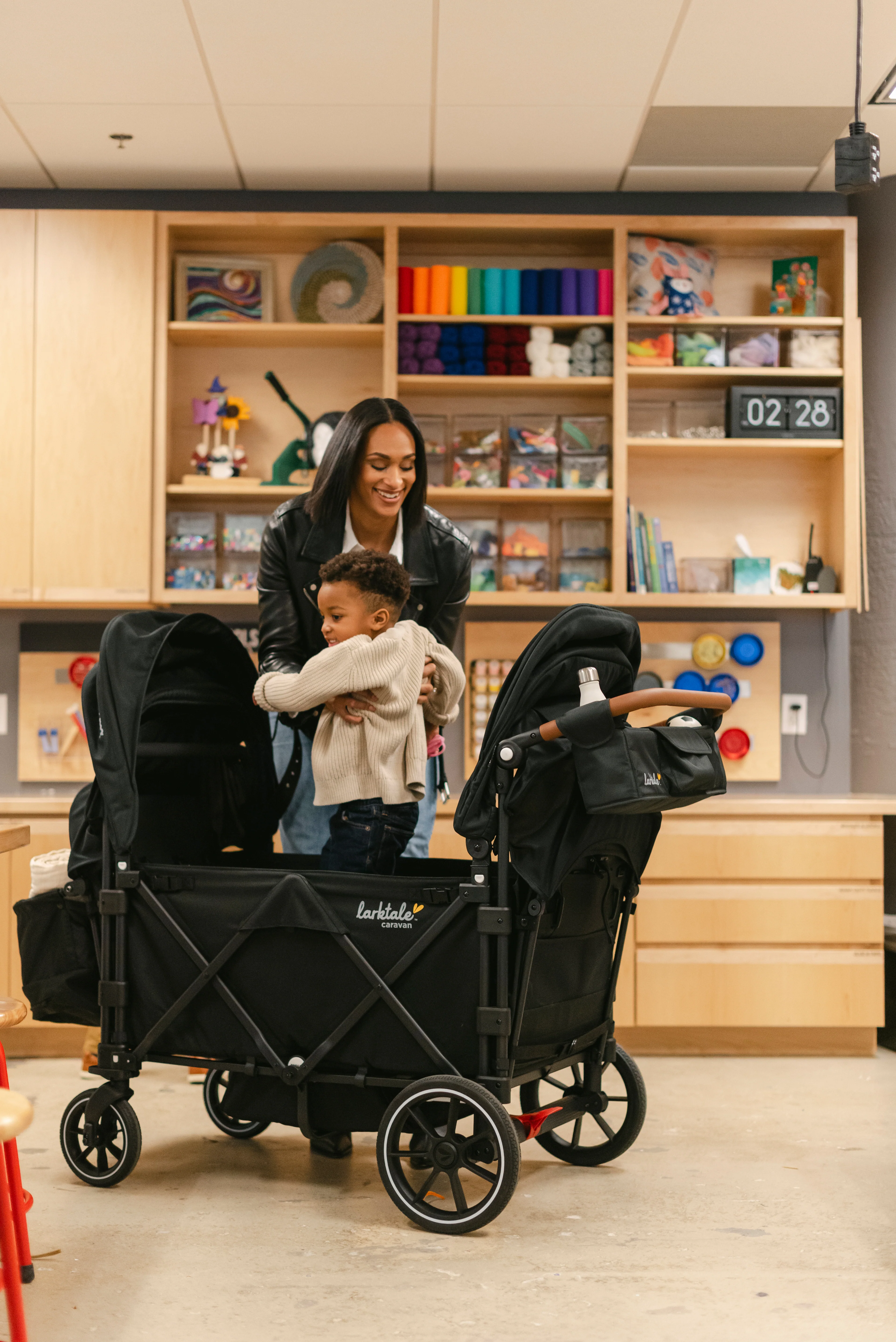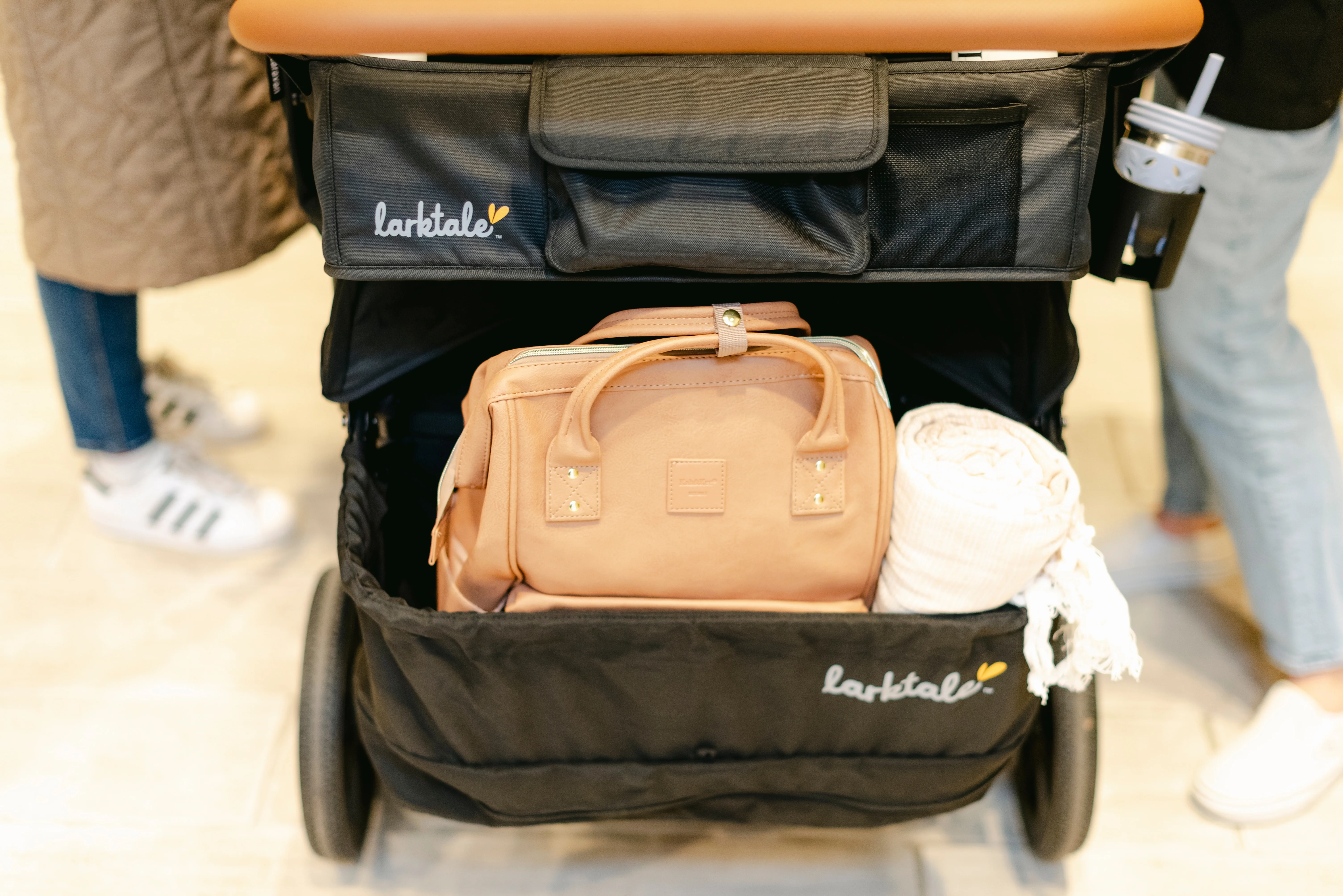 The Larktale caravan™ Quad has interior seating for up to four passengers in multi-position reclining seats and a shared drop-down footwell for comfortable stroller-style seating. With all the same great features as our 2-seater caravan, the caravan Quad is suitable from 6 months to 48.5 lbs per seat. The unique no-rethread harness system can be reconfigured to seat either one or two passengers per side and the roomy interior can safely accommodate a newborn using a caravan quad car seat adapter (sold separately). If you need space to haul cargo or let your little ones stretch their legs, simply attach the included footwell cover to provide a secure flat base interior to suit your needs. The footwell cover can even be stowed in the storage basket when not in use. The large rubber wheels and all-wheel suspension system provides easy maneuverability, putting even more activities in play such as sporting events, outdoor festivals, camping, and the beach. Parents will also love the dual adjustable sun canopies with peek-a-boo windows, height-adjustable leatherette handlebar, multiple storage compartments, included cup holder, and parent handlebar console.