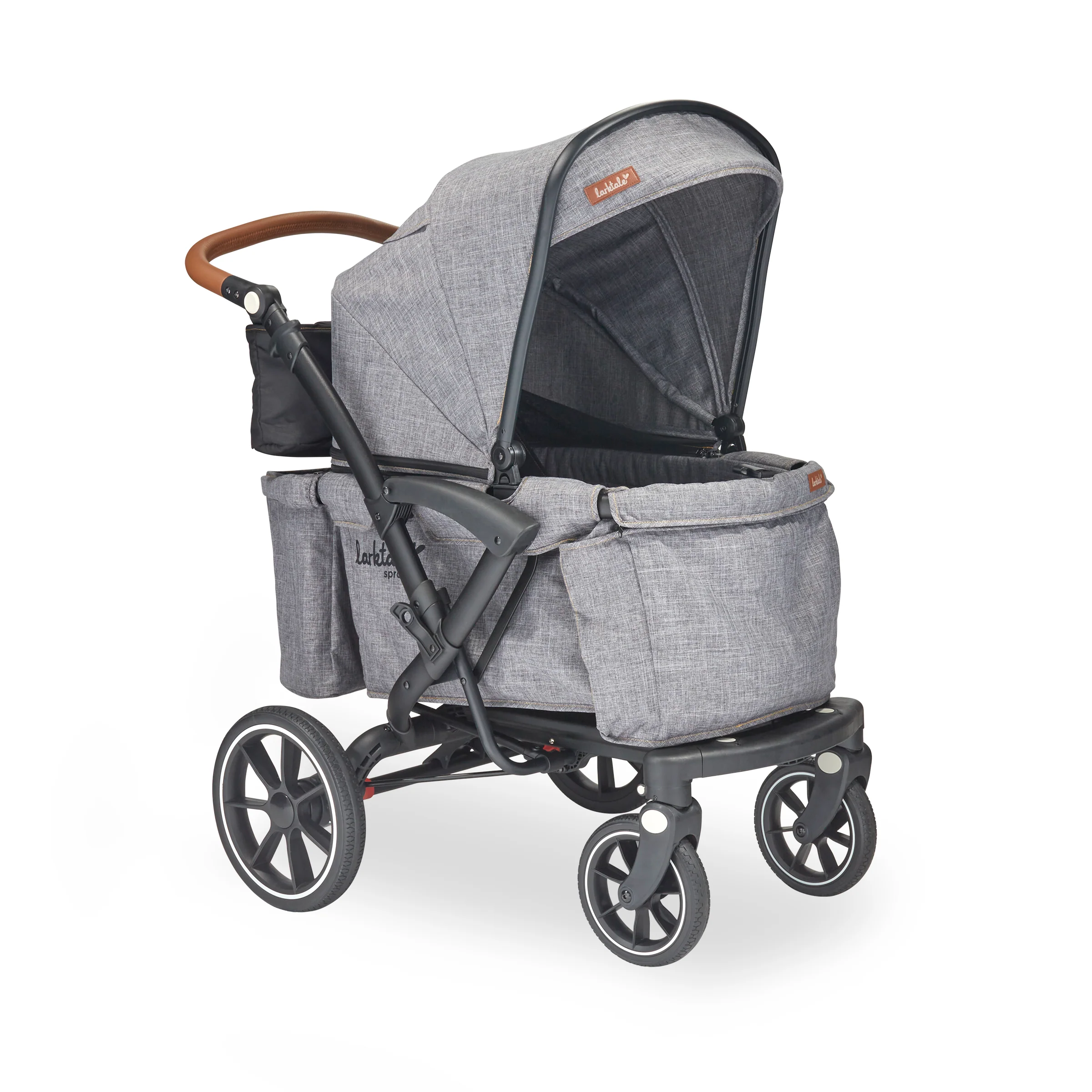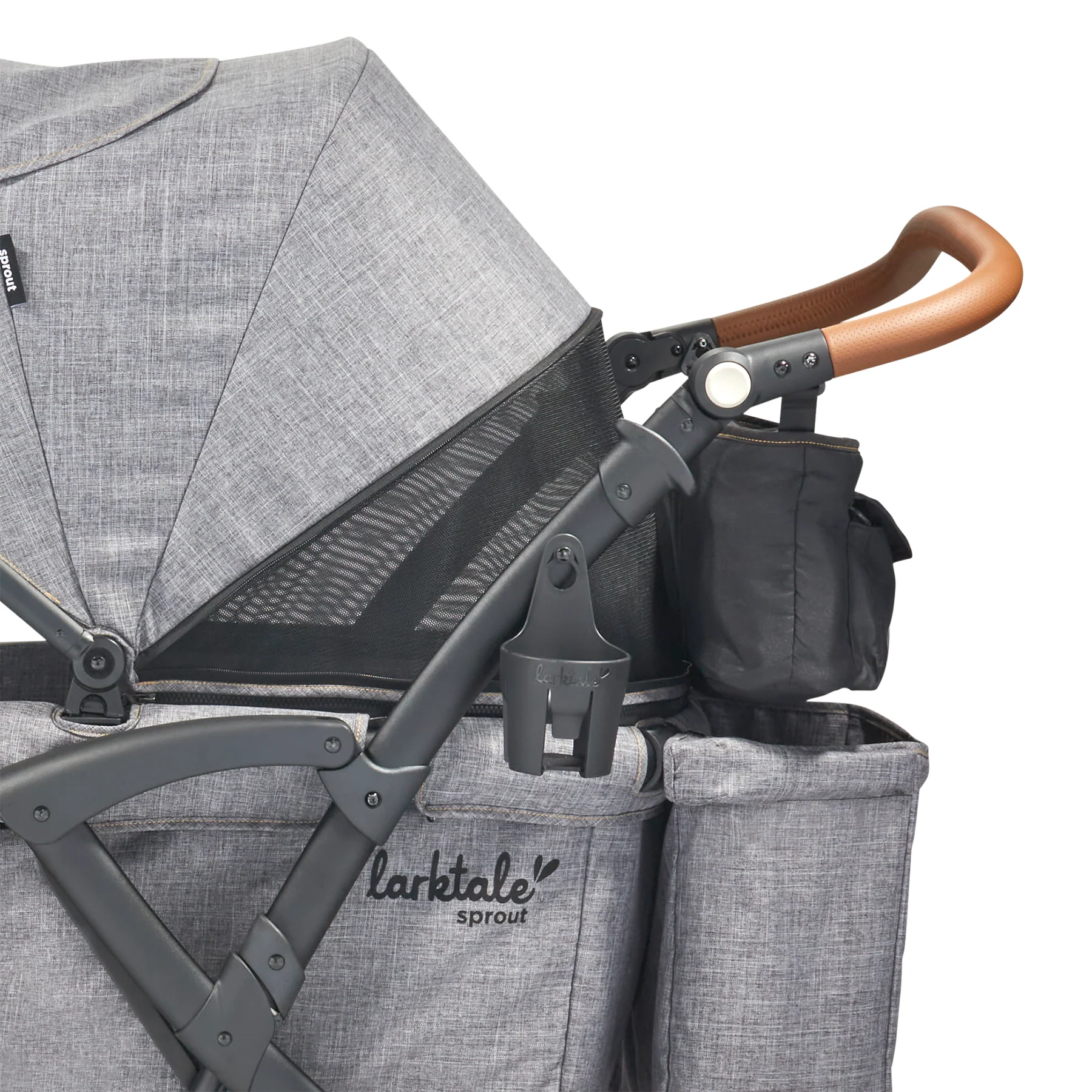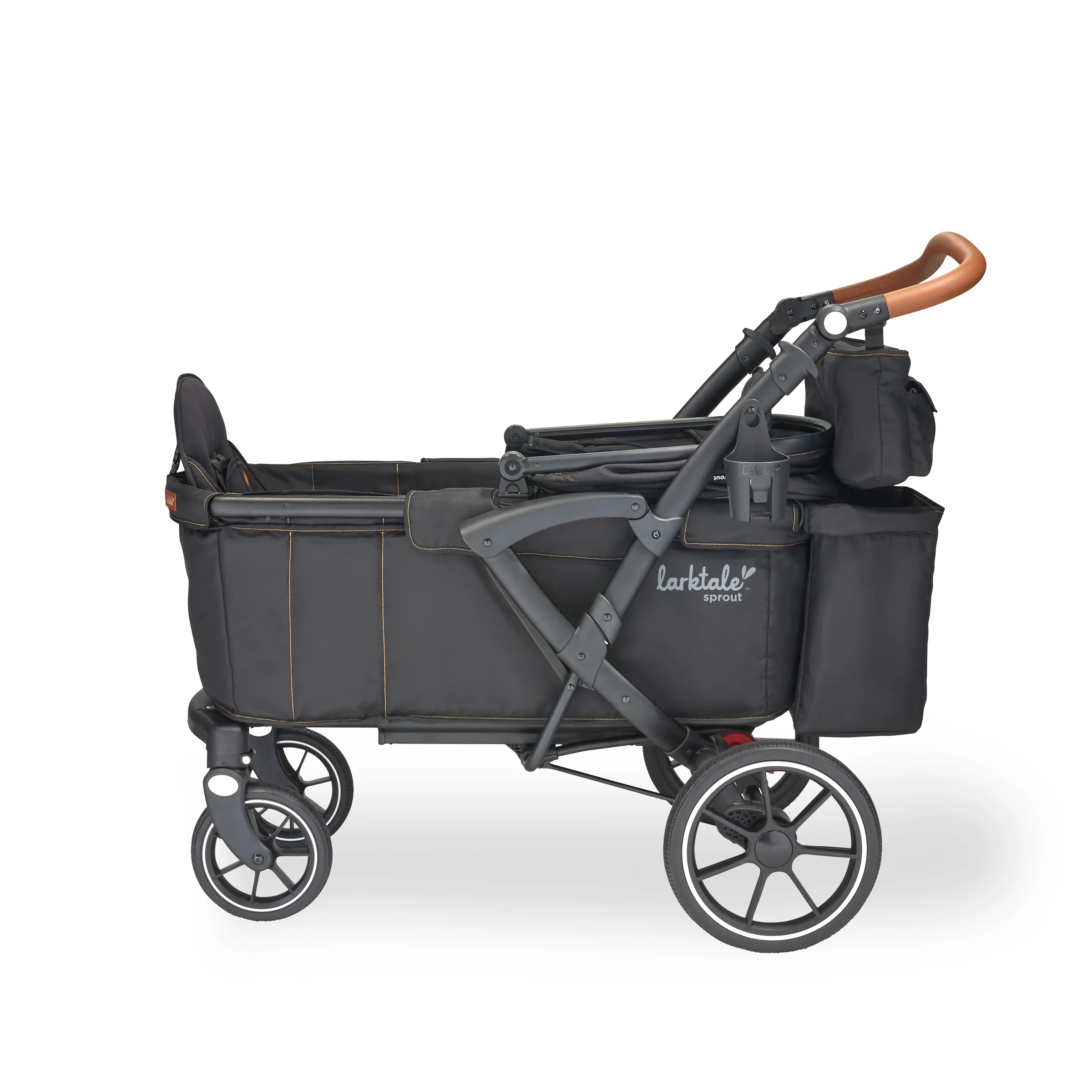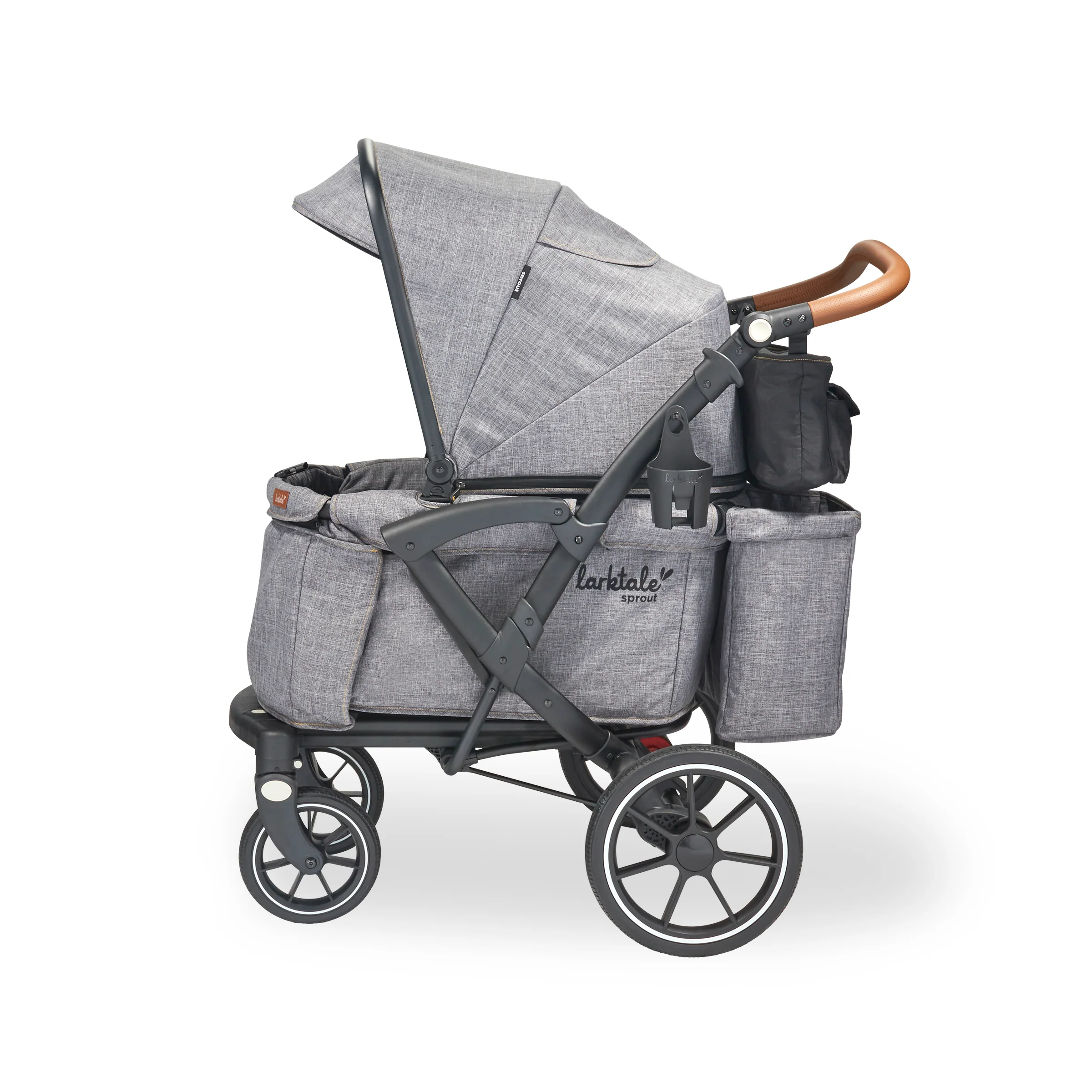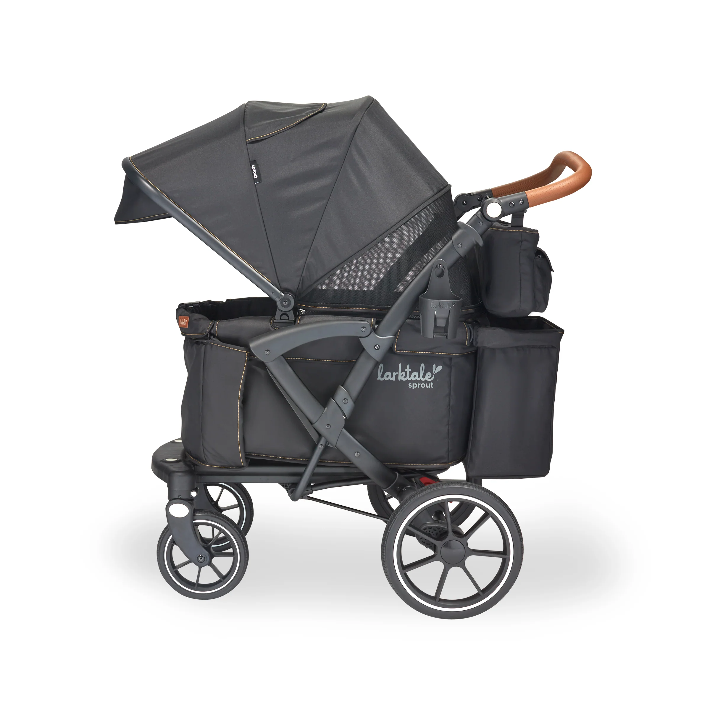 The Larktale sprout™ V2 Single-to-Double Stroller/Wagon is a stylish, first of its kind, size-adjustable wagon, designed for families living in metropolitan areas or have limited space in their home. The sprout is a compact single-seater wagon that parents can expand into a double-sized wagon with no tools or conversion kits needed. With the sprout, parents have the option to select the right size chassis for their activity: Need extra cargo space or to add a seat for an extra kid? Simply expand the sprout wagon chassis to make room for it all. Dropping off one kid at a playdate before running errands with the other? Shorten the sprout wagon chassis to make strolling with one kid a little more practical. All conversions can be completed in 5 seconds or less in this innovative stroller/wagon and everything you need is included. Beyond the innovative flexibility of the sprout, parents will also love the luxury styling, extra-large sun canopy with air-flow panel and peek-a-boo window, the large storage basket, cargo divider for when the second seat is not in use in double mode, included parent’s console, leatherette wrapped adjustable handlebar, and all-wheel suspension. Suitable for kids from 6 months to a combined kid/cargo weight of 120 lbs. The compact flat fold of the sprout allows the wagon to be easily stored and transported.
