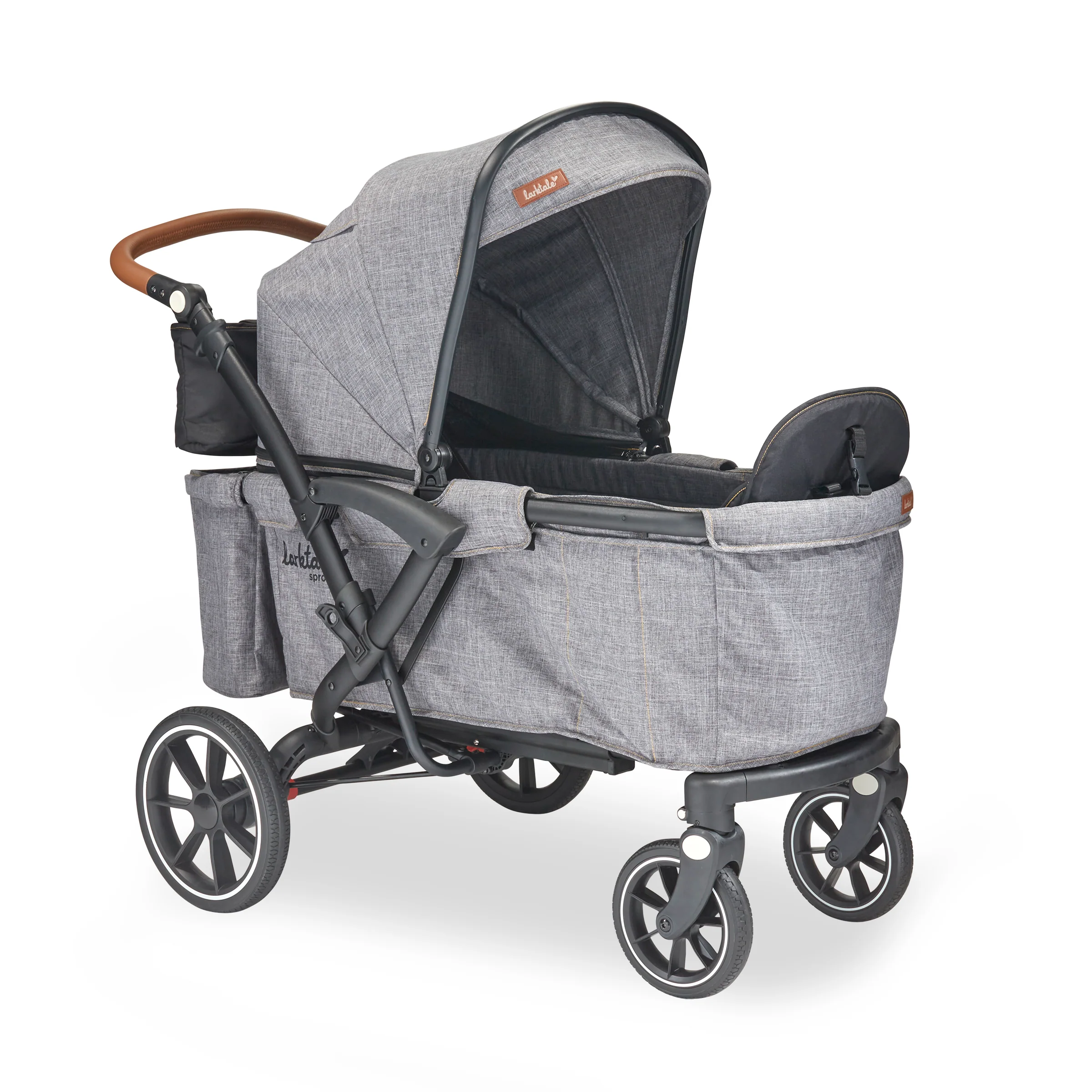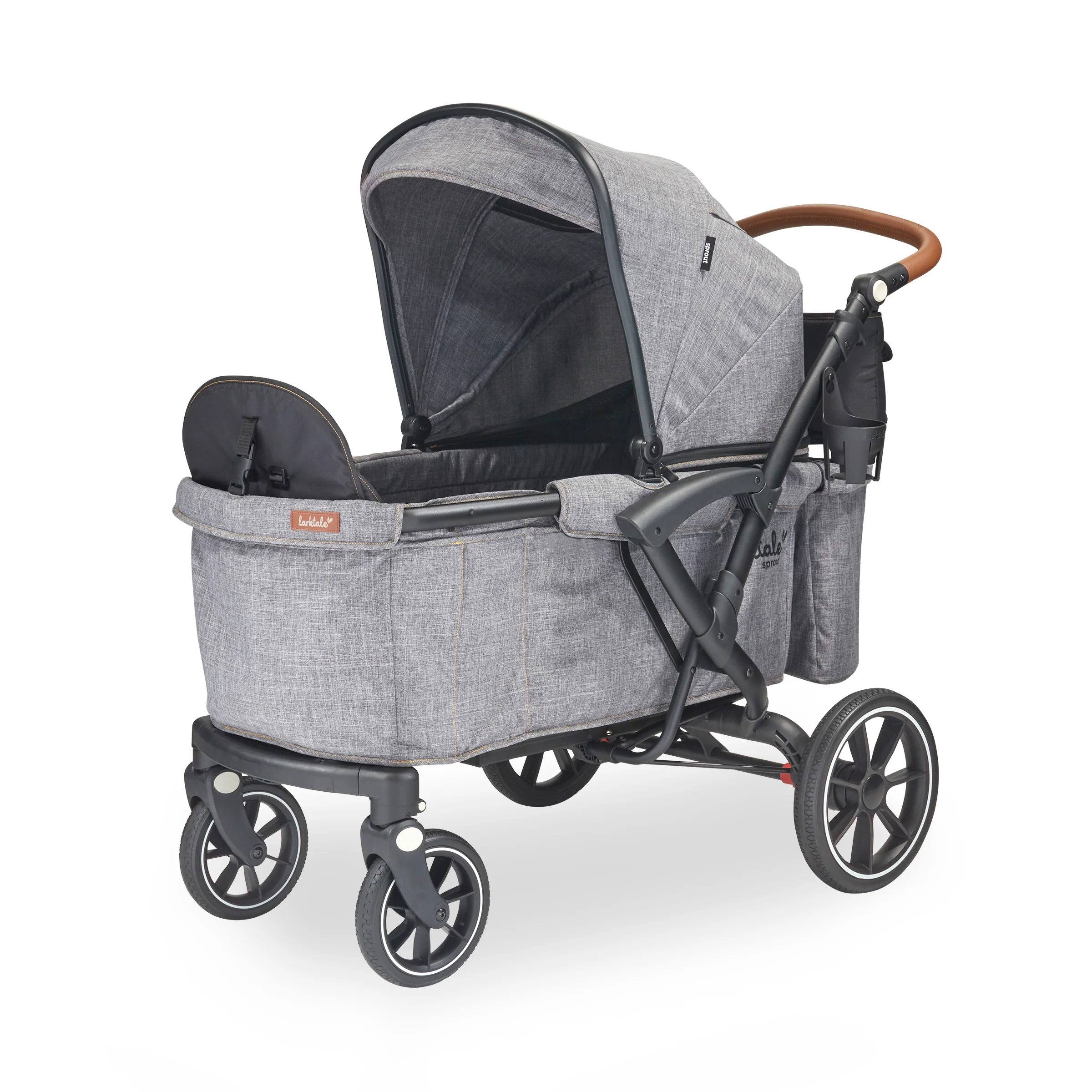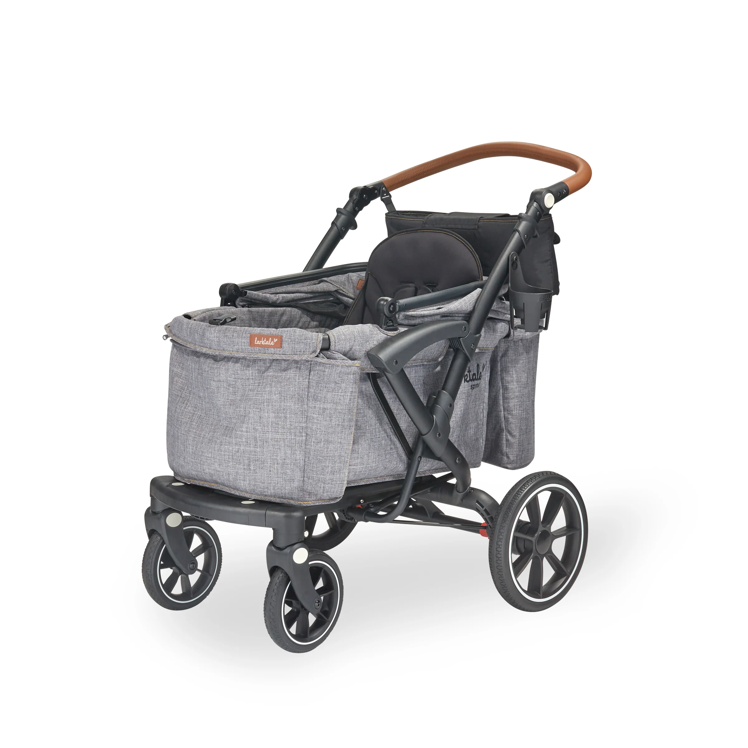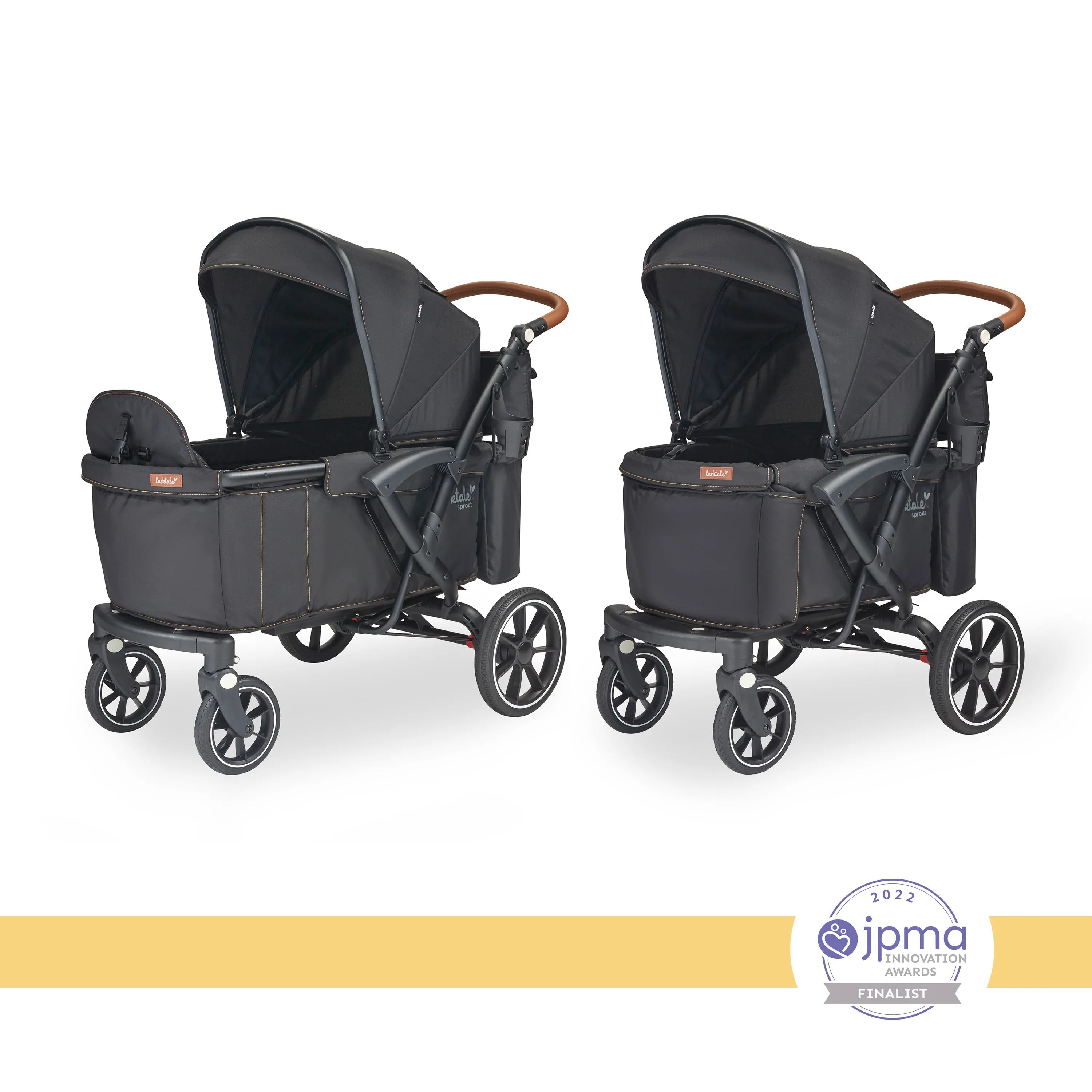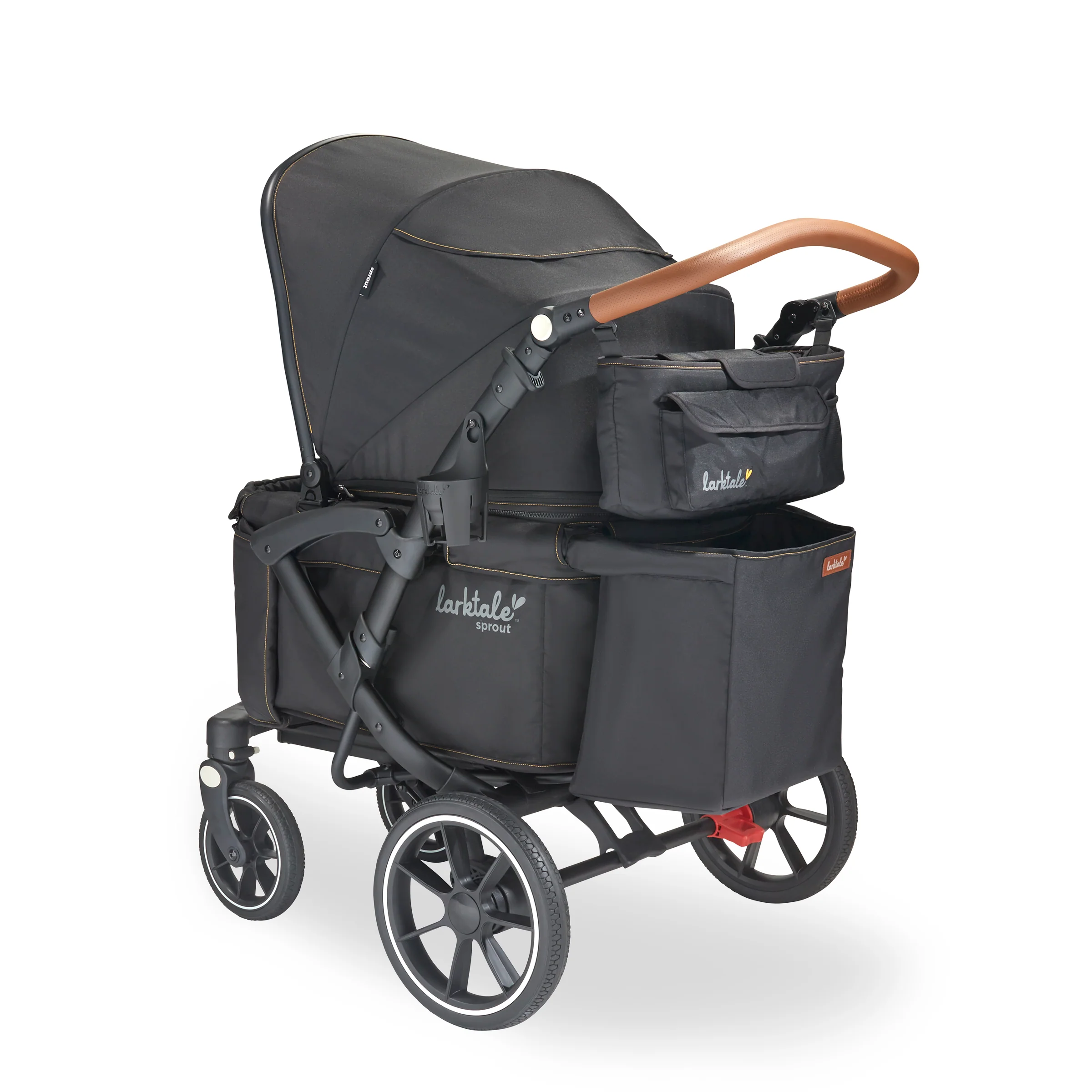 The Larktale sprout™ V2 Single-to-Double Stroller/Wagon is a stylish, first of its kind, size-adjustable wagon, designed for families living in metropolitan areas or have limited space in their home. The sprout is a compact single-seater wagon that parents can expand into a double-sized wagon with no tools or conversion kits needed. With the sprout, parents have the option to select the right size chassis for their activity: Need extra cargo space or to add a seat for an extra kid? Simply expand the sprout wagon chassis to make room for it all. Dropping off one kid at a playdate before running errands with the other? Shorten the sprout wagon chassis to make strolling with one kid a little more practical. All conversions can be completed in 5 seconds or less in this innovative stroller/wagon and everything you need is included. Beyond the innovative flexibility of the sprout, parents will also love the luxury styling, extra-large sun canopy with air-flow panel and peek-a-boo window, the large storage basket, cargo divider for when the second seat is not in use in double mode, included parent’s console, leatherette wrapped adjustable handlebar, and all-wheel suspension. Suitable for kids from 6 months to a combined kid/cargo weight of 120 lbs. The compact flat fold of the sprout allows the wagon to be easily stored and transported.