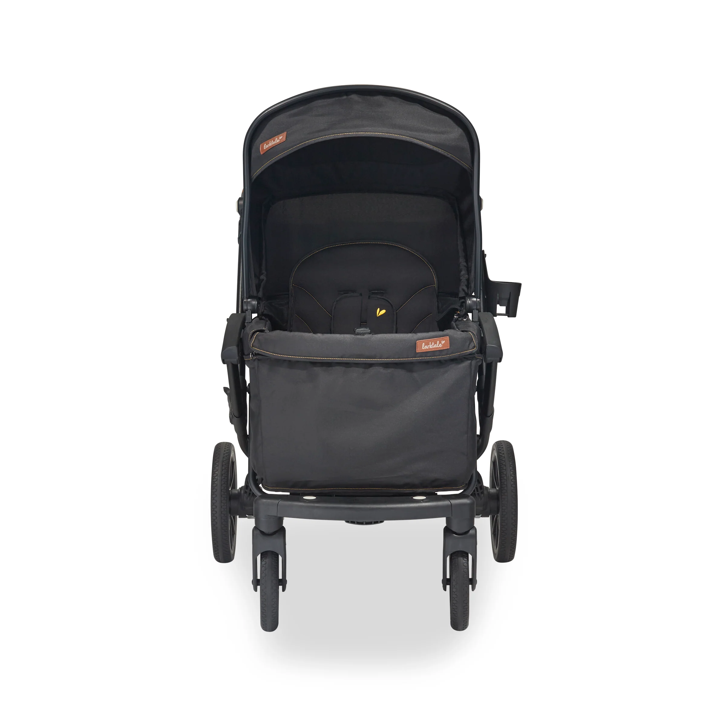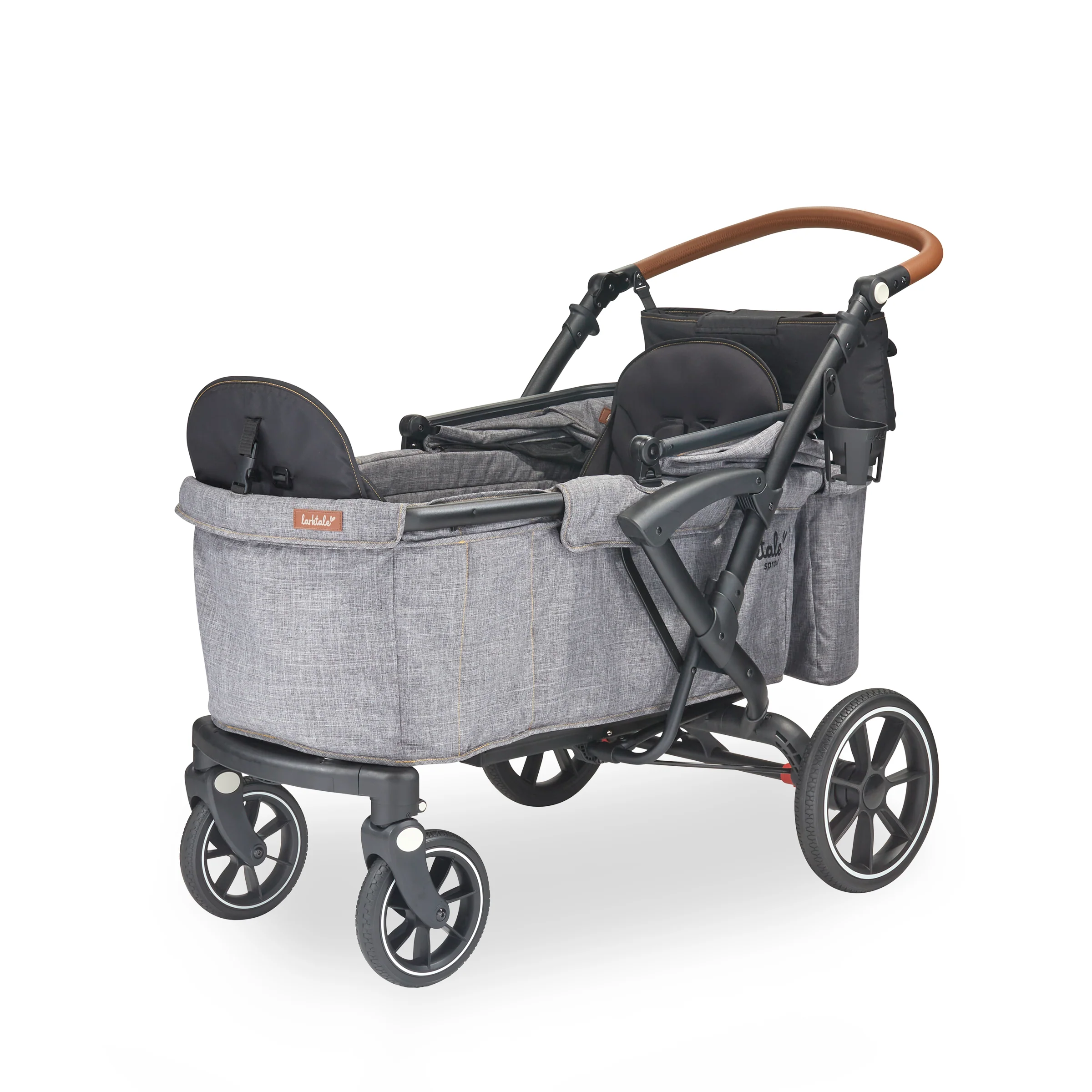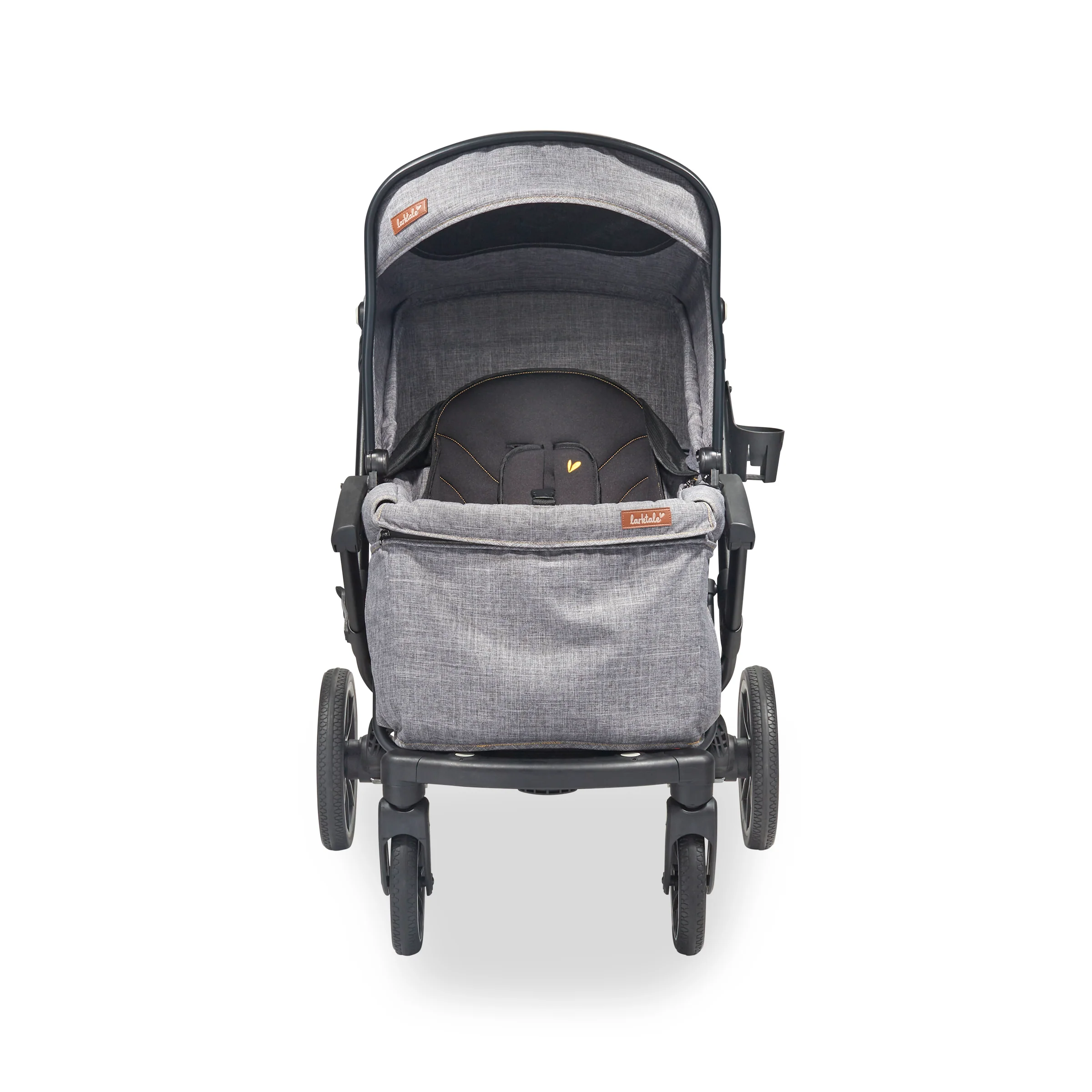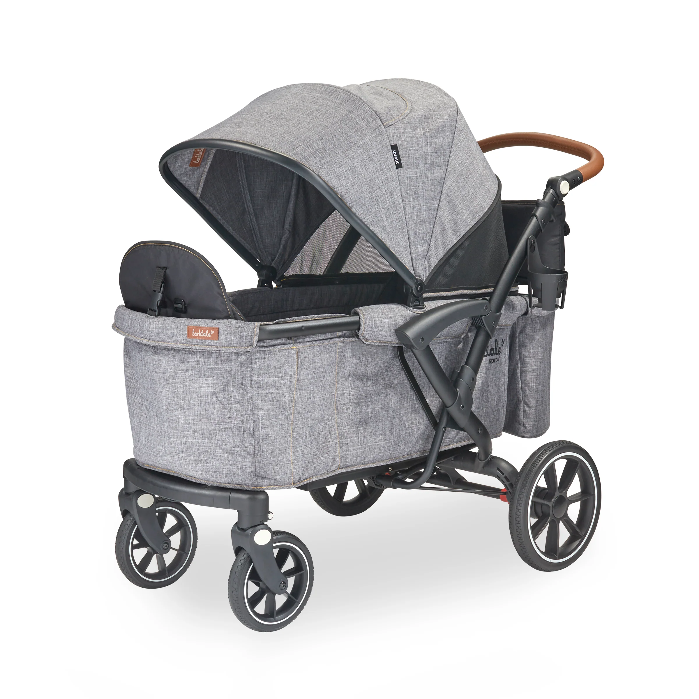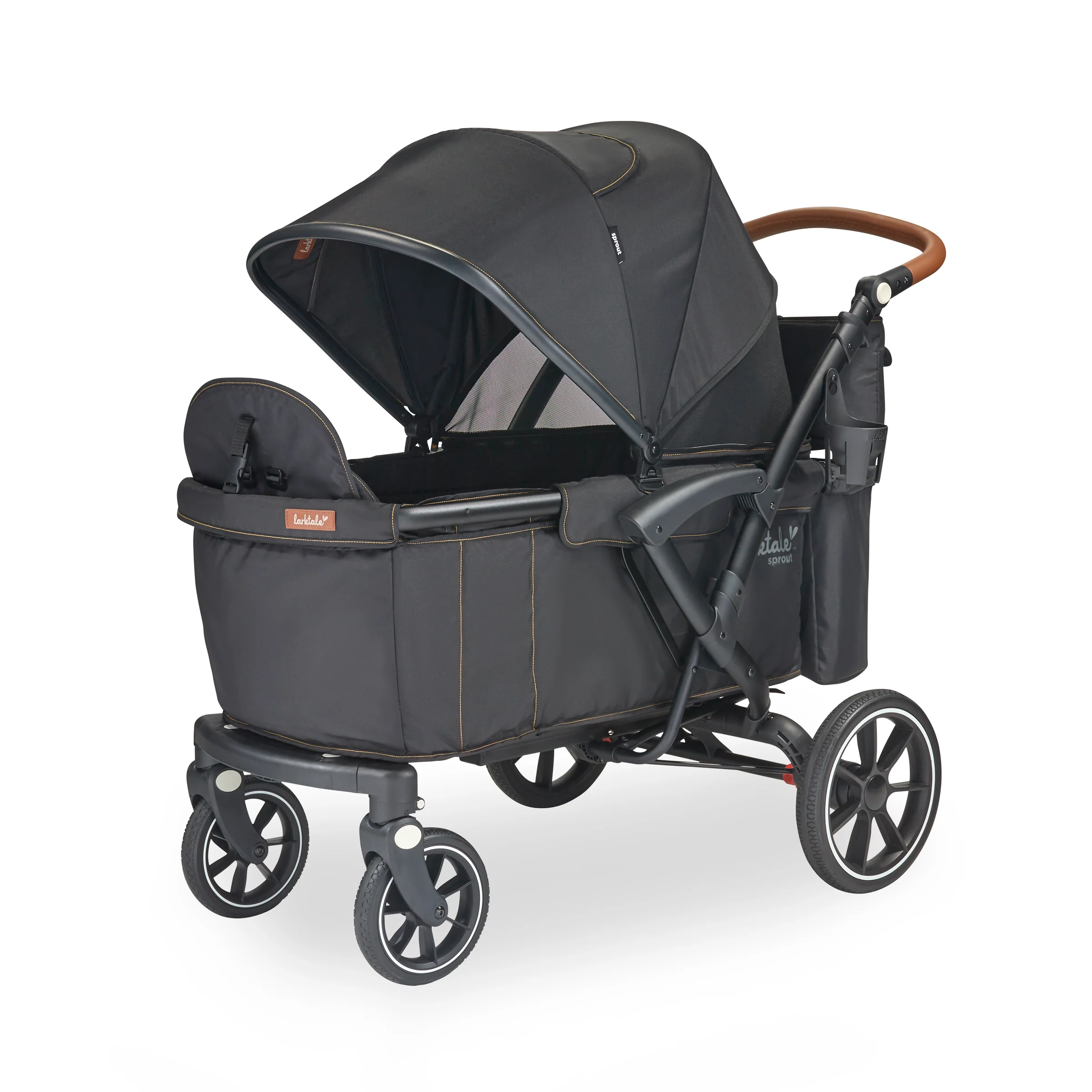 The Larktale sprout™ V2 Single-to-Double Stroller/Wagon is a stylish, first of its kind, size-adjustable wagon, designed for families living in metropolitan areas or have limited space in their home. The sprout is a compact single-seater wagon that parents can expand into a double-sized wagon with no tools or conversion kits needed. With the sprout, parents have the option to select the right size chassis for their activity: Need extra cargo space or to add a seat for an extra kid? Simply expand the sprout wagon chassis to make room for it all. Dropping off one kid at a playdate before running errands with the other? Shorten the sprout wagon chassis to make strolling with one kid a little more practical. All conversions can be completed in 5 seconds or less in this innovative stroller/wagon and everything you need is included. Beyond the innovative flexibility of the sprout, parents will also love the luxury styling, extra-large sun canopy with air-flow panel and peek-a-boo window, the large storage basket, cargo divider for when the second seat is not in use in double mode, included parent’s console, leatherette wrapped adjustable handlebar, and all-wheel suspension. Suitable for kids from 6 months to a combined kid/cargo weight of 120 lbs. The compact flat fold of the sprout allows the wagon to be easily stored and transported.