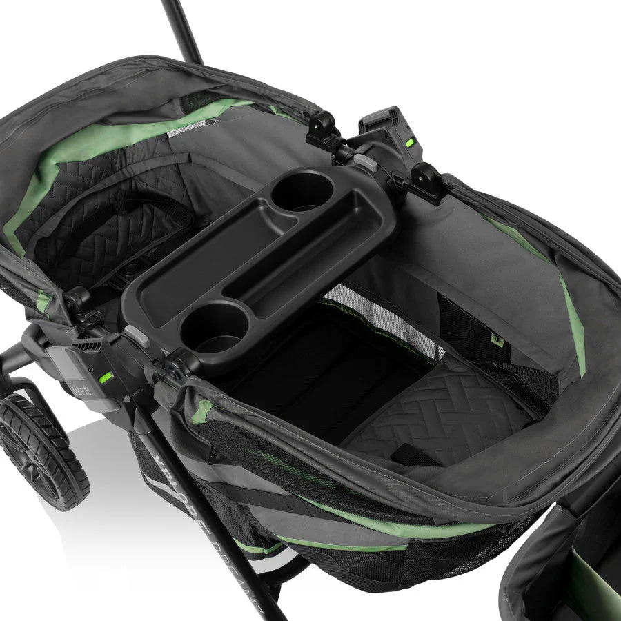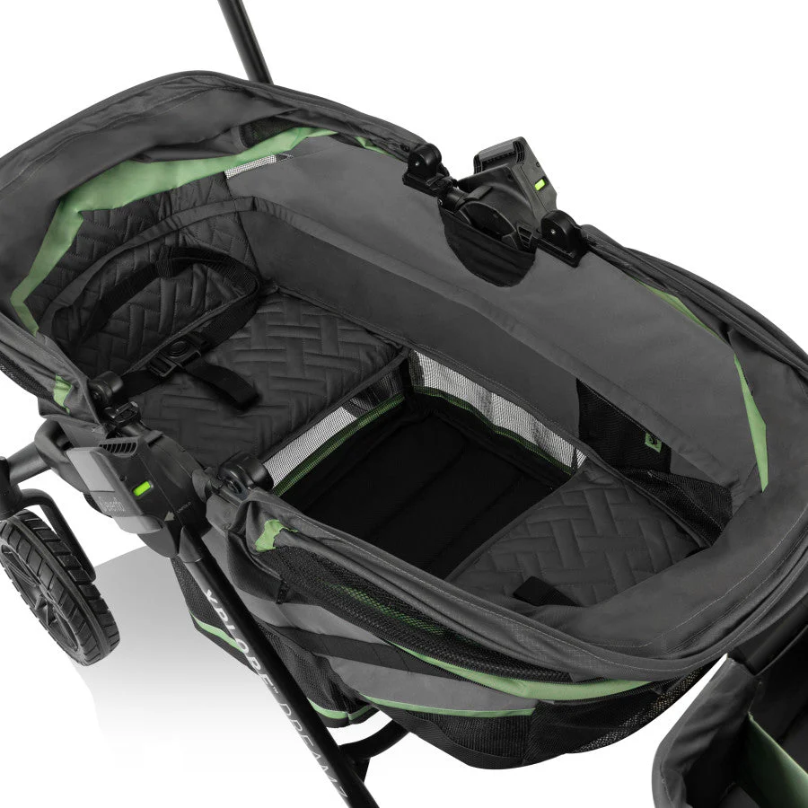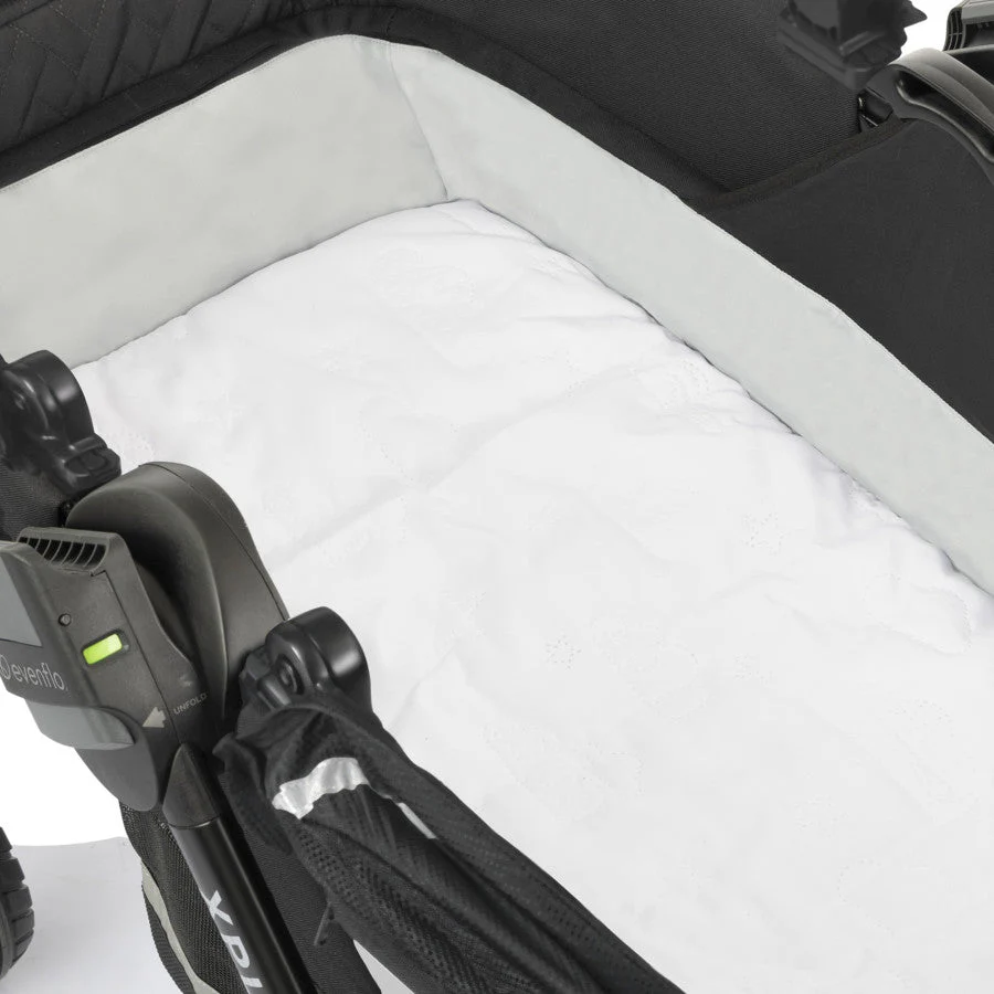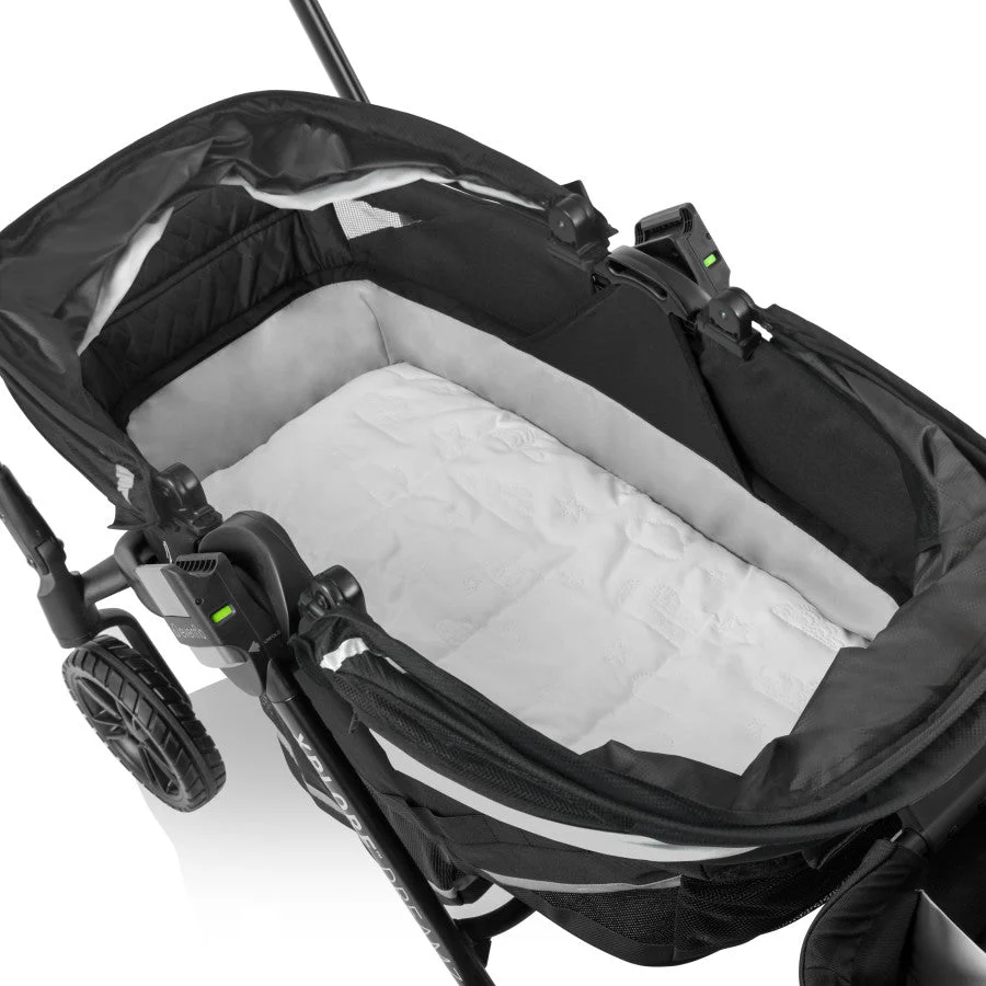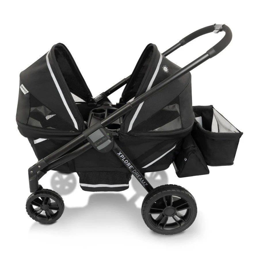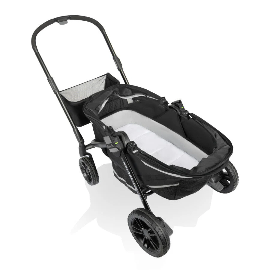 Adventuring can take a lot out of a little one! Be ready for naptime on the go with the Pivot Xplore™ Dreamz All-Terrain Stroller Wagon with Bassinet Insert. Designed for children from 6 months to 33 lb, the bassinet insert lets your little one take a break from the action comfortably, then tucks out of the way until the next catnap. This all-terrain ride accommodates up to two children ages 6 months to 5 years, with each seat holding a child up to 55 lb (110 lb total). As with our bestselling Pivot Xplore, the Xplore Dreamz transforms with a flip of the three-position, telescoping handle, allowing you to push as a stroller or pull as a wagon even as your child nods off in the bassinet insert. Larger UPF 50+ canopies expand from 2 to 3 panels with a quick unzip to help protect your child against the sun’s harmful rays, while breathable mesh helps to keep naptime comfortable. A newly extended footwell gives energetic little legs extra room. With 3-point harness secured, the rugged, all-terrain wheels take your family adventure from pavement to beach and beyond, while the wagon’s 27 in. width fits through most doorways with ease. For more flexible seating, the Xplore Dreamz accepts a toddler seat or infant car seat adapter (both sold separately). To keep little gigglers busy, the included BPA-free child tray features two cup holders. Mesh pockets store snacks, toys and items you want to keep within reach. An additional, detachable storage basket includes pop-out cup holders for adults. Elastic straps on the side of the wagon hold everything from umbrellas to water bottles to keys. The front of the wagon drops down with the press of a button for easy in and out. Quick, easy, compact fold makes your Xplore Dreamz a breeze to pack up for travel. From adventure to naps, you’re ready for a full day of fun.