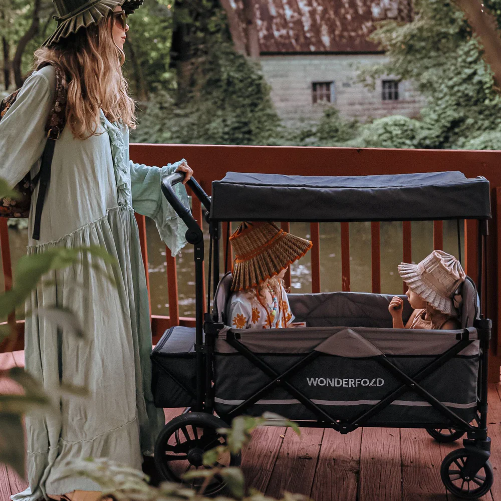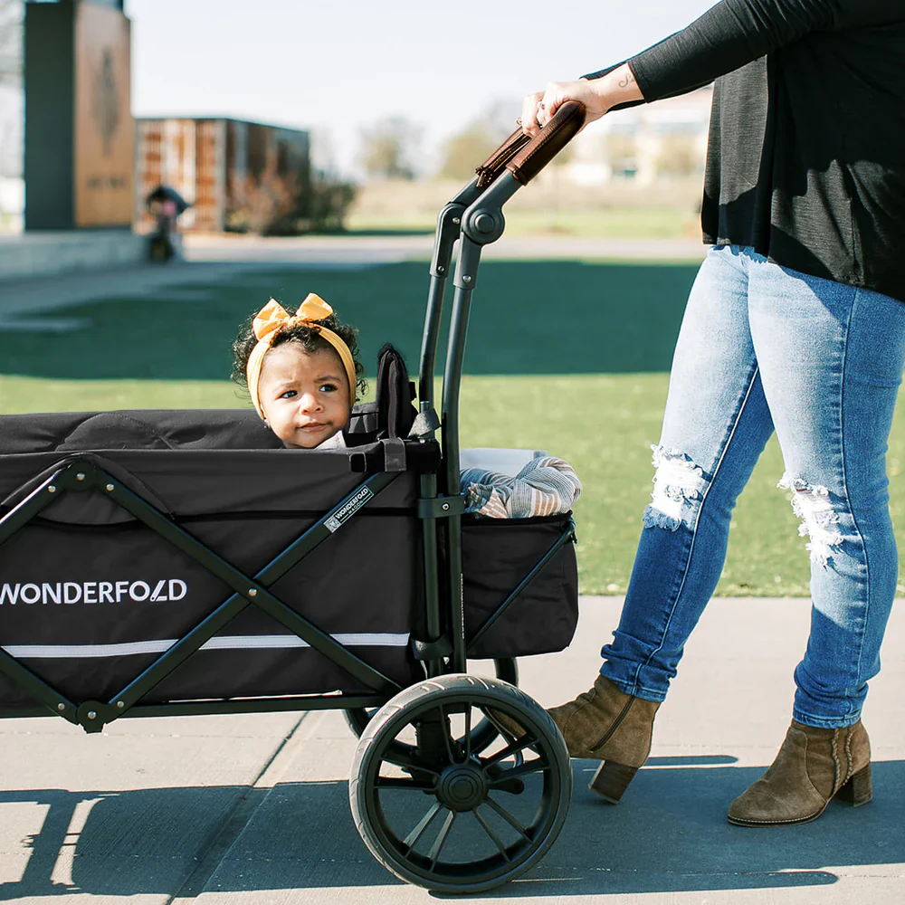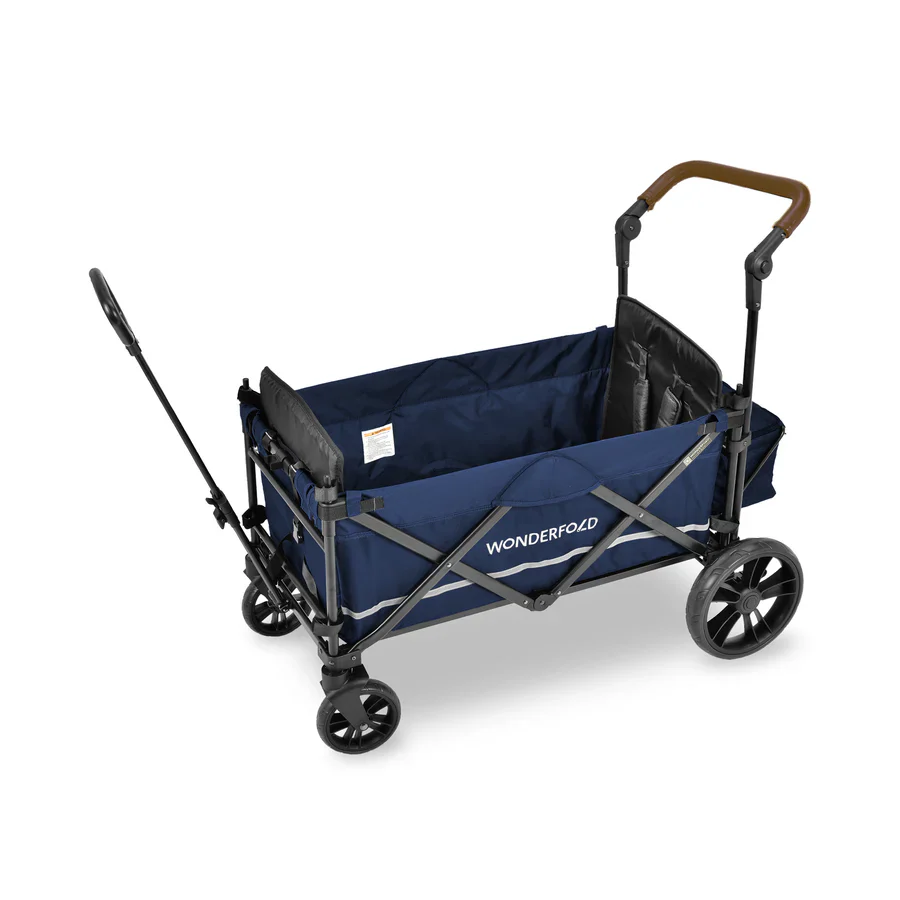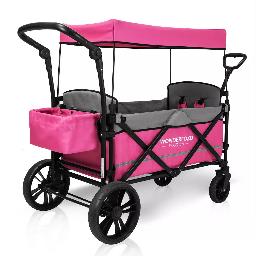 The WonderFold X2 Double Stroller Wagon features face-to-face seats, an adjustable handlebar and a removable canopy. Perfect for any outing, this double stroller wagon has a 150 lb. weight capacity and easily folds for transporting.