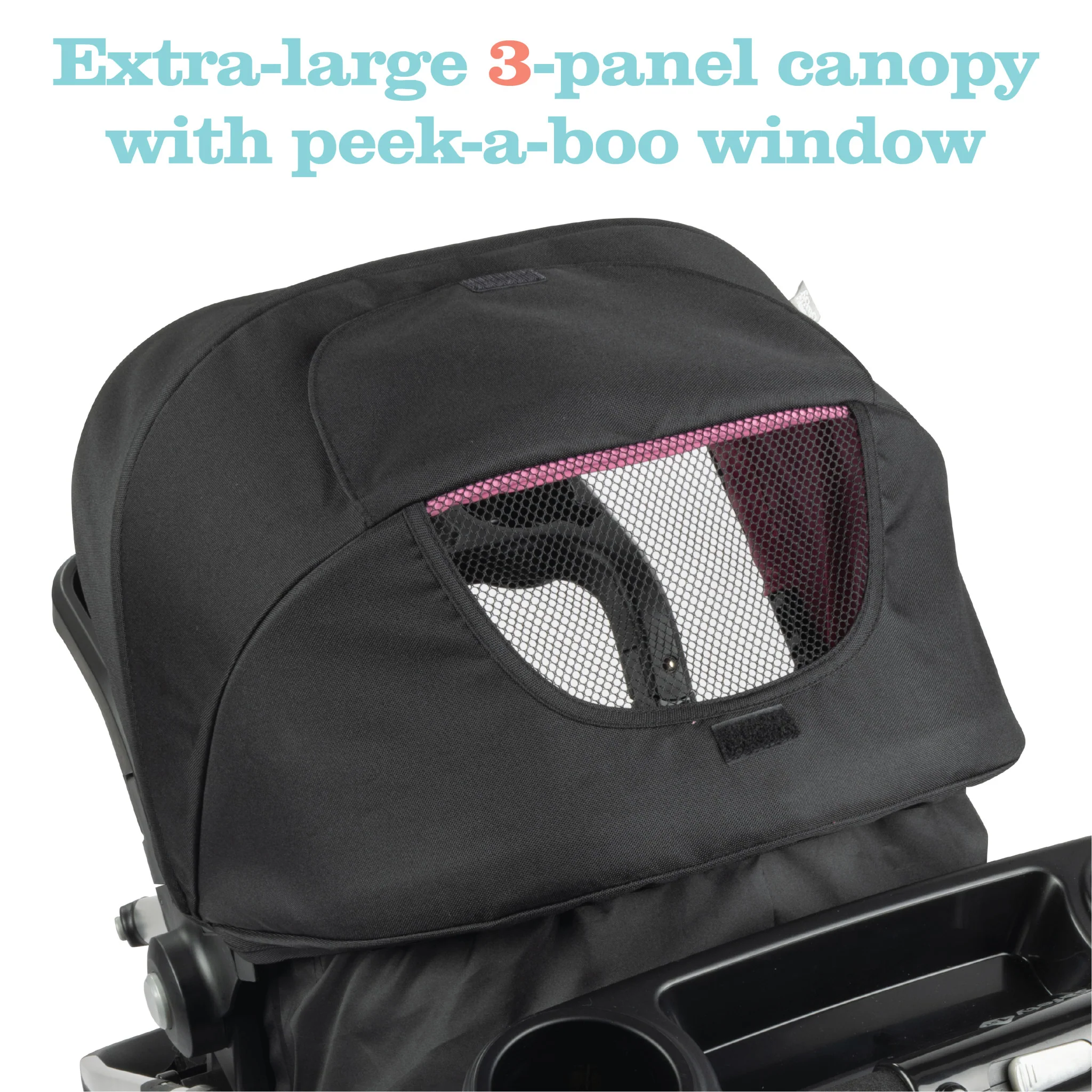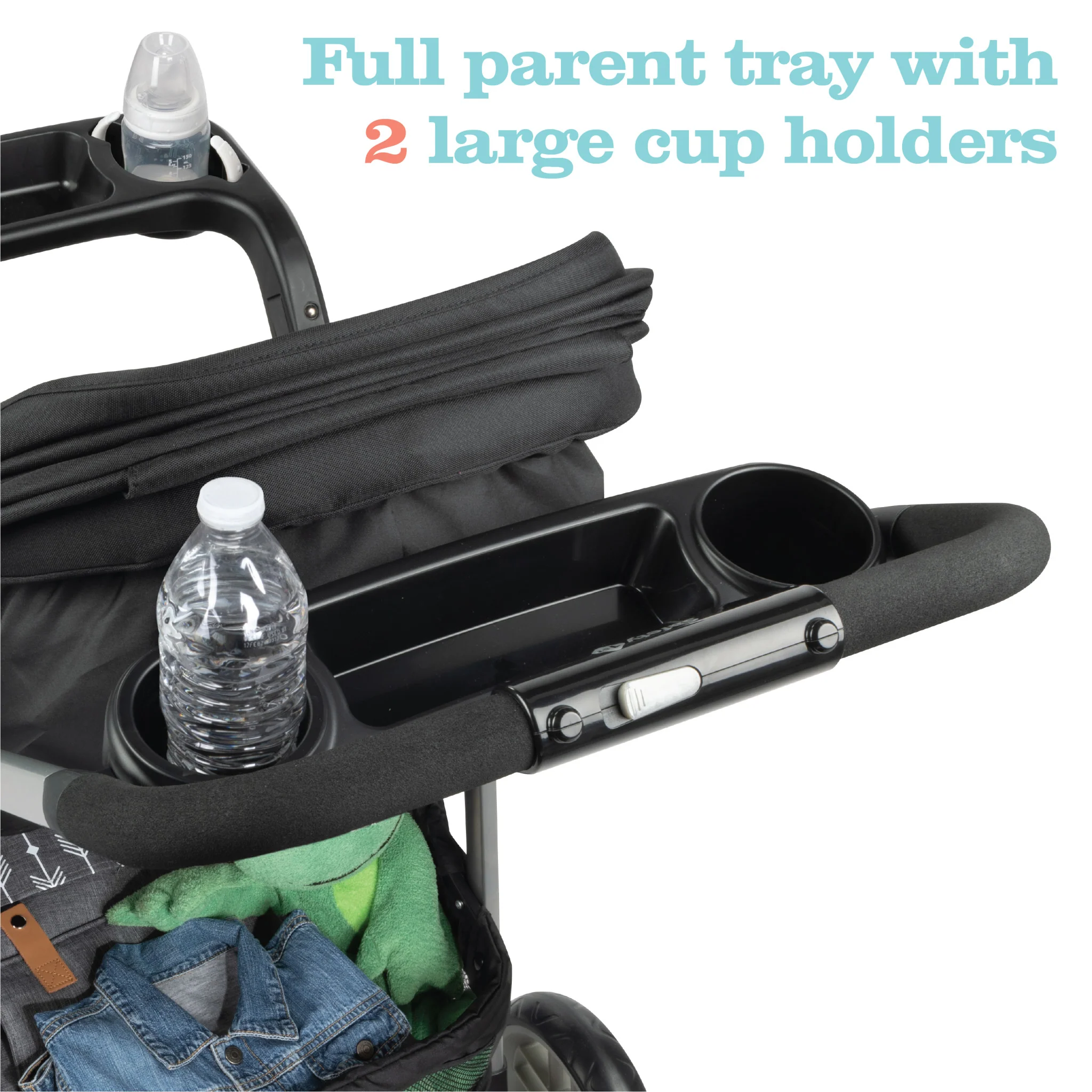 • storage basket and canopy, tray with two parent cup holders, child snack tray,