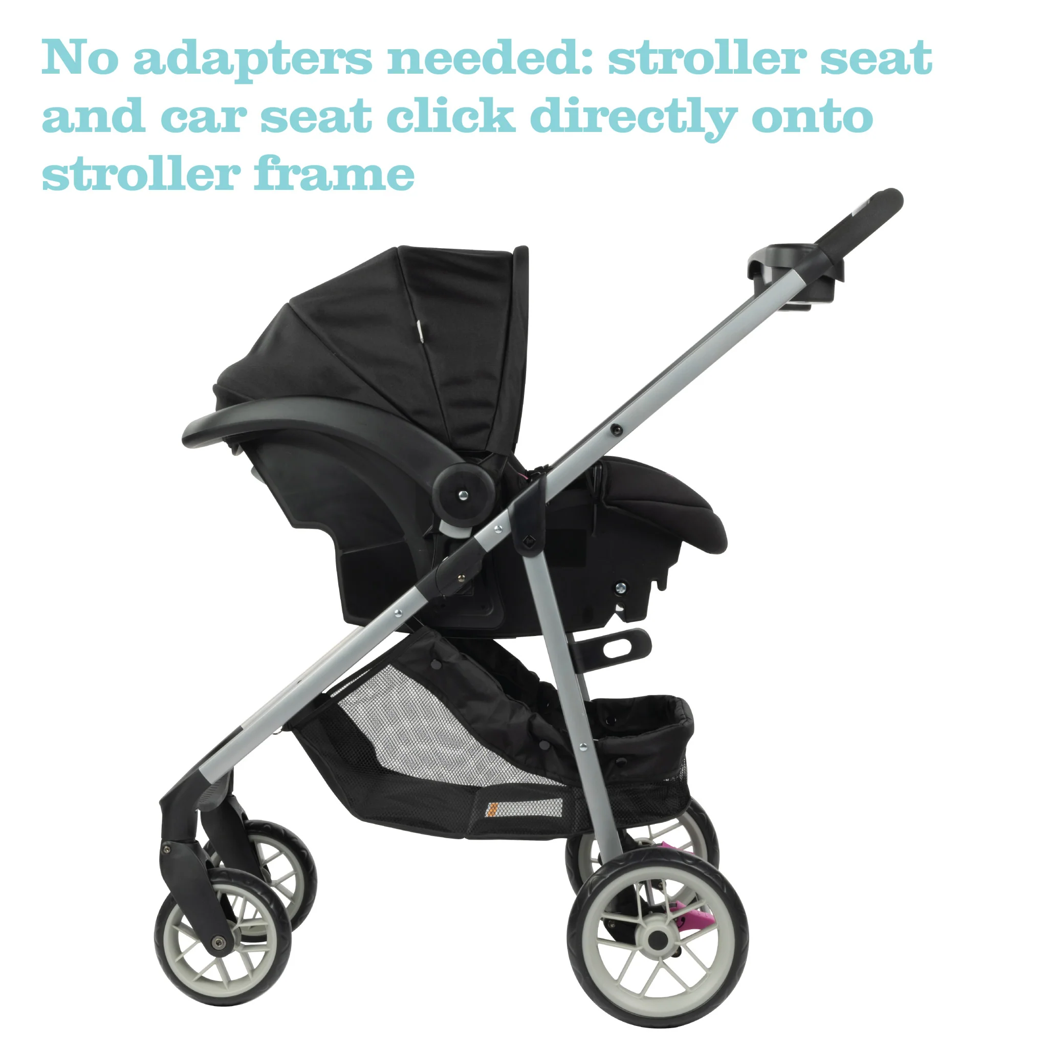 The car seat and stroller seat can be clicked into the stroller frame separately or together