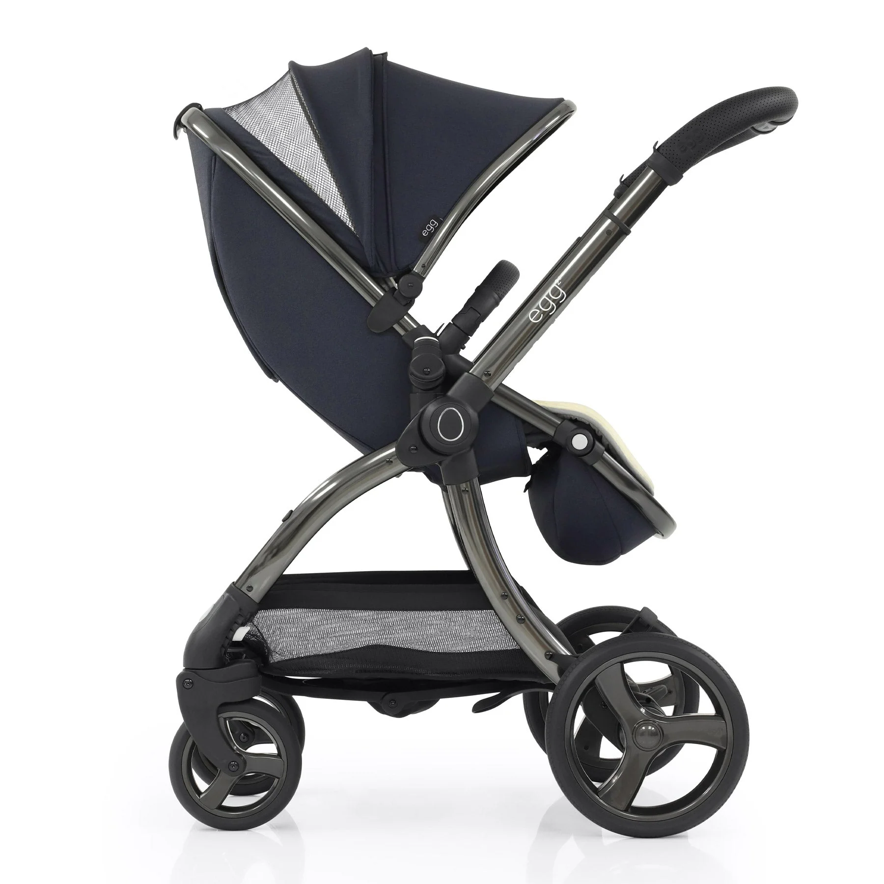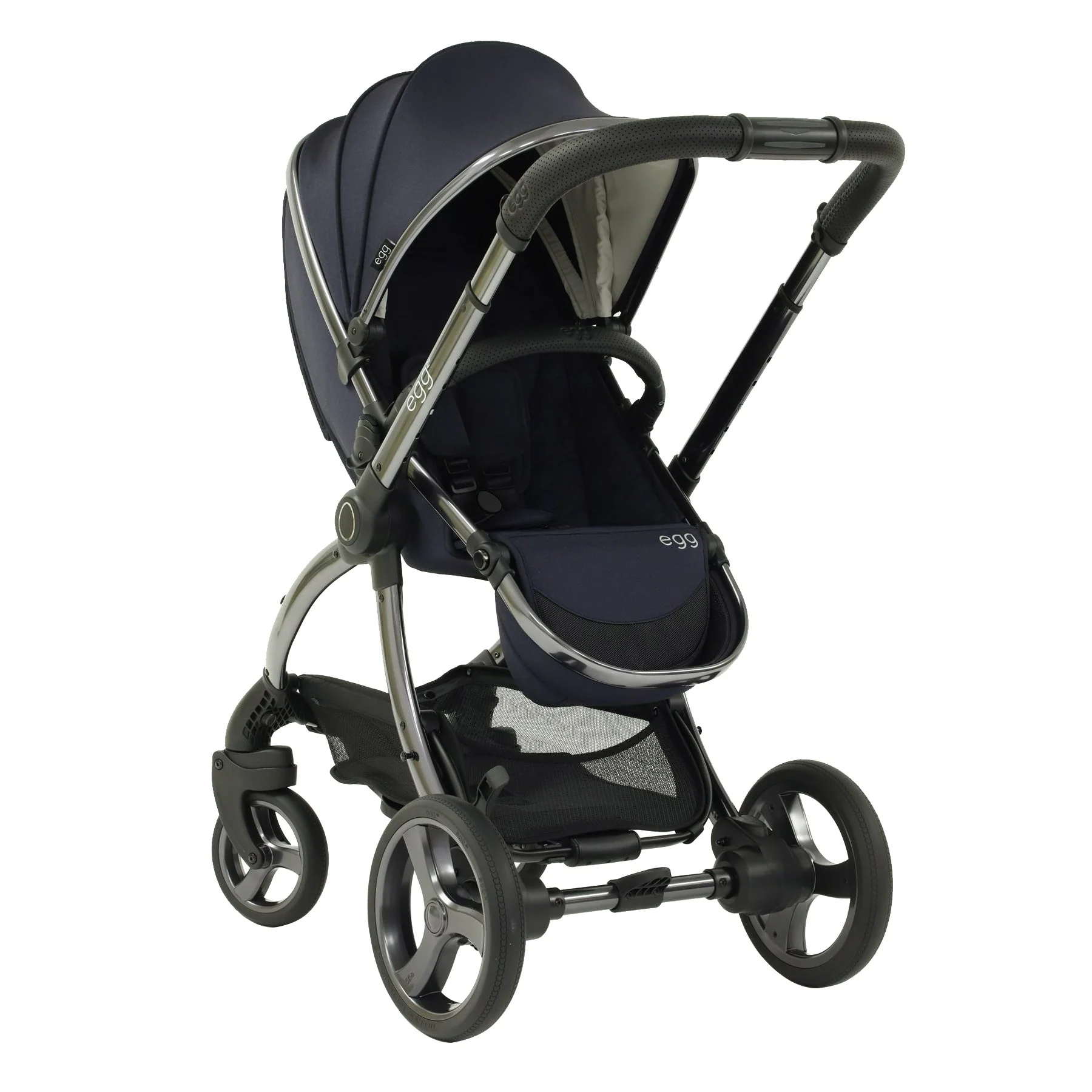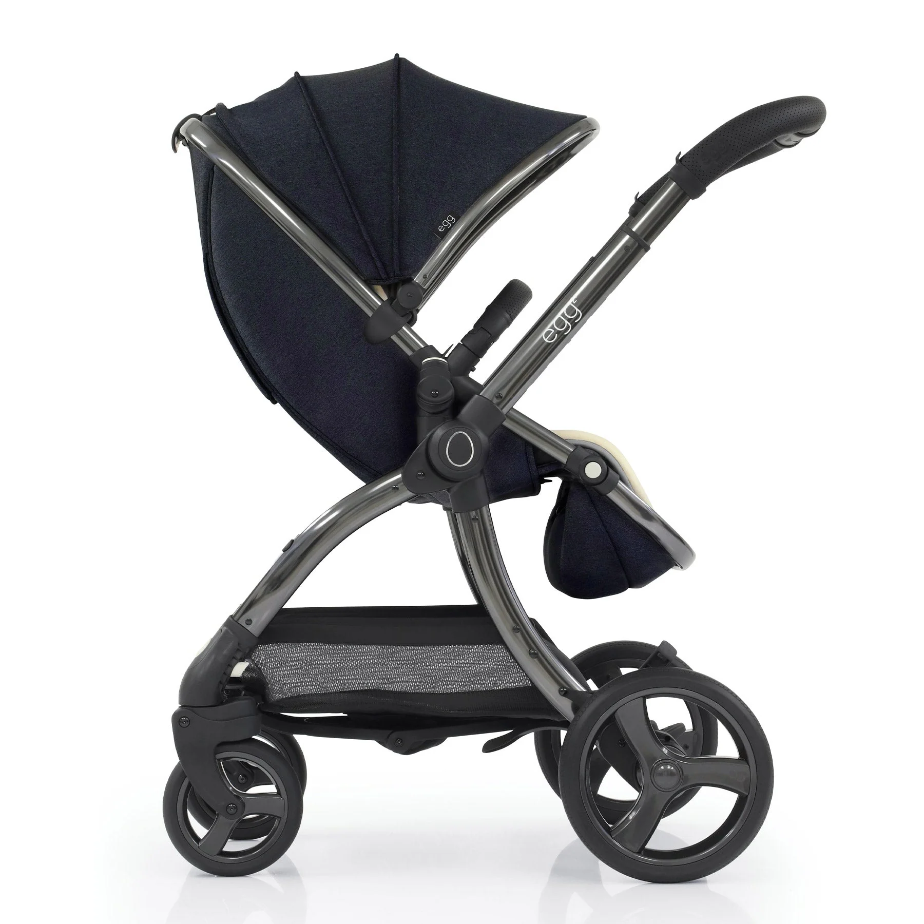 Soft-touch tailored marl fabrics delicately dress a striking gunmetal chassis, whilst a luxury handstitched handle and bumper bar in black perforation and traditional egg® signatures finish Cobalt chicly.