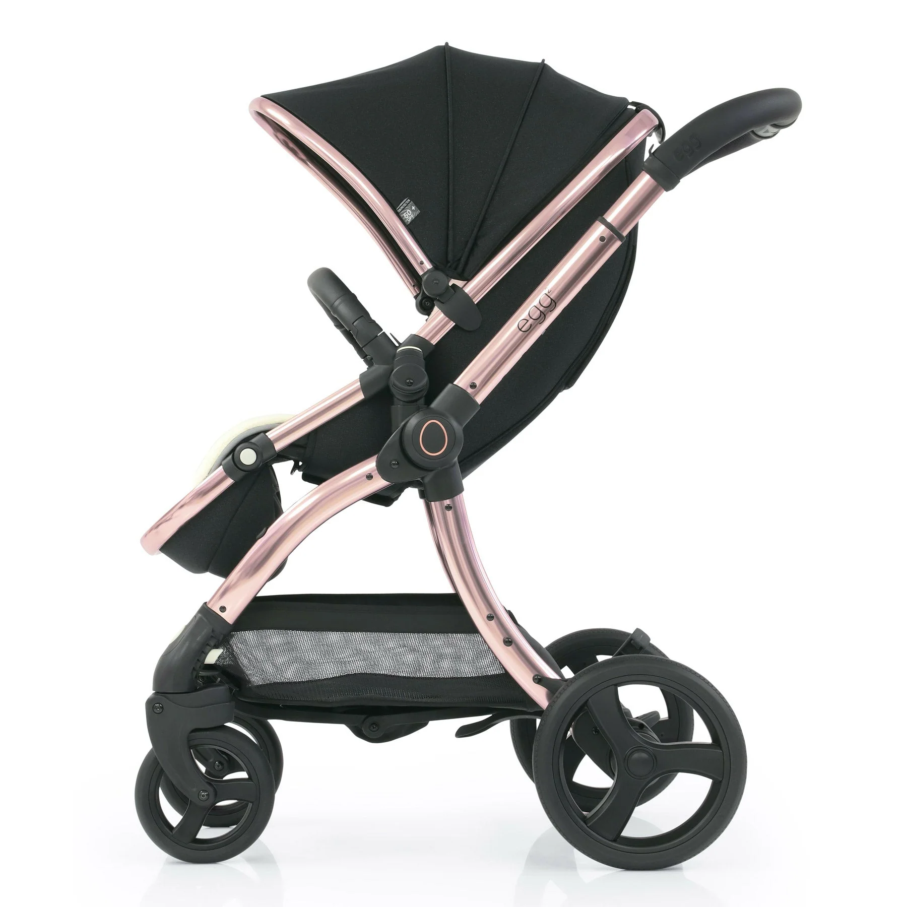 Black glitter dust fabrics delicately dress a stunning rose gold chassis with finesse, whilst a luxury handstitched handle and bumper bar in premium black and traditional egg® signatures finish Diamond Black with panache.