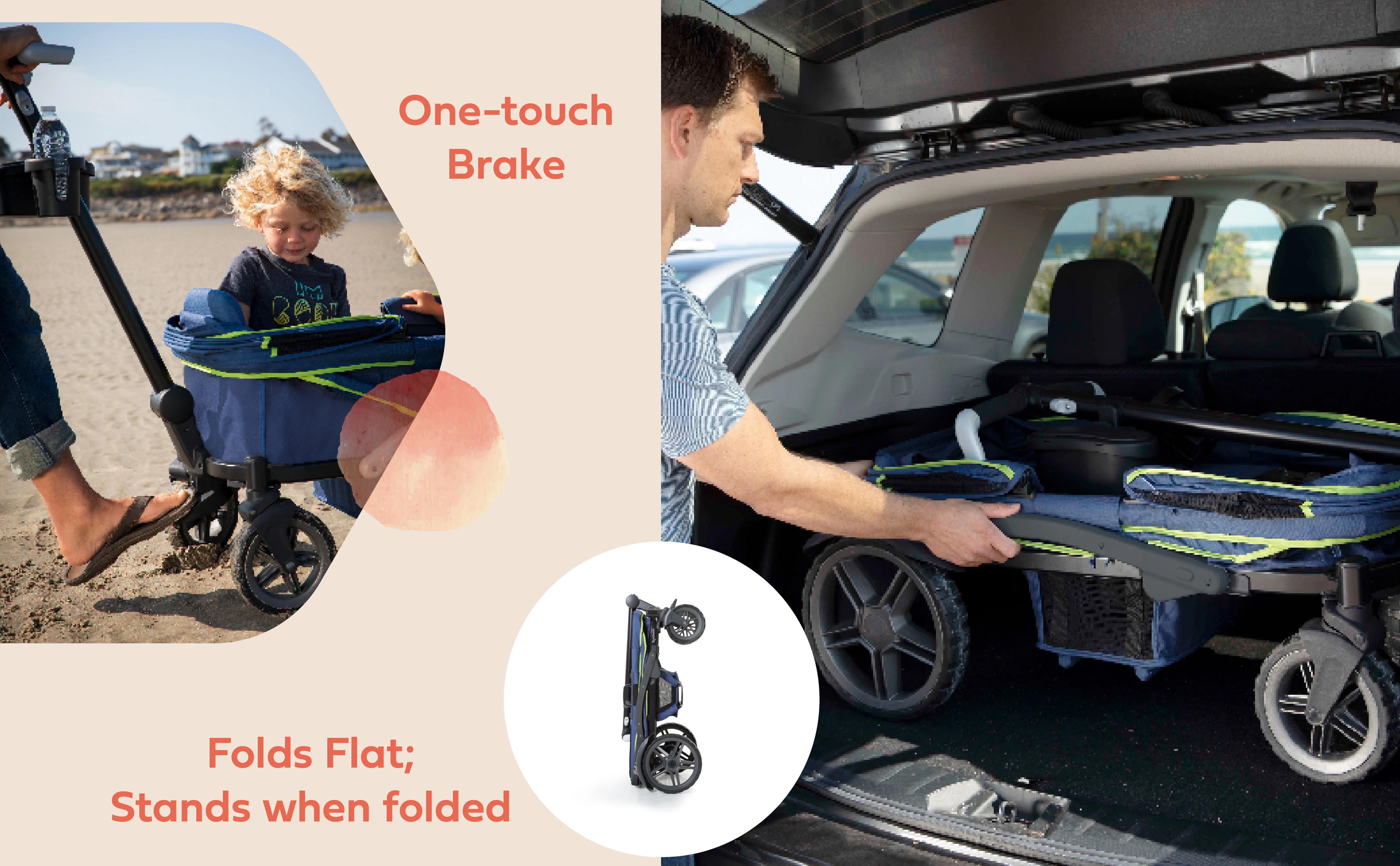 This stroller wagon is a stylish and functional option for getting around with your little ones. It's equipped with rugged wheels and a sturdy frame for tackling all types of terrain, and comes with two XL canopies, a parent cup holder, and lounge pad. The Anthem2 also folds flat and can be used with an infant car seat when you purchase our universal adapter (sold separately).