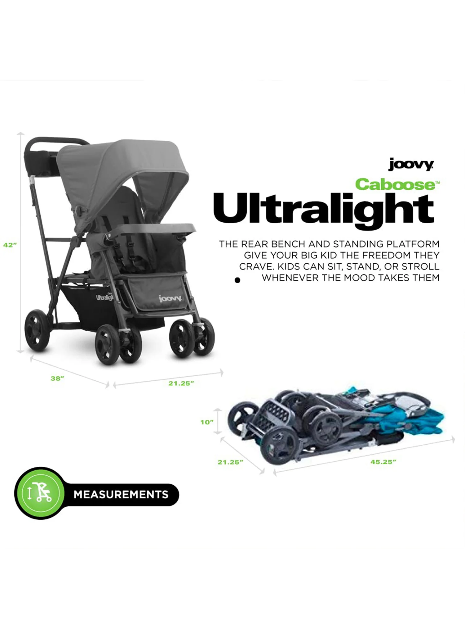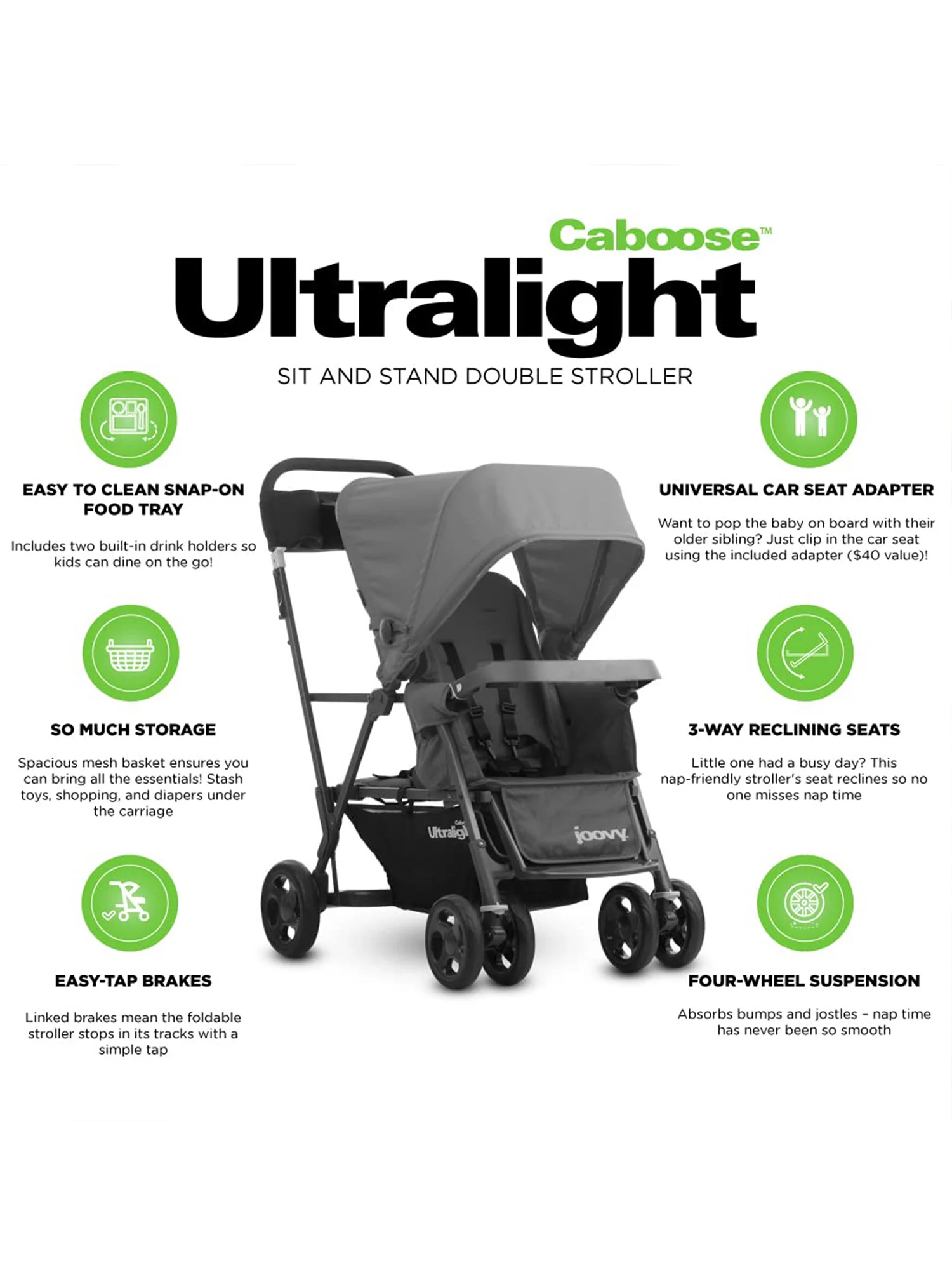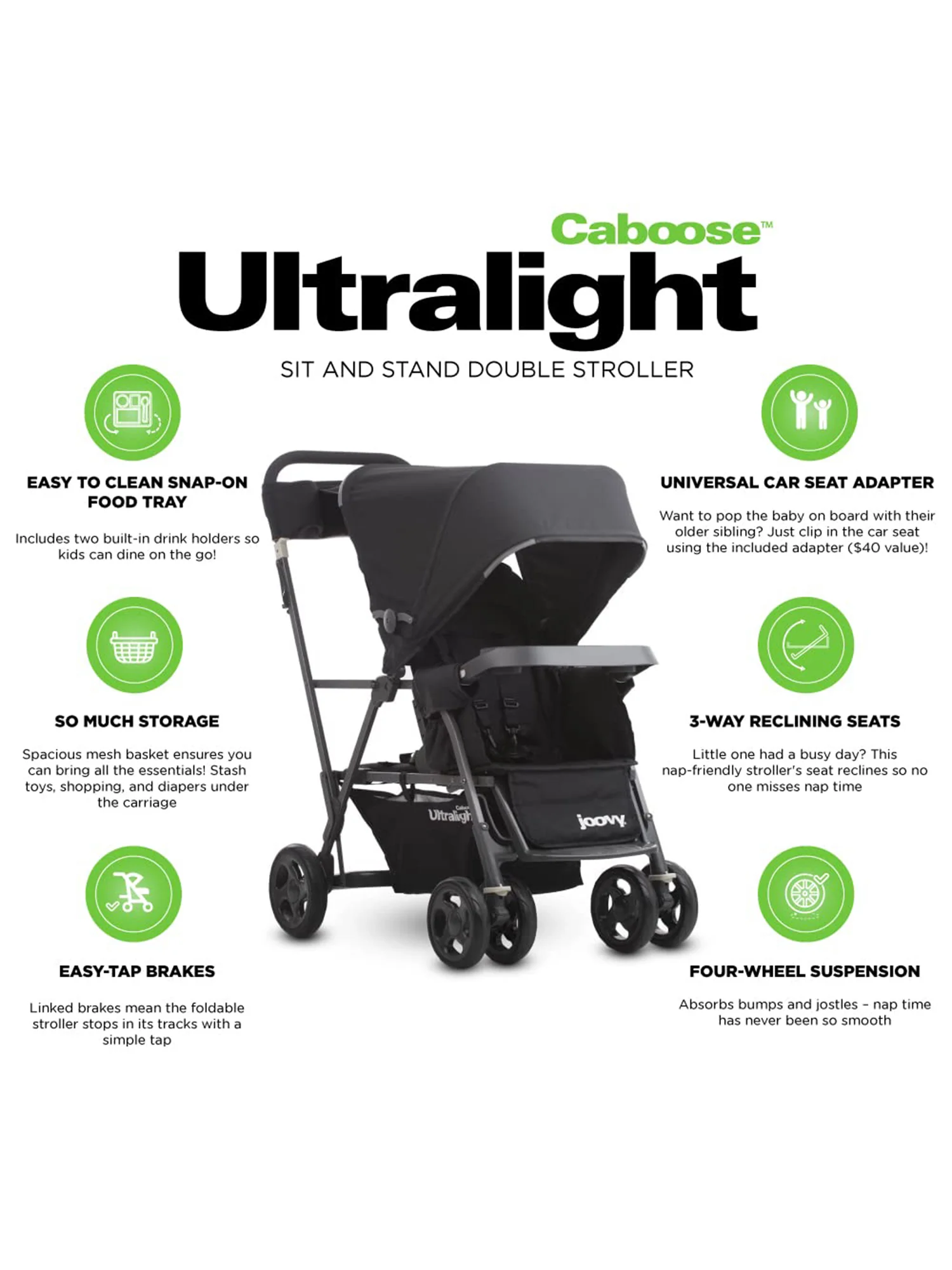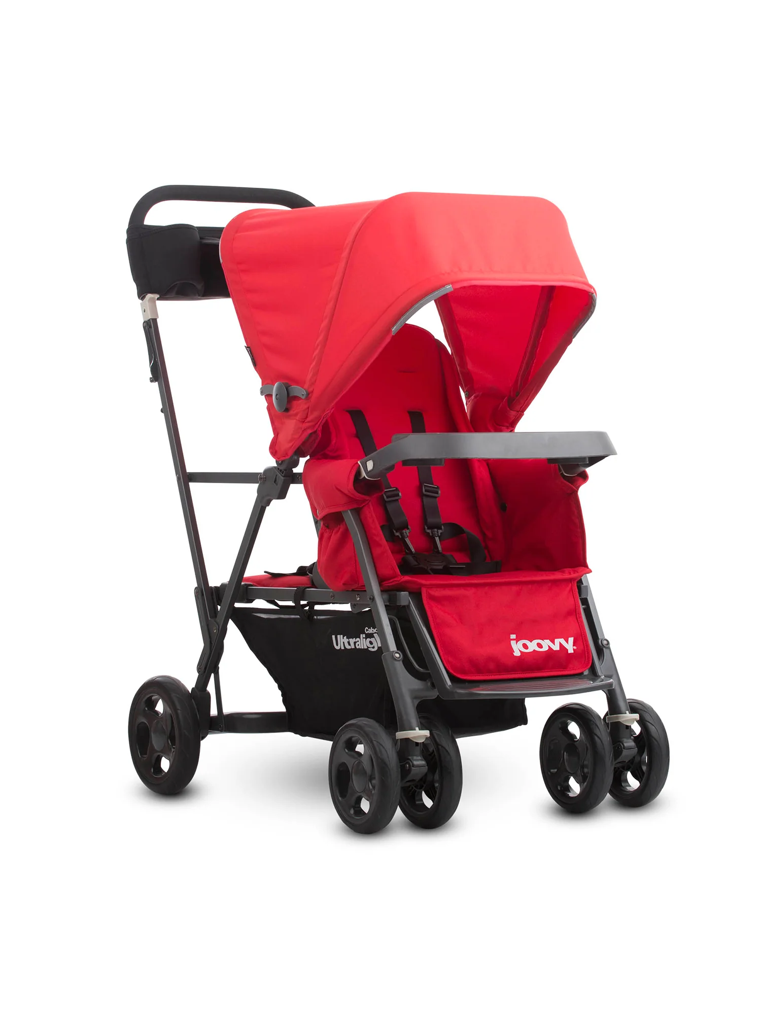 The joovy Caboose Ultralight is built with the same functionality as the Caboose but with a super-light aluminum frame…weighs 4 lbs. less with the same 90 lbs. weight capacity. It’s ideal for all children – from newborn to 45 lbs. without compromising on trunk space.