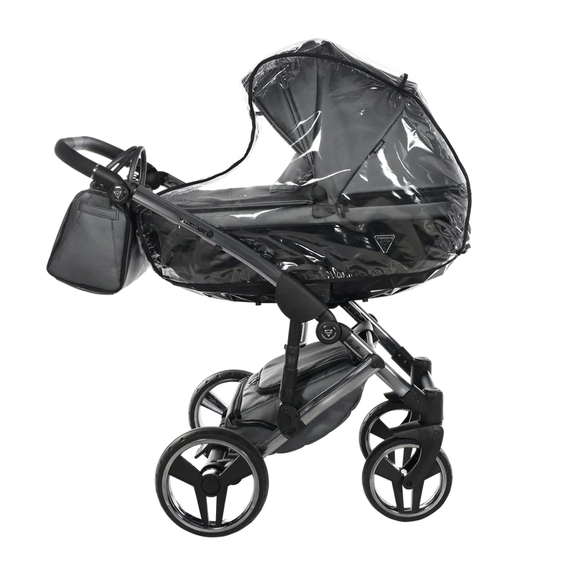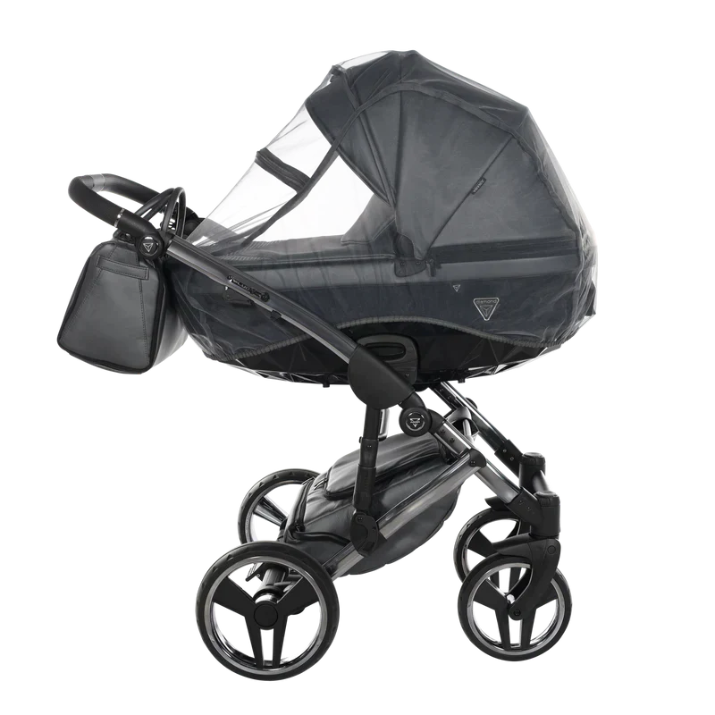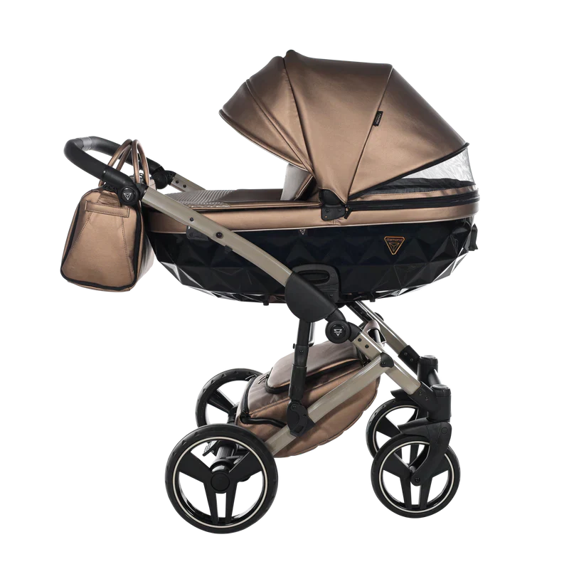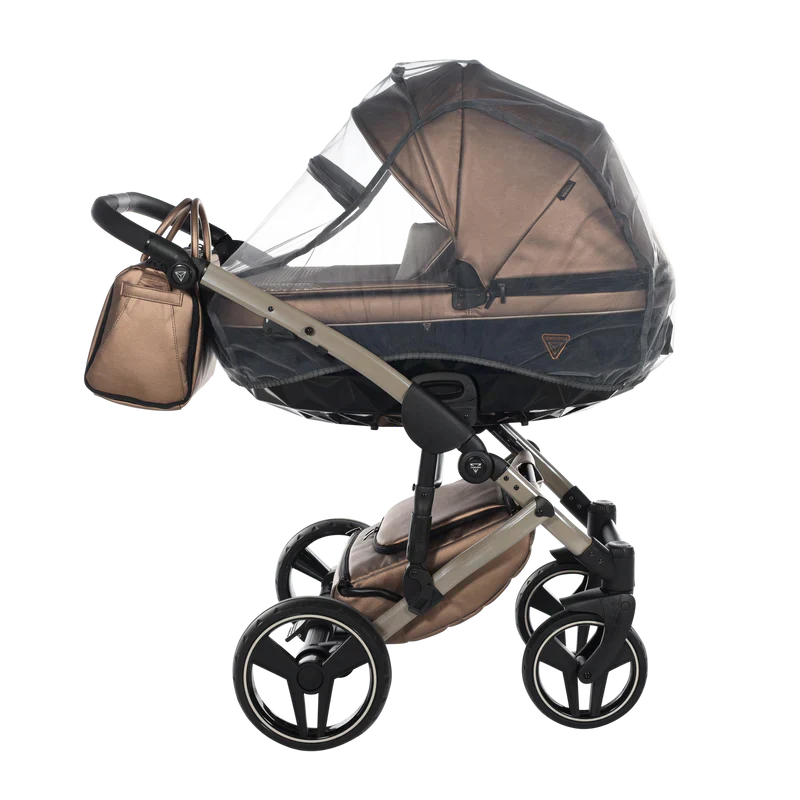 - Each pram includes the chassis, the carry-cot bassinet, as well as the seated unit, the beautiful Mommy bag in coordinating colors, a rain cover, mosquito net, cup holder, sunshade, and changing mat. A built-in foot cover is also included.