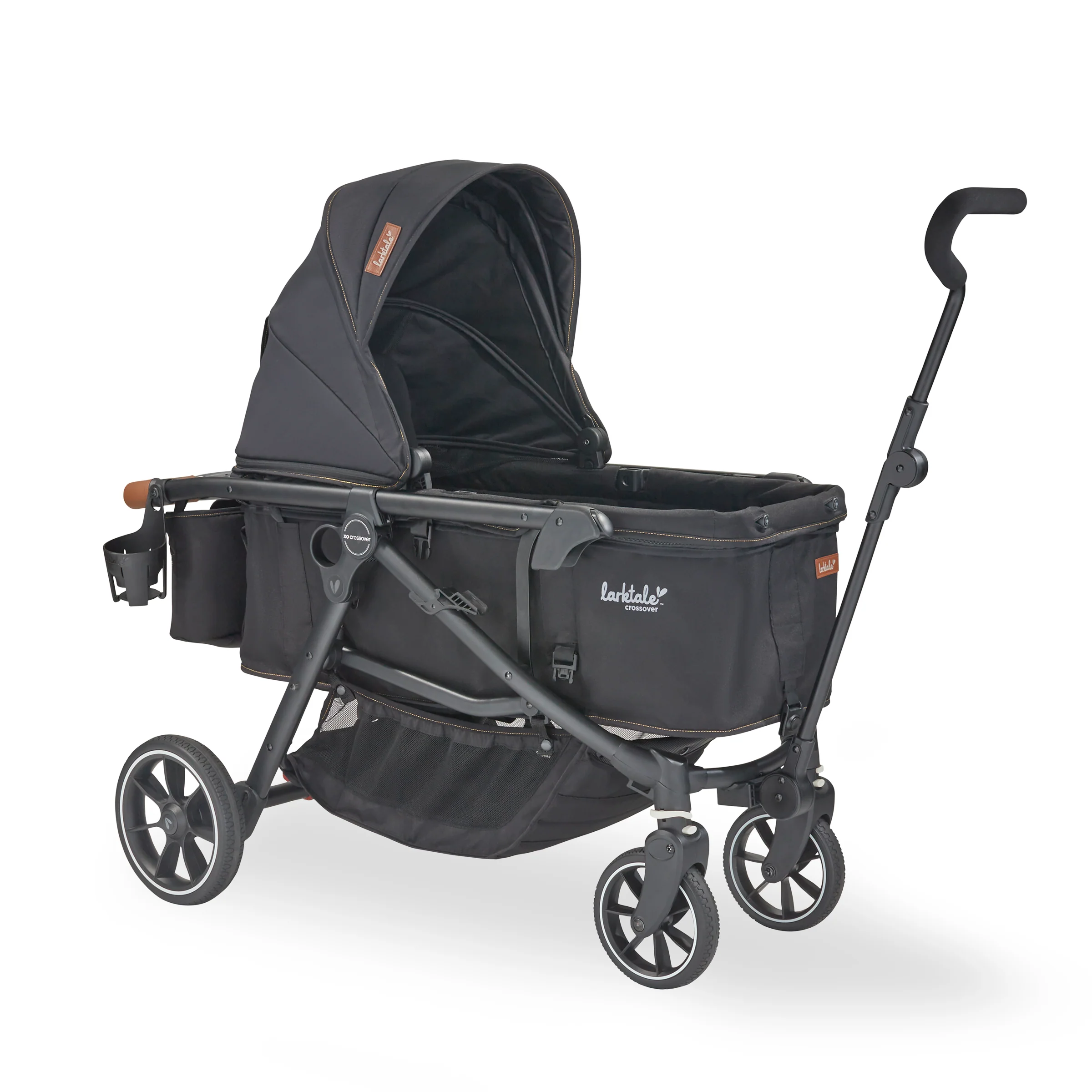 Redefining the stroller/wagon category, the Larktale crossover™ is a first-of-its-kind convertible stroller/wagon. Starting as a full-featured single stroller that’s suitable for a newborn, the crossover™ converts quickly and easily into a single or double-seater pull wagon. Parents no longer need to choose between a traditional stroller and a stroller/wagon, or invest in multiple products – the crossover™ truly combines both into one easy to use device without compromising on features. No tools or separate conversion kits are needed to complete the transition, making it easy for parents to change their strolling style to suit the day’s activities. Beyond the flexibility of this all-in-one stroller-to-wagon innovation, parents will also love the extra large sun canopy with air-flow panel and peek-a-boo window, a stroller organizer console on the leatherette handlebar, an included cup holder, leatherette wrapped bumper bar and snack tray; a mesh cargo divider for sectioning off the chassis; all-wheel suspension and plenty of storage space. The stylish crossover™ is suitable for children from birth to 50 lbs in stroller mode or from 6 months to 50 lbs per seat in double-wagon mode, and a car seat adapter is available (sold separately) to accommodate a newborn. The compact fold of the crossover™ allows this all-in-one stroller and wagon to be easily stored and transported.