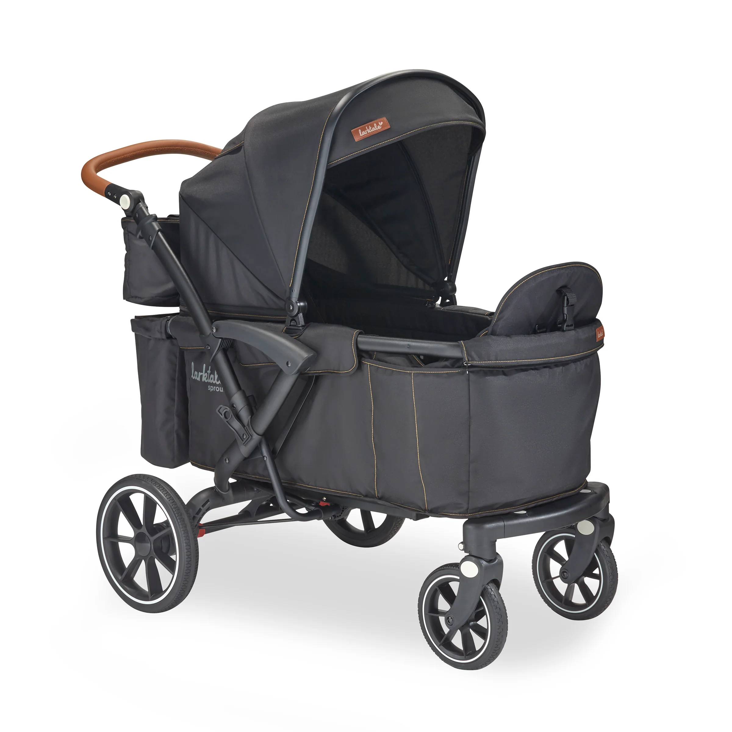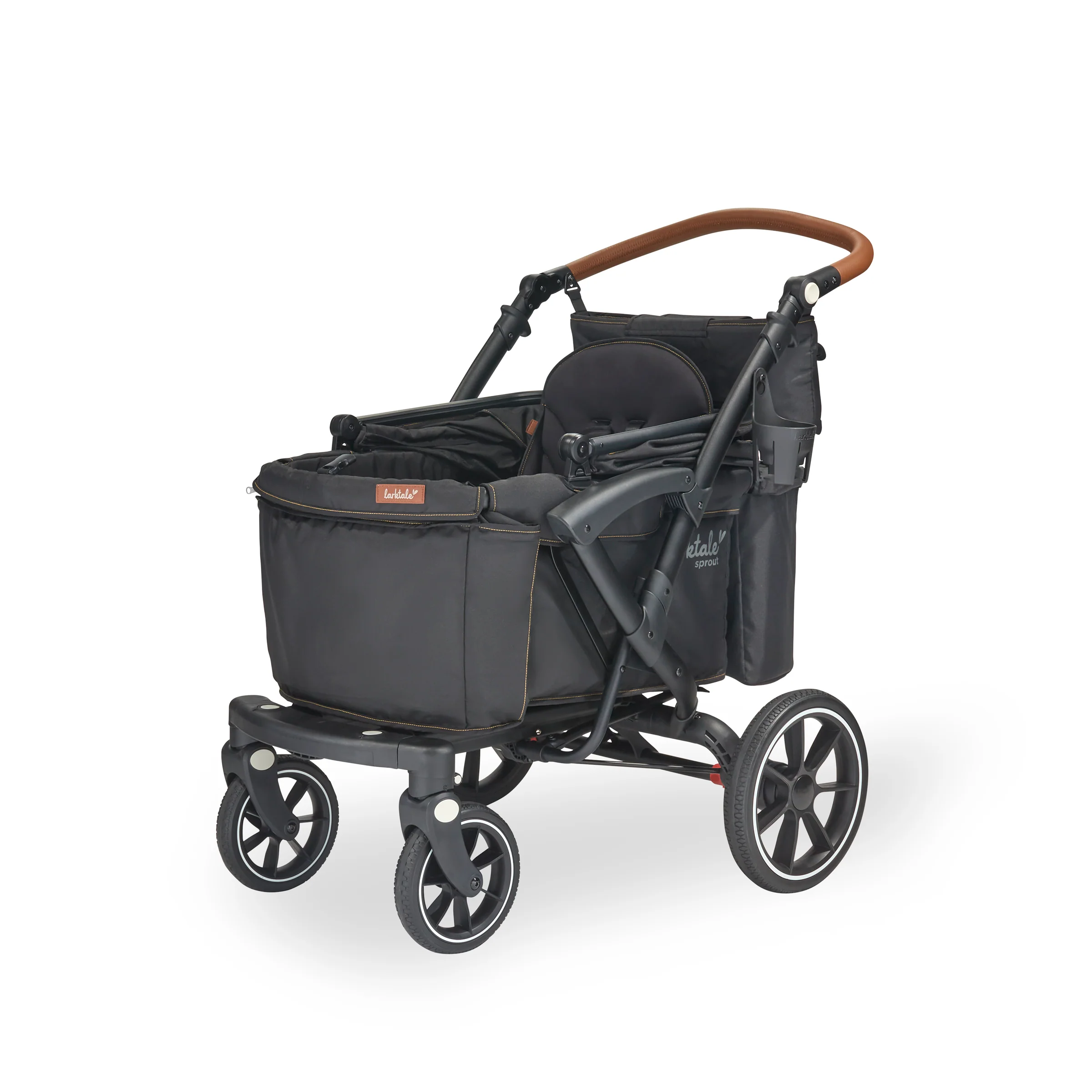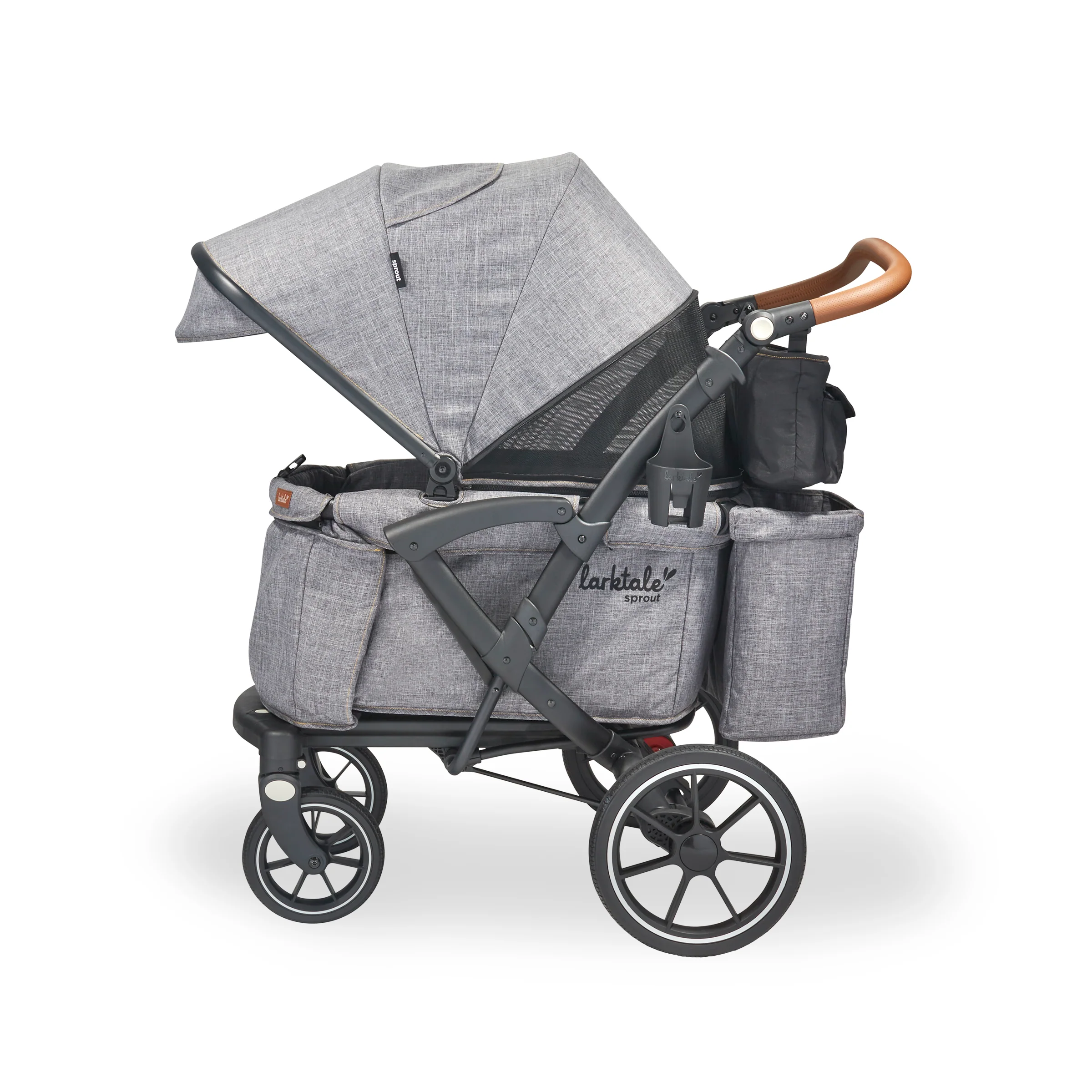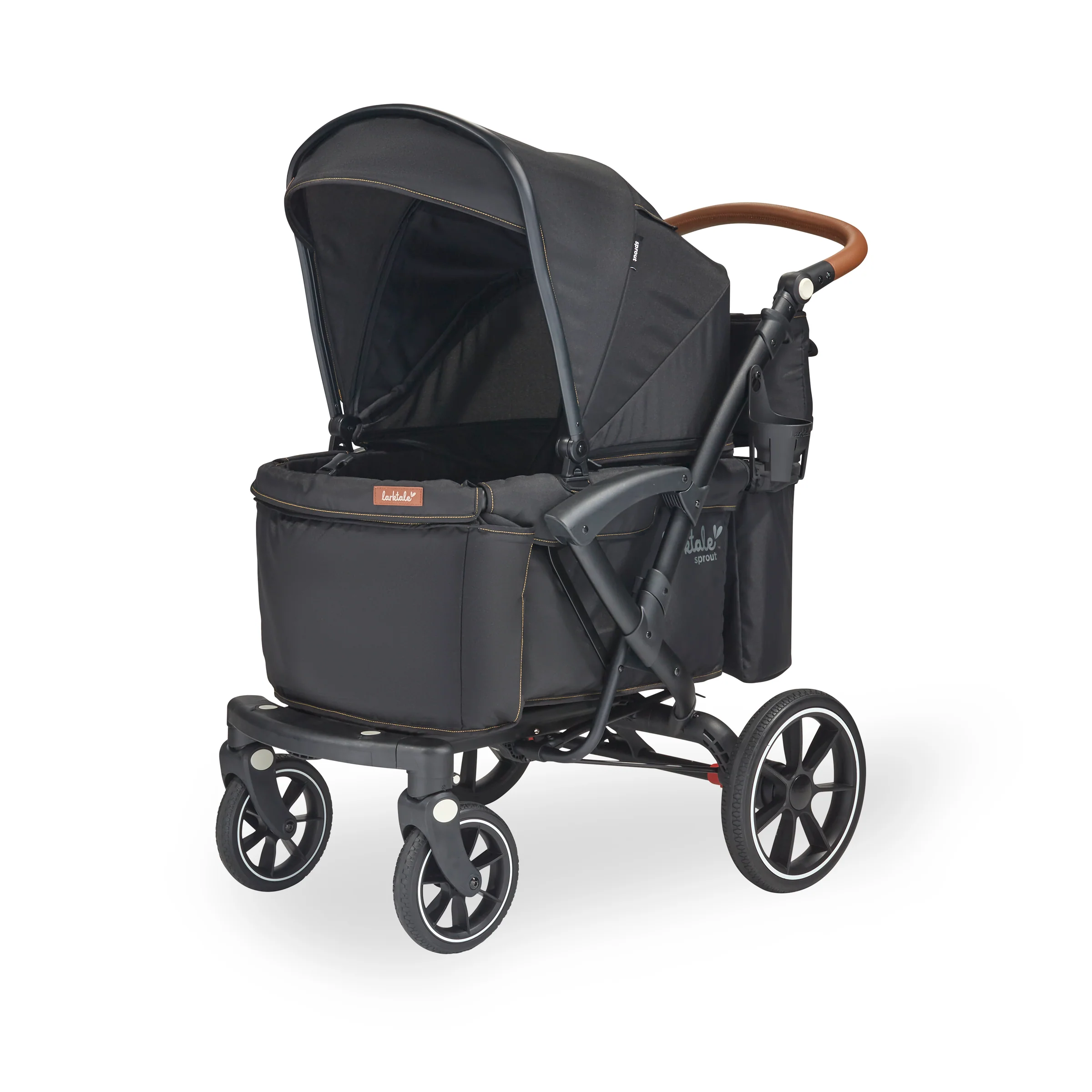 The Larktale sprout™ V2 Single-to-Double Stroller/Wagon is a stylish, first of its kind, size-adjustable wagon, designed for families living in metropolitan areas or have limited space in their home. The sprout is a compact single-seater wagon that parents can expand into a double-sized wagon with no tools or conversion kits needed. With the sprout, parents have the option to select the right size chassis for their activity: Need extra cargo space or to add a seat for an extra kid? Simply expand the sprout wagon chassis to make room for it all. Dropping off one kid at a playdate before running errands with the other? Shorten the sprout wagon chassis to make strolling with one kid a little more practical. All conversions can be completed in 5 seconds or less in this innovative stroller/wagon and everything you need is included. Beyond the innovative flexibility of the sprout, parents will also love the luxury styling, extra-large sun canopy with air-flow panel and peek-a-boo window, the large storage basket, cargo divider for when the second seat is not in use in double mode, included parent’s console, leatherette wrapped adjustable handlebar, and all-wheel suspension. Suitable for kids from 6 months to a combined kid/cargo weight of 120 lbs. The compact flat fold of the sprout allows the wagon to be easily stored and transported.