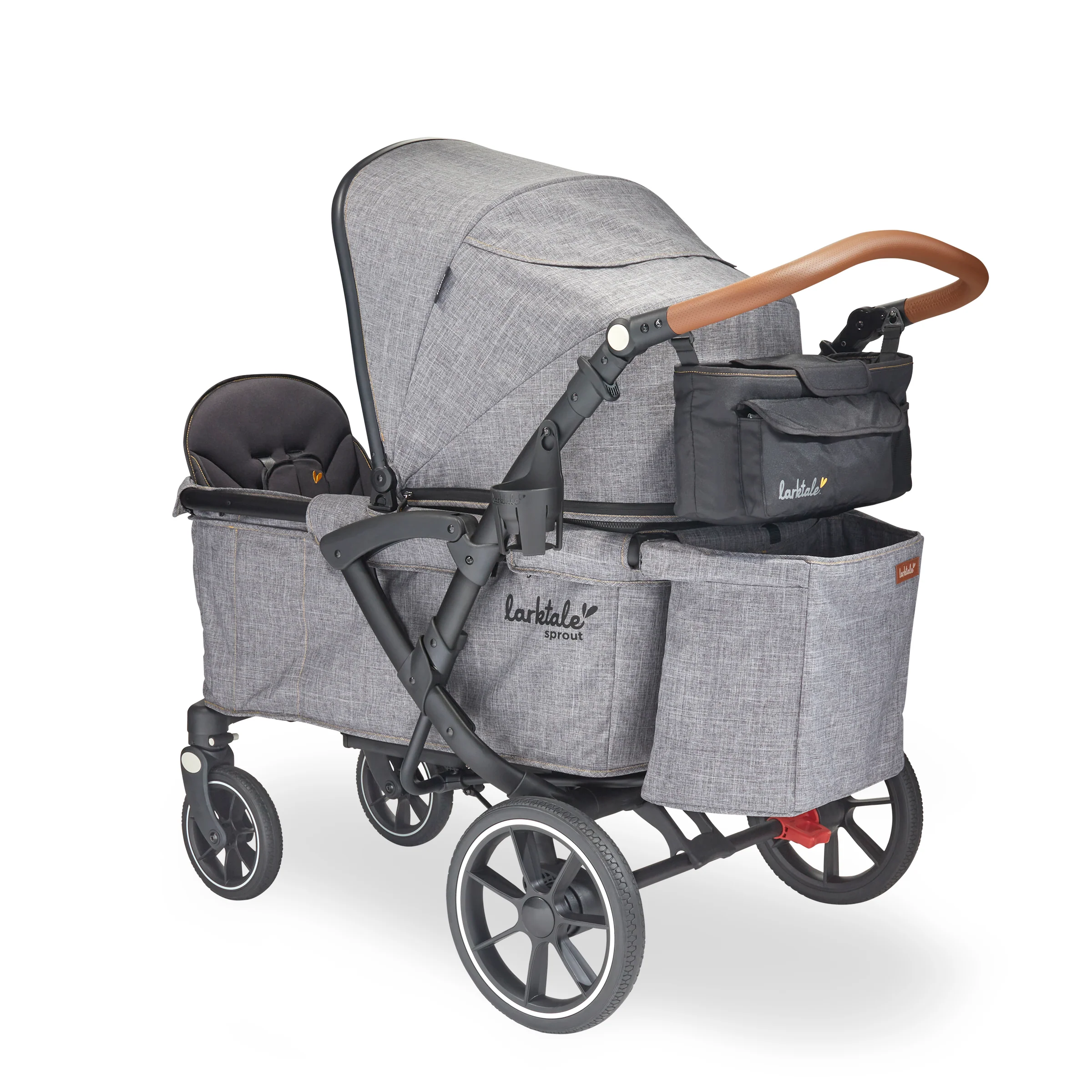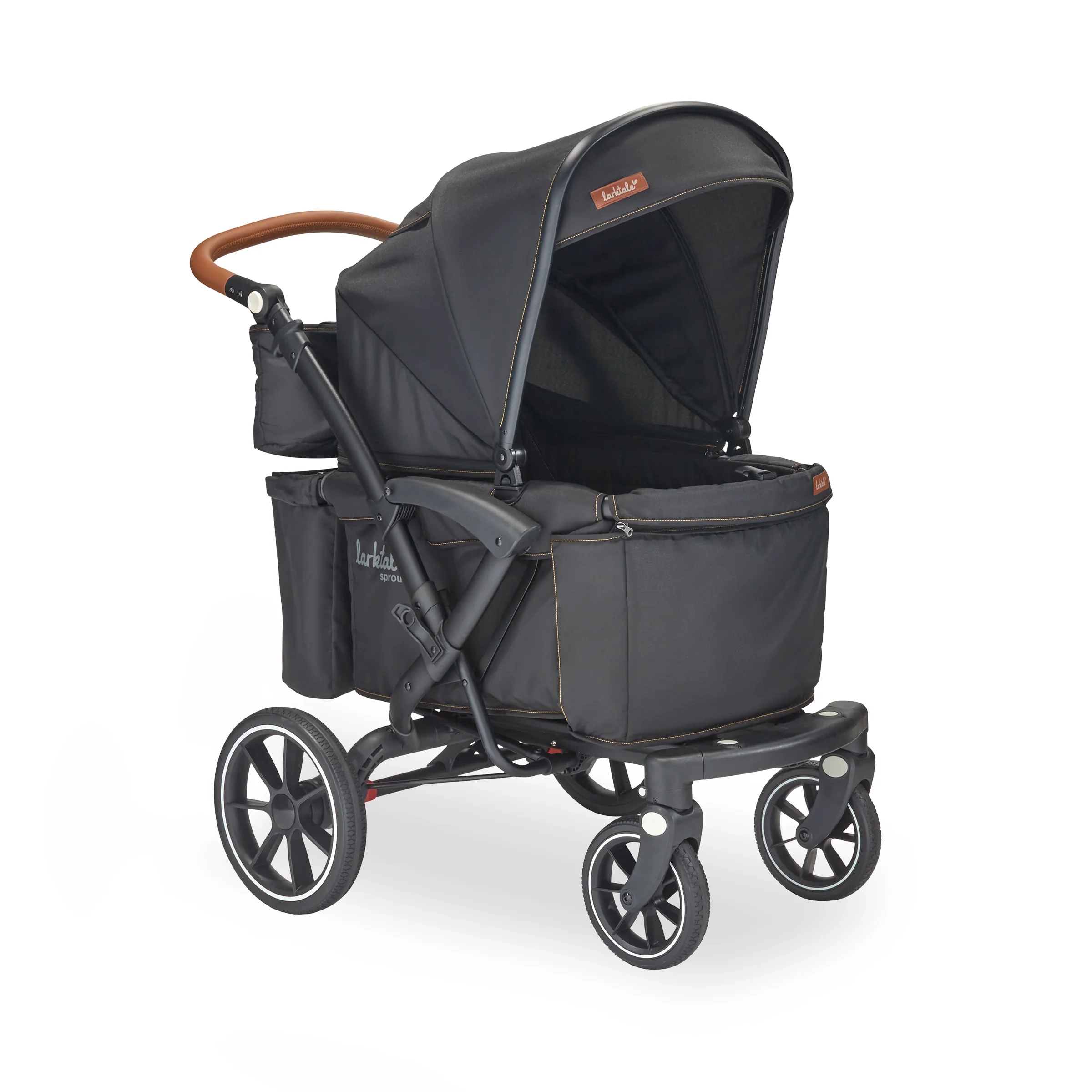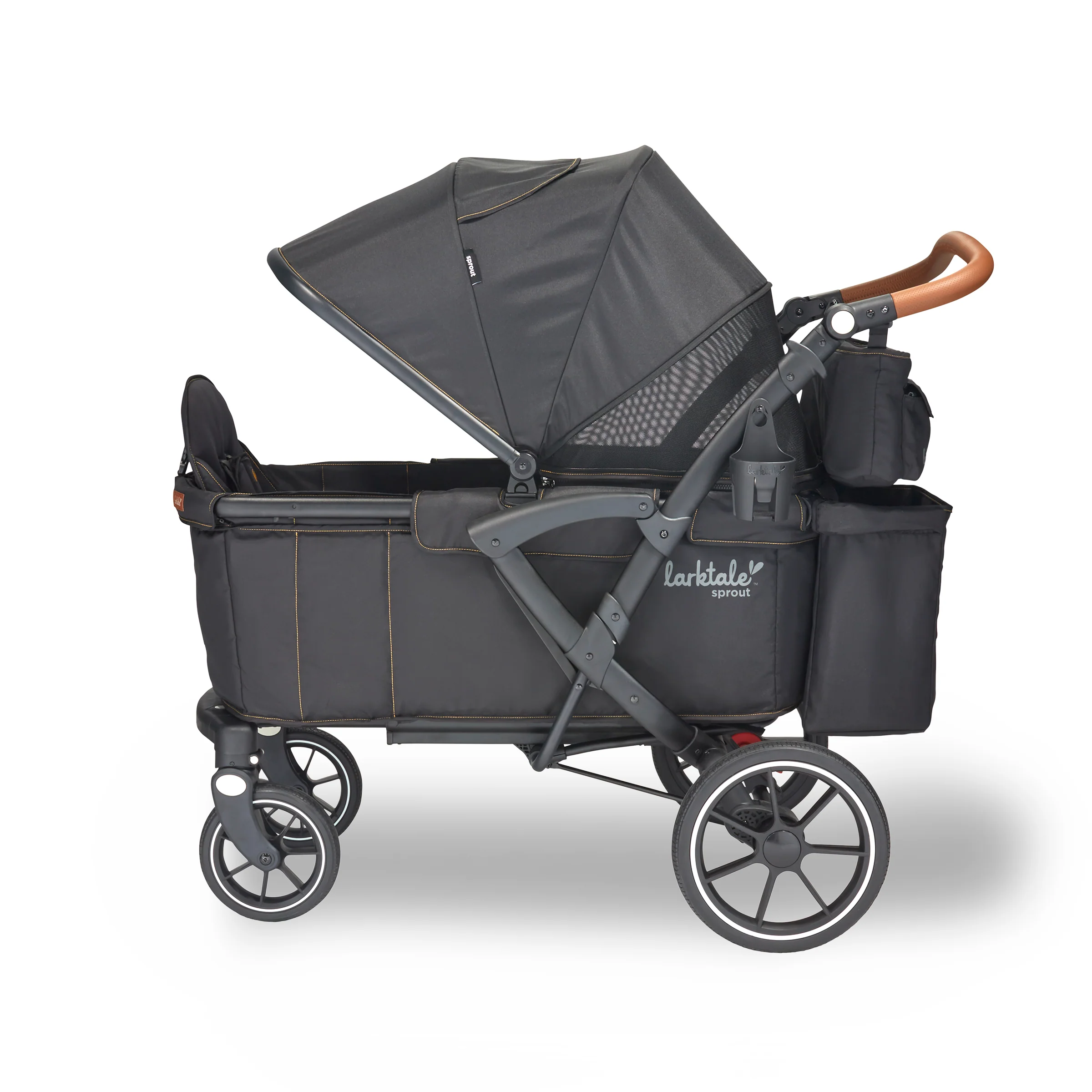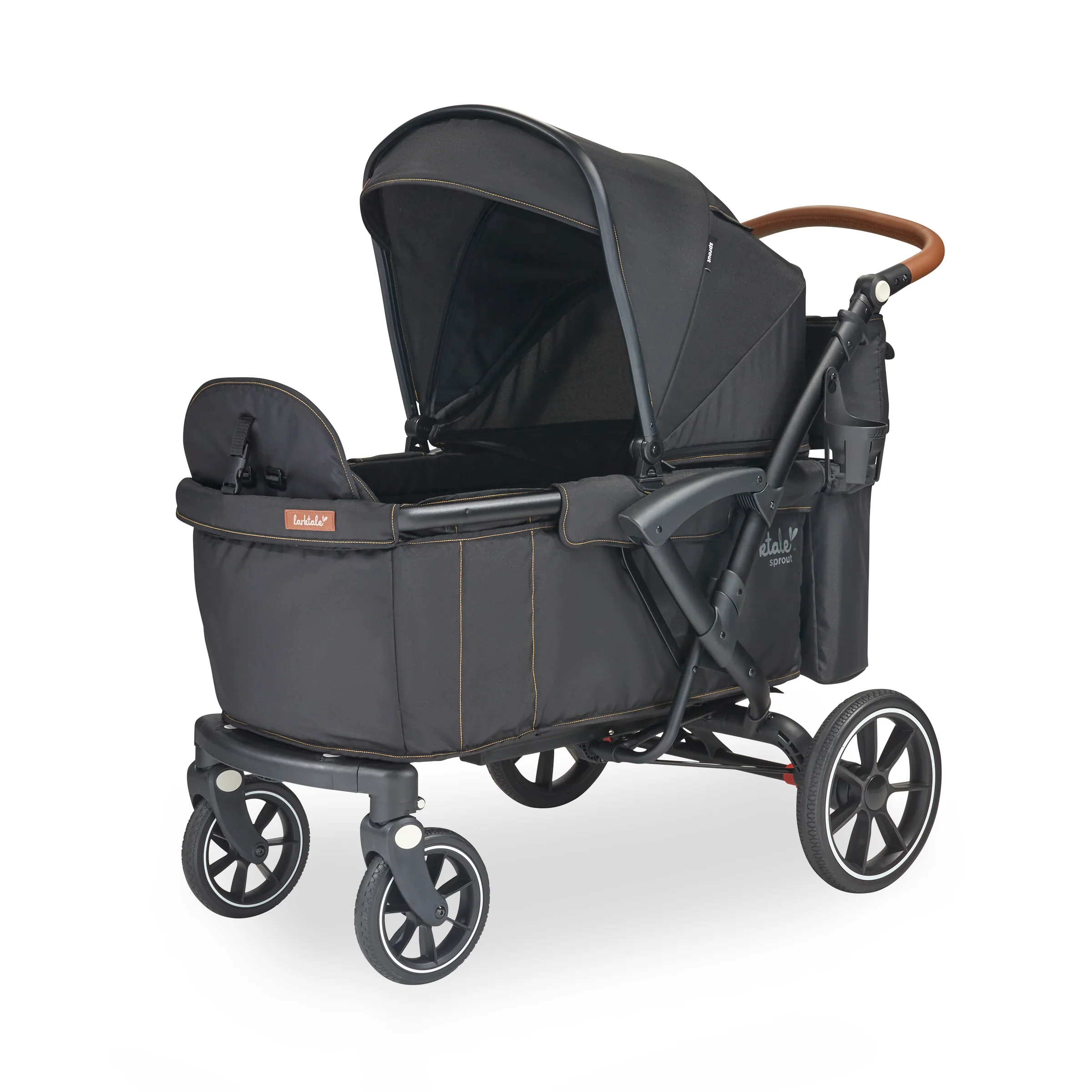 The Larktale sprout™ V2 Single-to-Double Stroller/Wagon is a stylish, first of its kind, size-adjustable wagon, designed for families living in metropolitan areas or have limited space in their home. The sprout is a compact single-seater wagon that parents can expand into a double-sized wagon with no tools or conversion kits needed. With the sprout, parents have the option to select the right size chassis for their activity: Need extra cargo space or to add a seat for an extra kid? Simply expand the sprout wagon chassis to make room for it all. Dropping off one kid at a playdate before running errands with the other? Shorten the sprout wagon chassis to make strolling with one kid a little more practical. All conversions can be completed in 5 seconds or less in this innovative stroller/wagon and everything you need is included. Beyond the innovative flexibility of the sprout, parents will also love the luxury styling, extra-large sun canopy with air-flow panel and peek-a-boo window, the large storage basket, cargo divider for when the second seat is not in use in double mode, included parent’s console, leatherette wrapped adjustable handlebar, and all-wheel suspension. Suitable for kids from 6 months to a combined kid/cargo weight of 120 lbs. The compact flat fold of the sprout allows the wagon to be easily stored and transported.