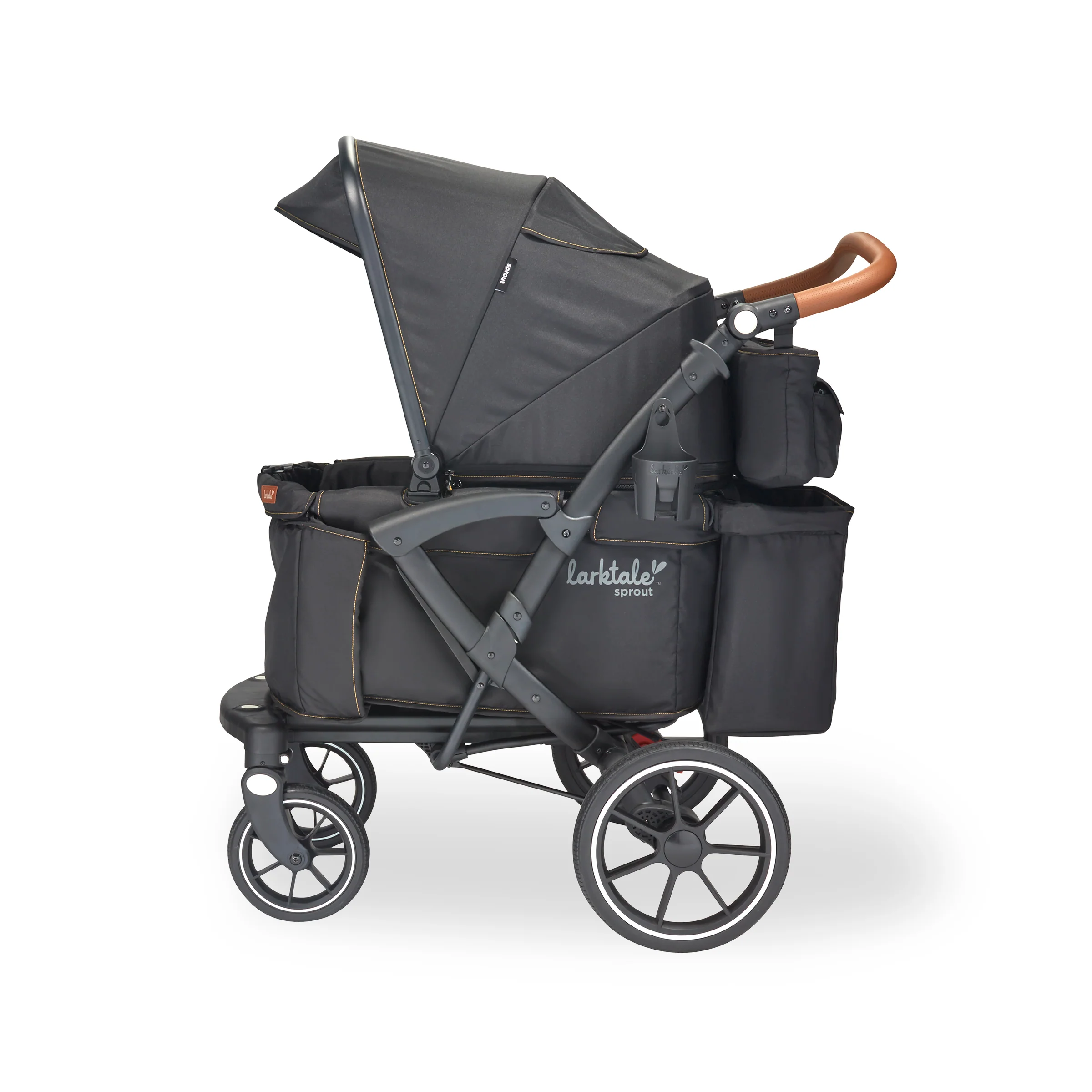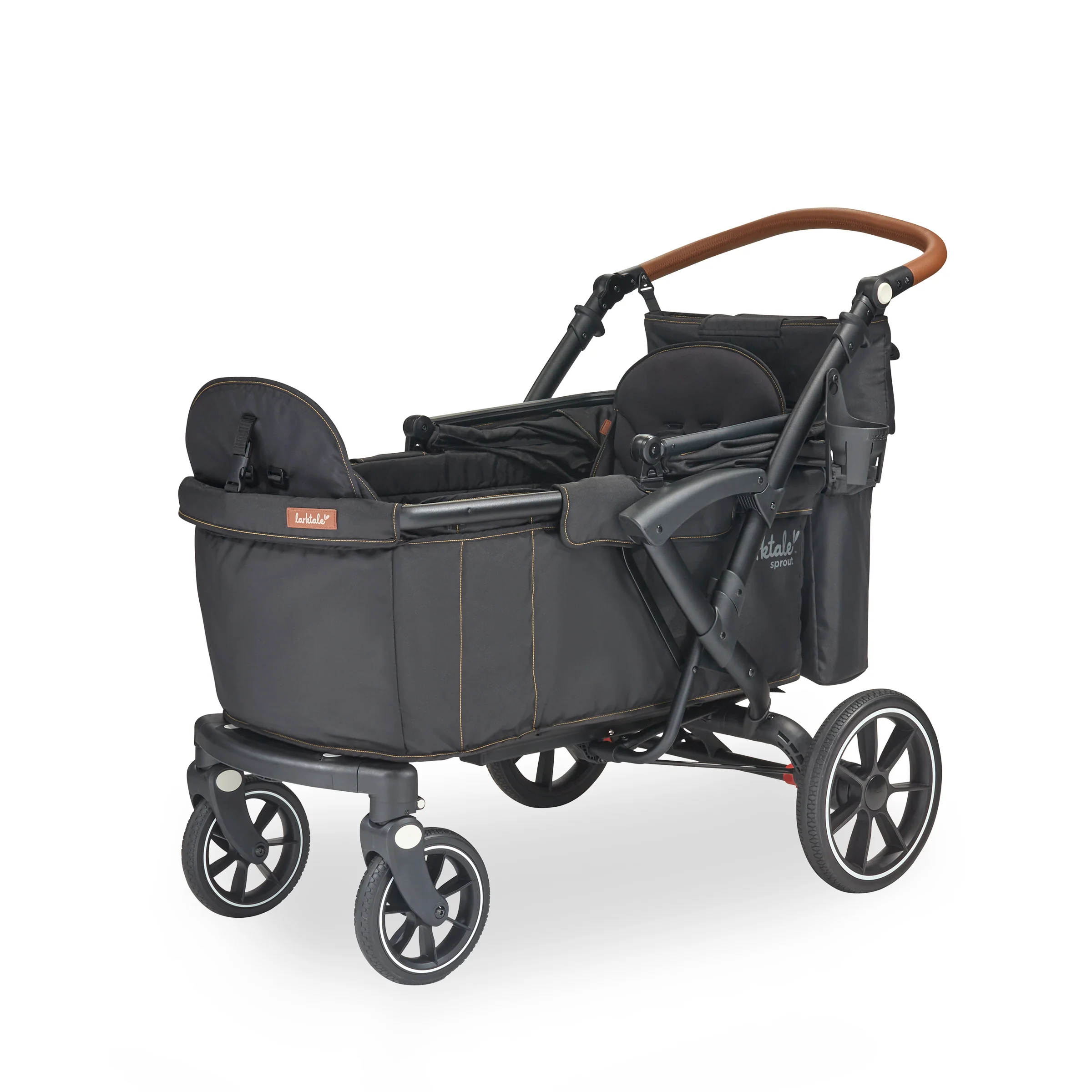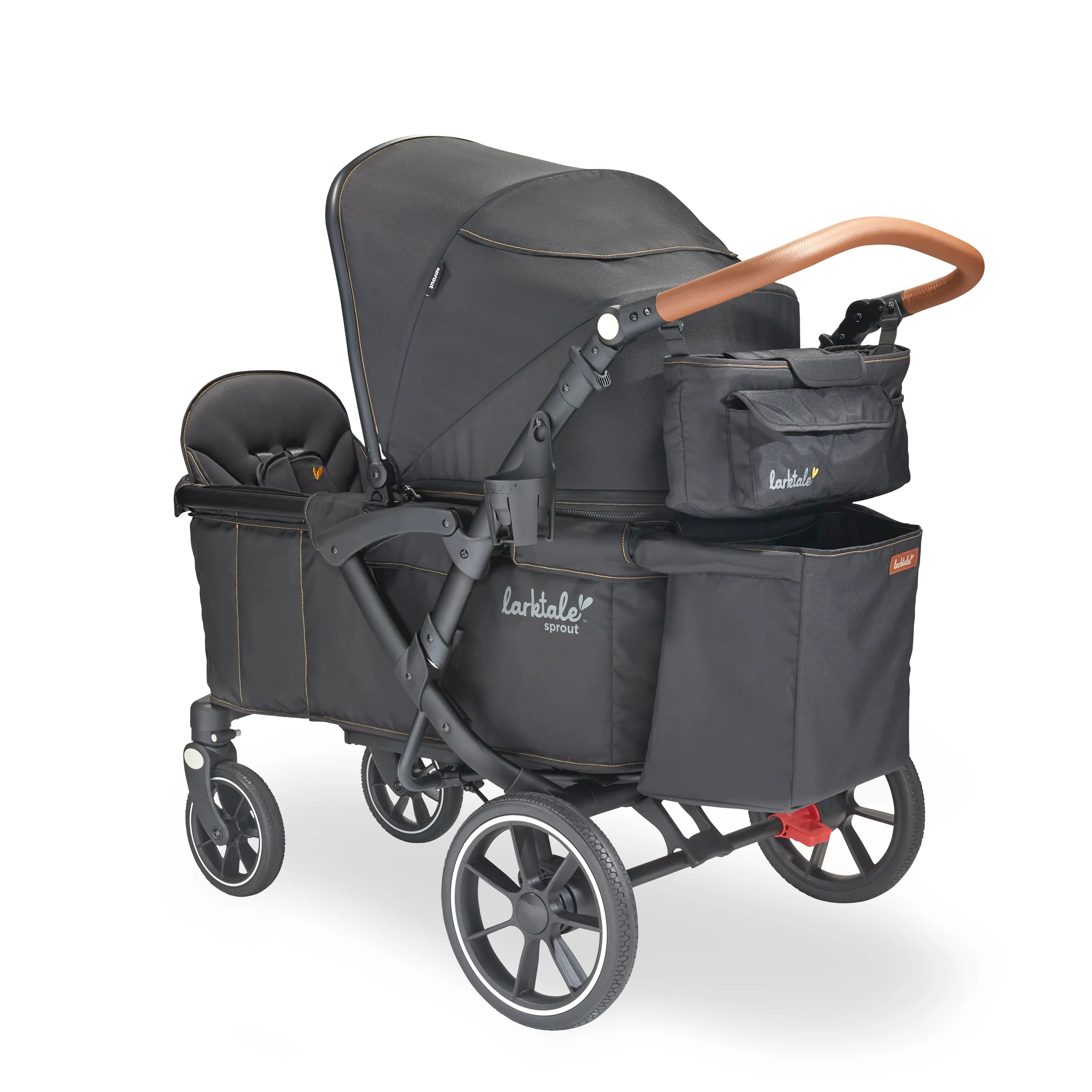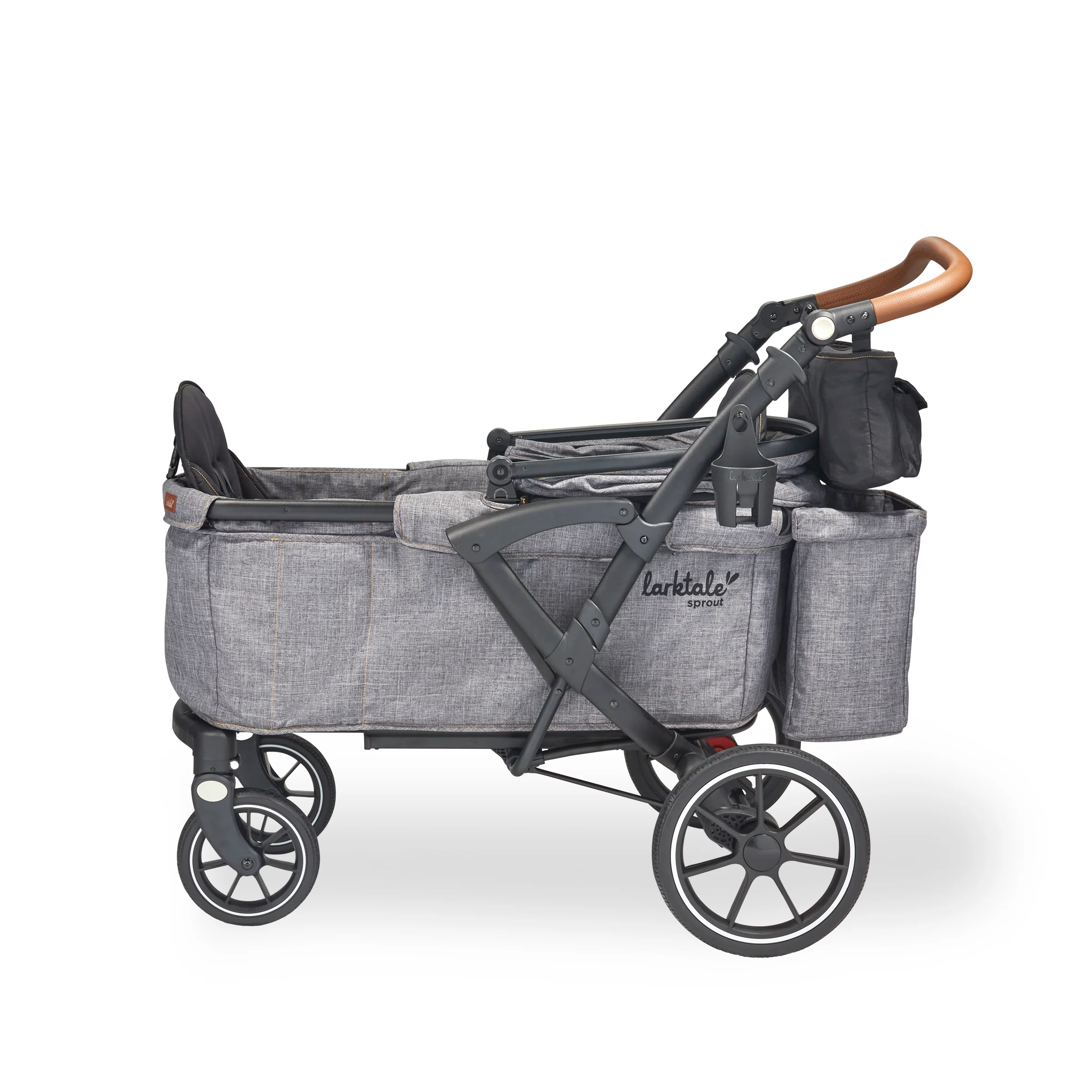 The Larktale sprout™ V2 Single-to-Double Stroller/Wagon is a stylish, first of its kind, size-adjustable wagon, designed for families living in metropolitan areas or have limited space in their home. The sprout is a compact single-seater wagon that parents can expand into a double-sized wagon with no tools or conversion kits needed. With the sprout, parents have the option to select the right size chassis for their activity: Need extra cargo space or to add a seat for an extra kid? Simply expand the sprout wagon chassis to make room for it all. Dropping off one kid at a playdate before running errands with the other? Shorten the sprout wagon chassis to make strolling with one kid a little more practical. All conversions can be completed in 5 seconds or less in this innovative stroller/wagon and everything you need is included. Beyond the innovative flexibility of the sprout, parents will also love the luxury styling, extra-large sun canopy with air-flow panel and peek-a-boo window, the large storage basket, cargo divider for when the second seat is not in use in double mode, included parent’s console, leatherette wrapped adjustable handlebar, and all-wheel suspension. Suitable for kids from 6 months to a combined kid/cargo weight of 120 lbs. The compact flat fold of the sprout allows the wagon to be easily stored and transported.