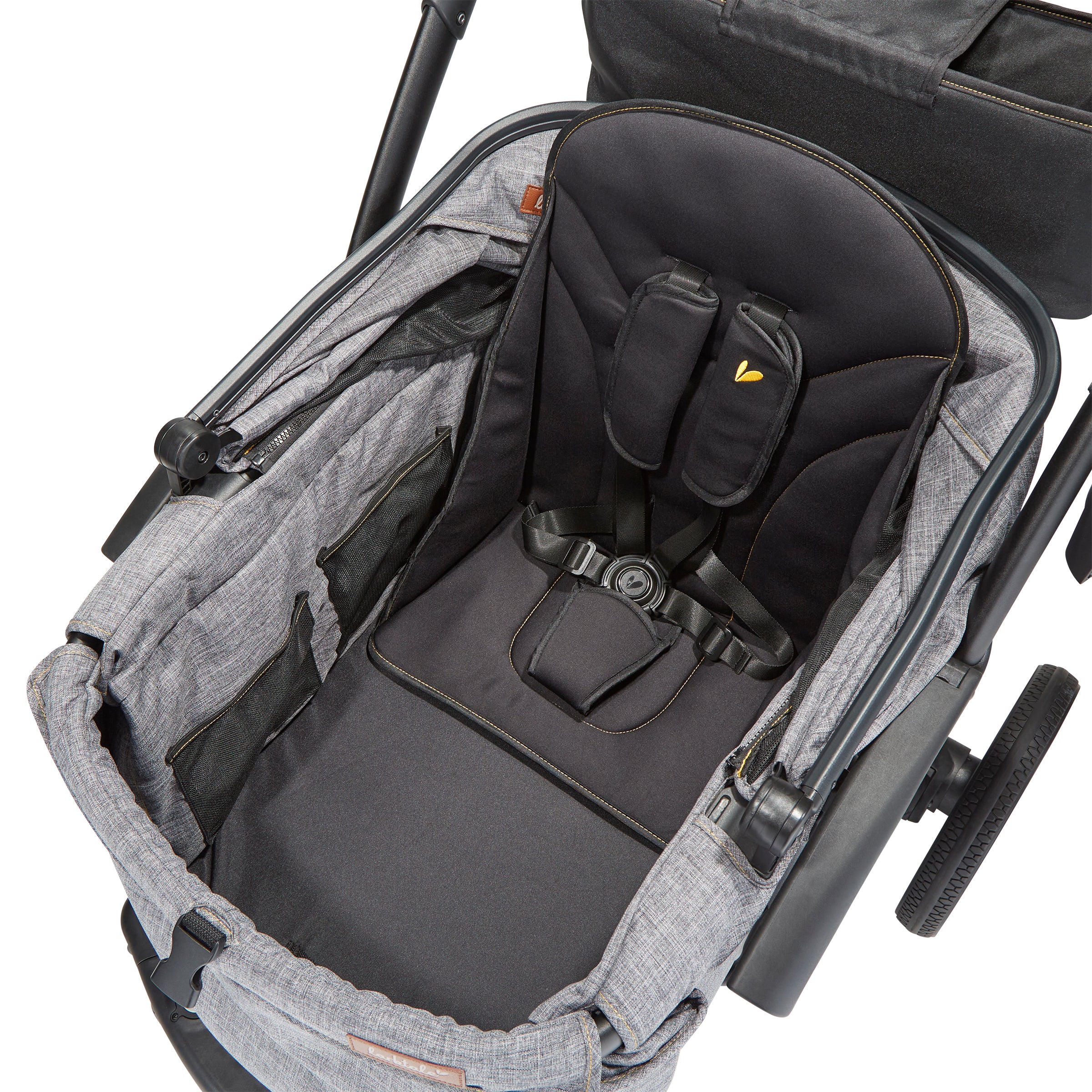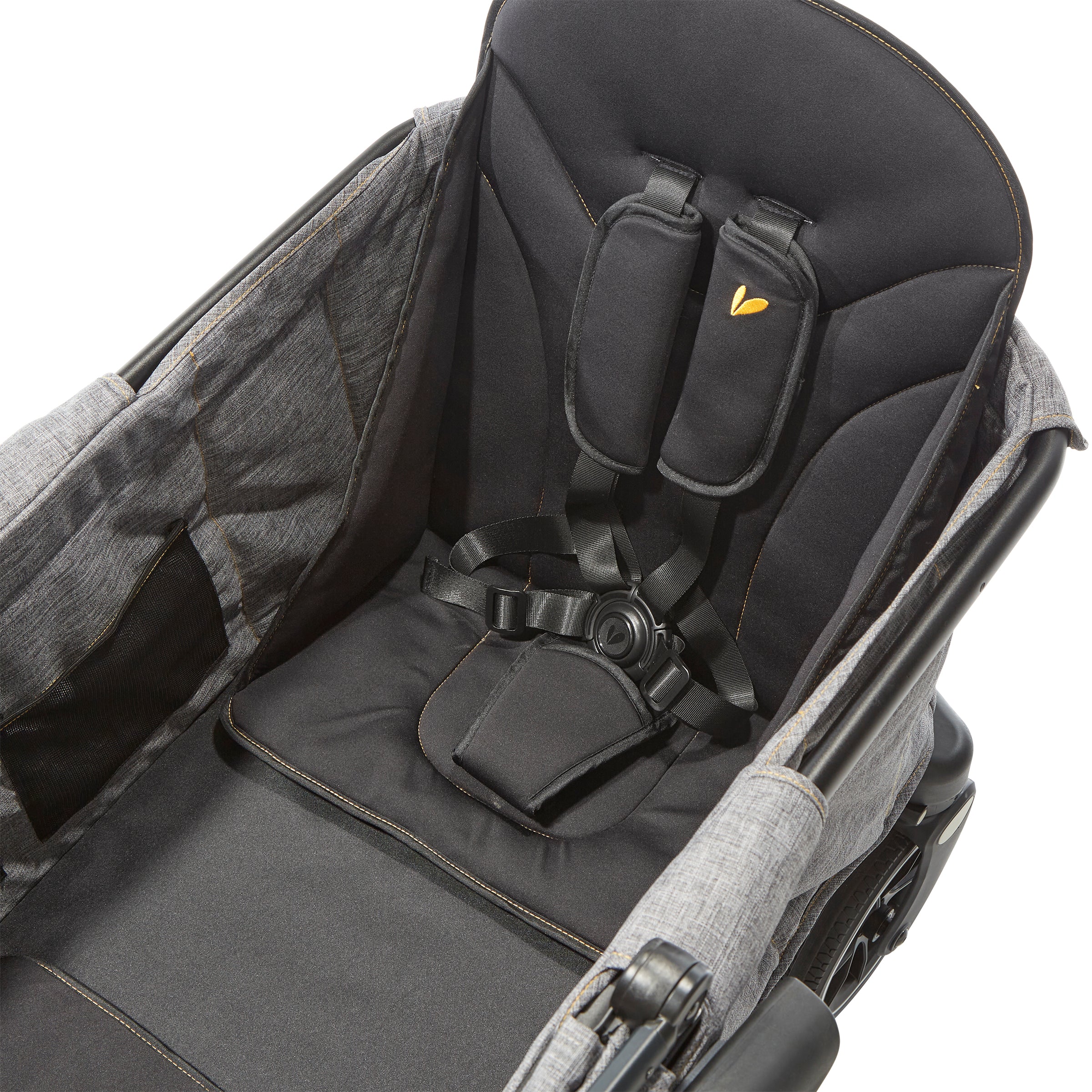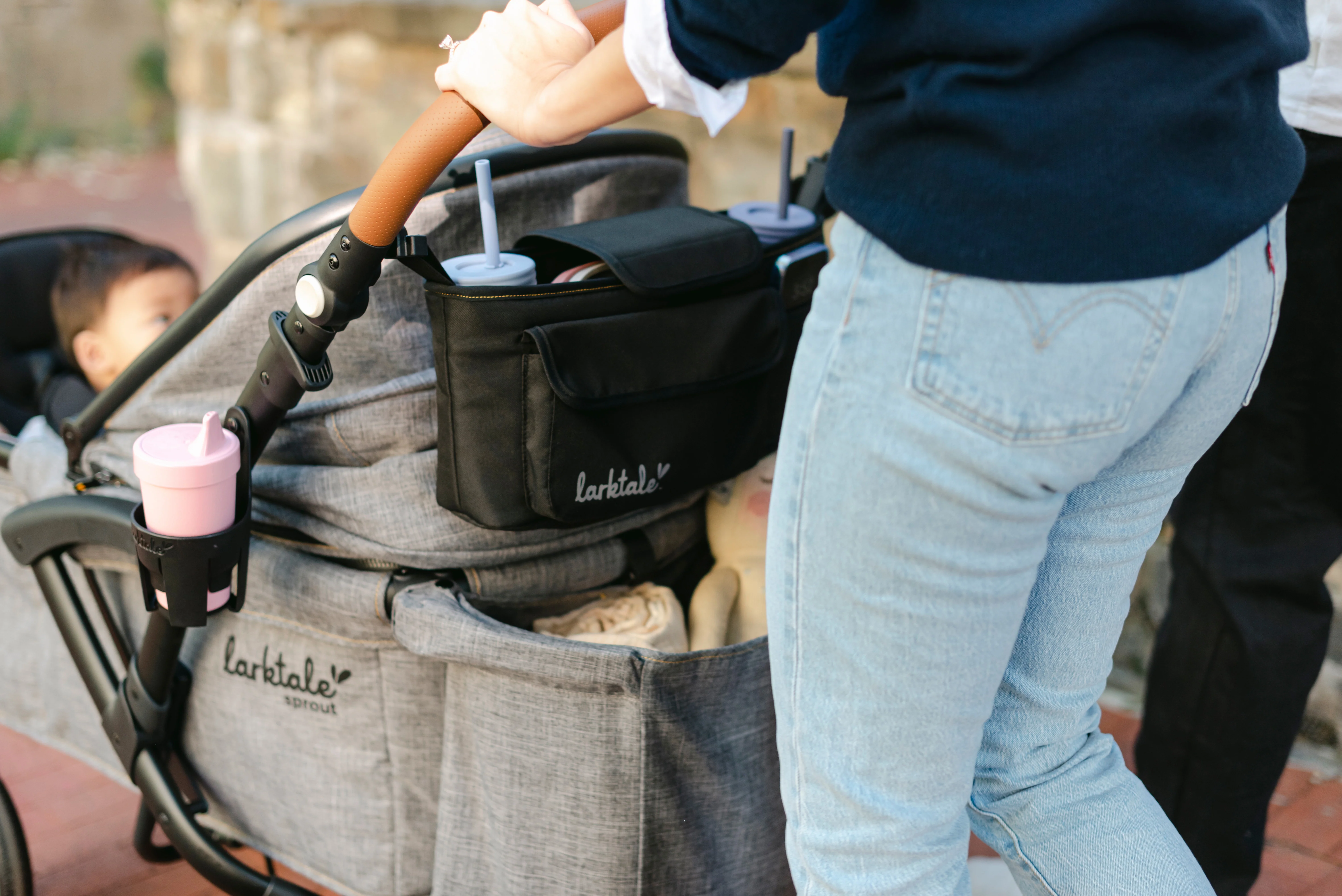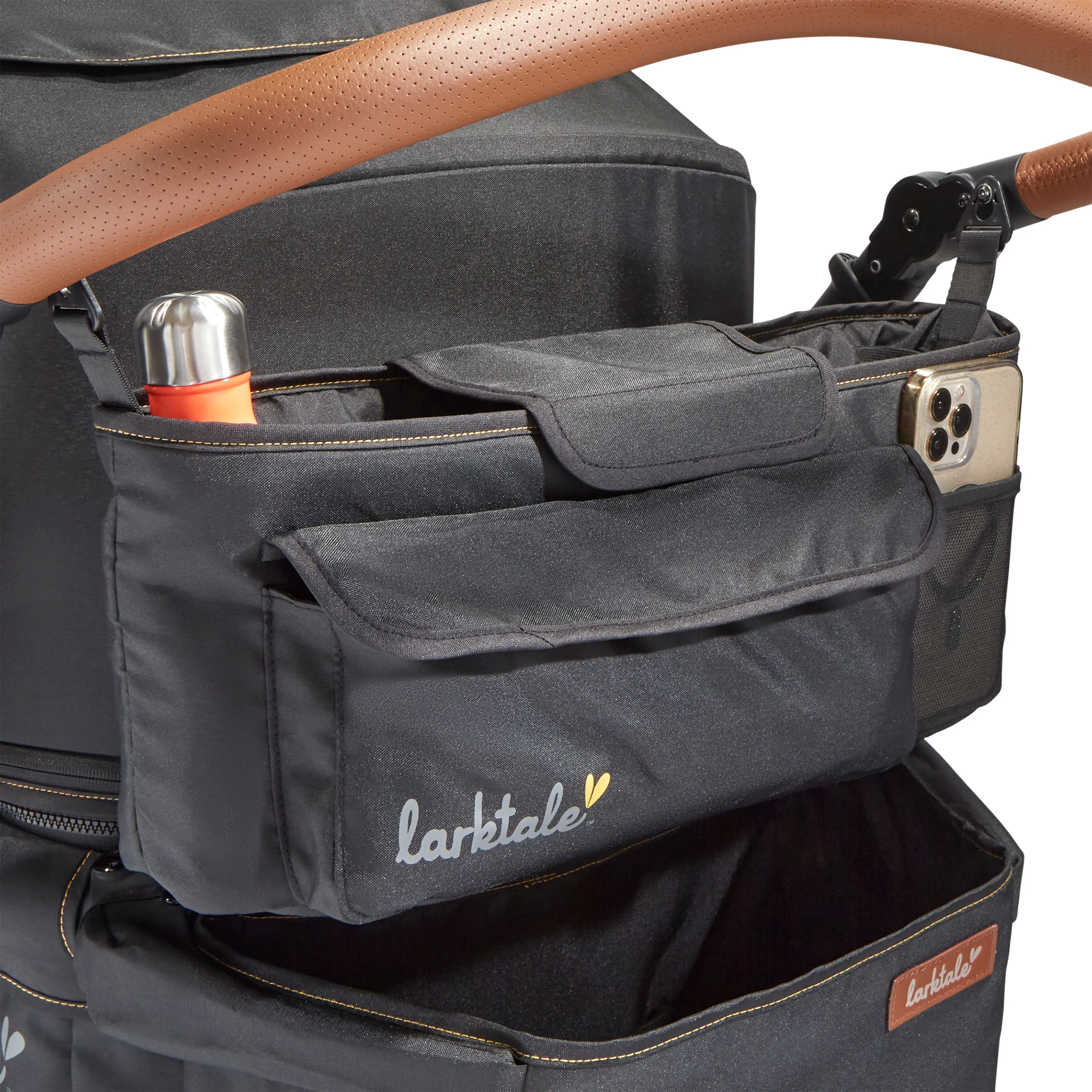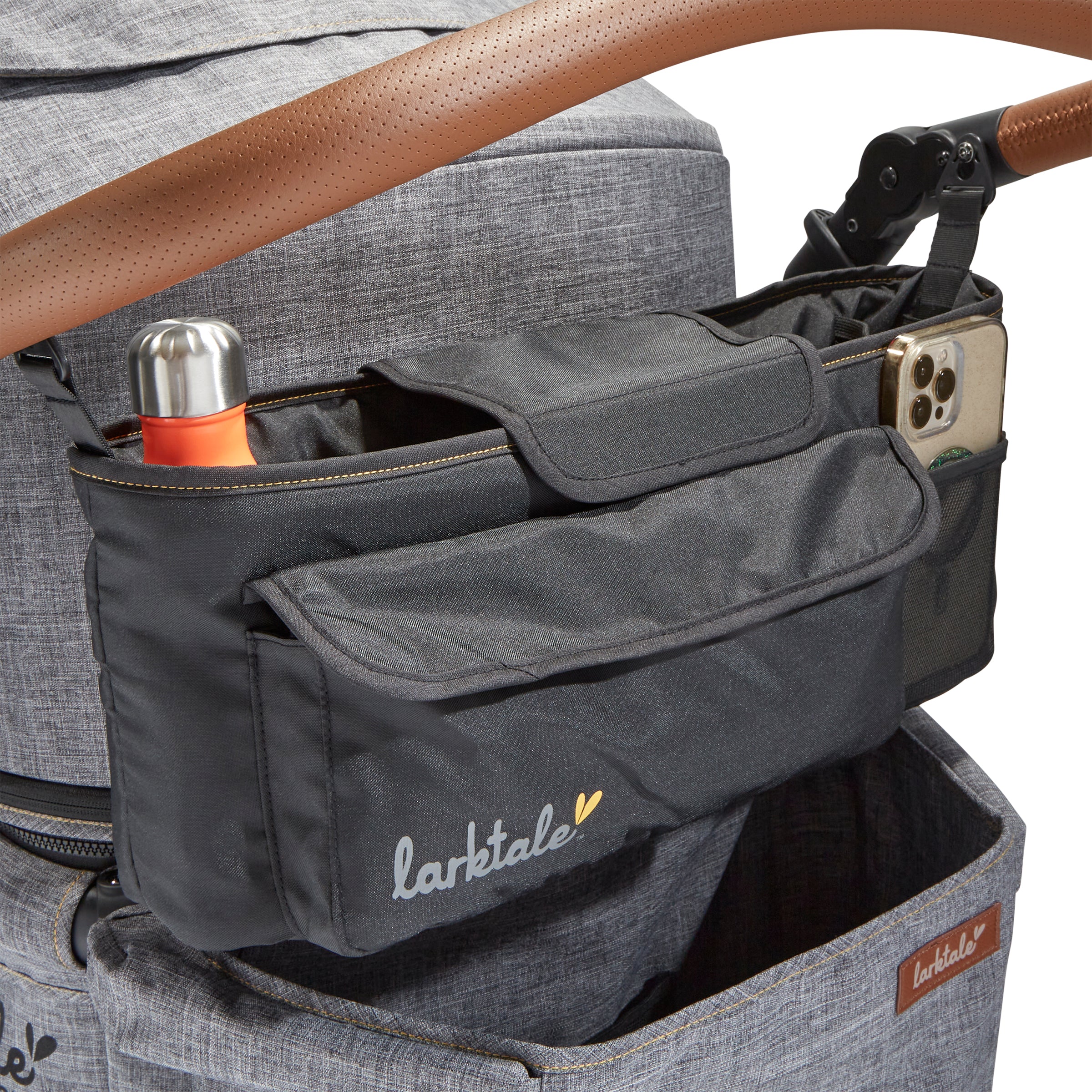 - Handlebar stroller console with multiple storage compartments for drinks and personal items.