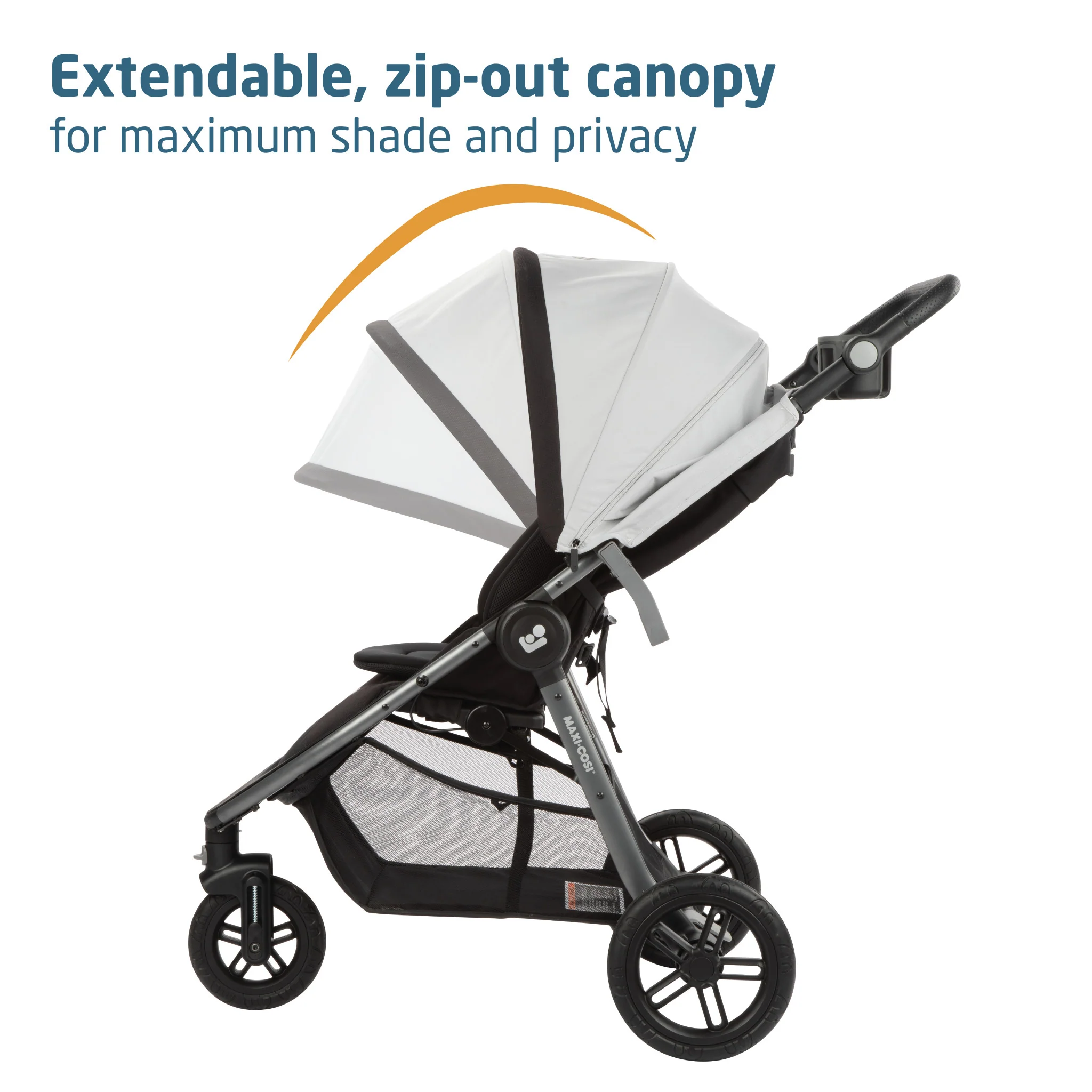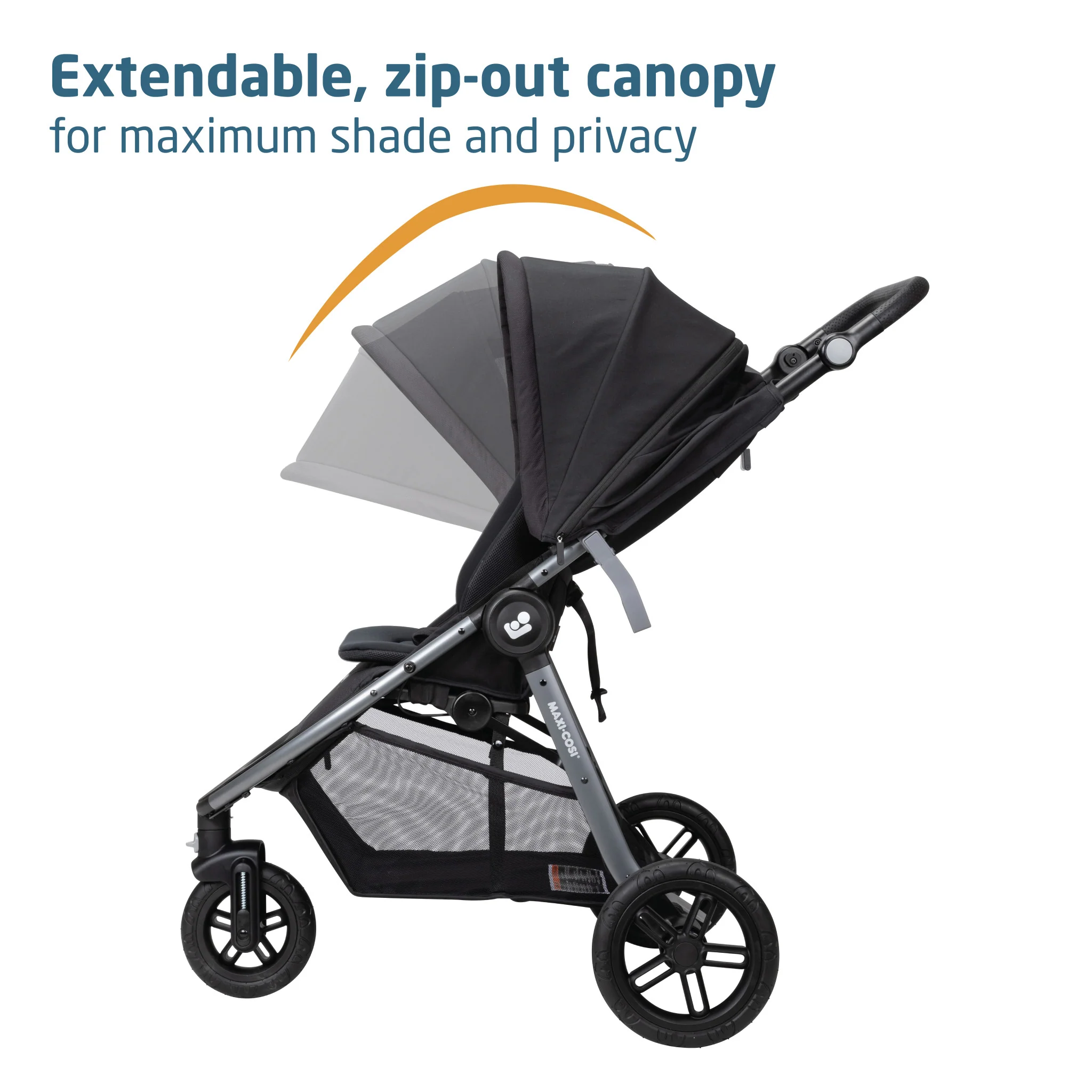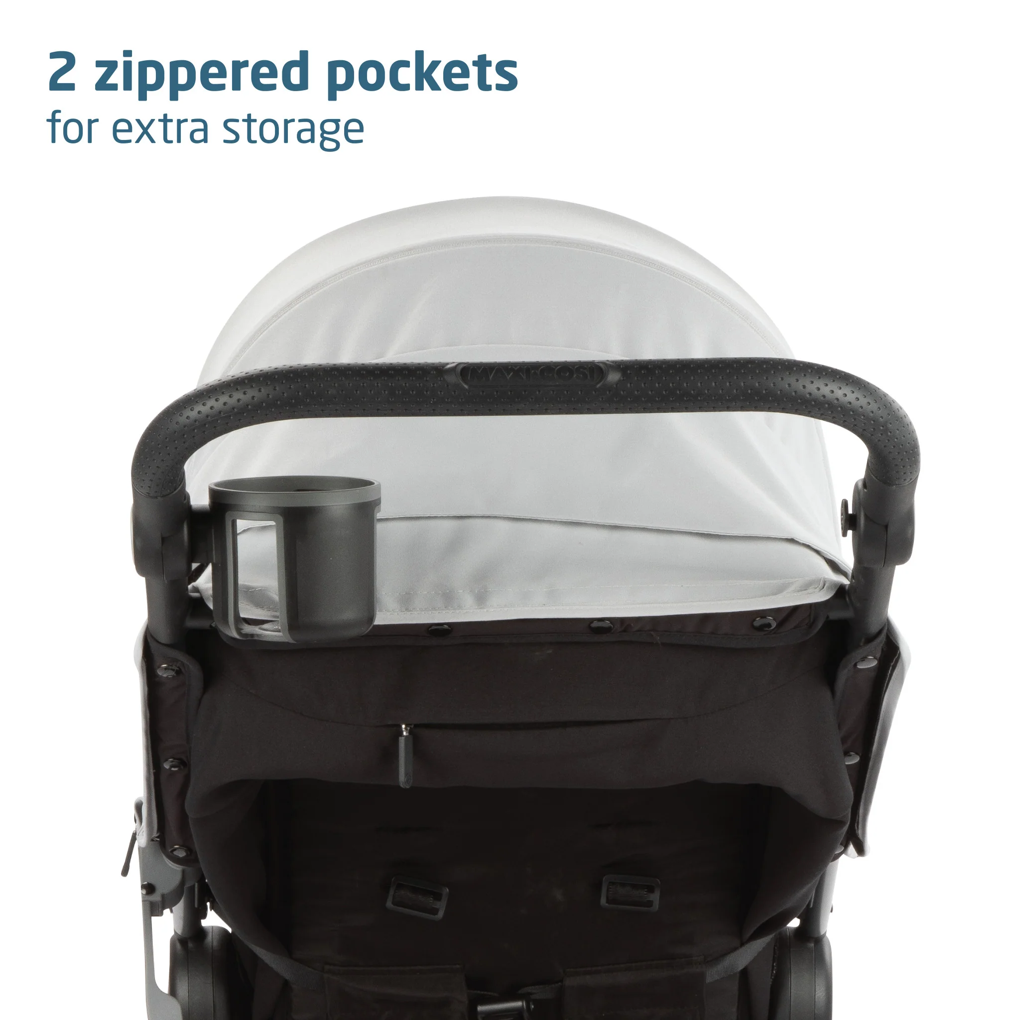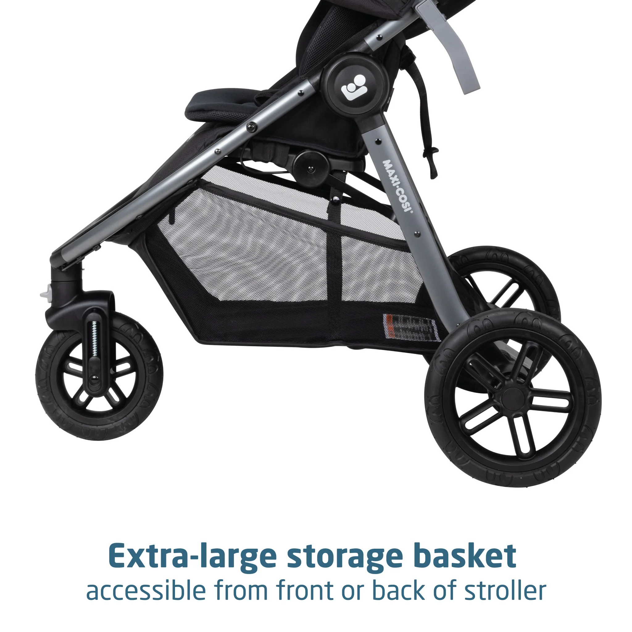 • Extra-large storage basket accessible from front or back of stroller, plus 2 zippered pockets