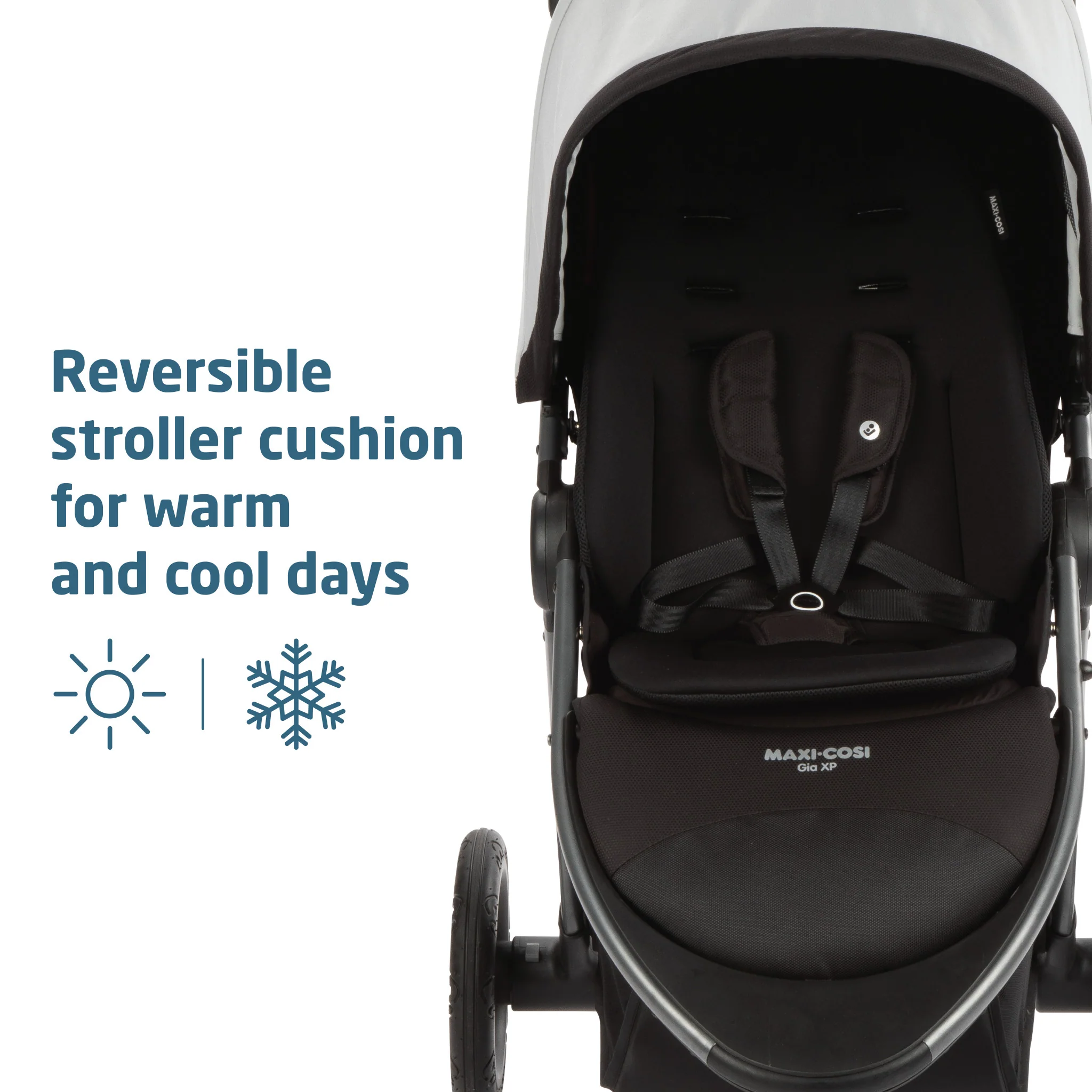 • Removable and reversible stroller cushion with mesh fabric on one side for warm days and plush, cozy fabric on the other side for cool days. Machine washable and dryer-safe.