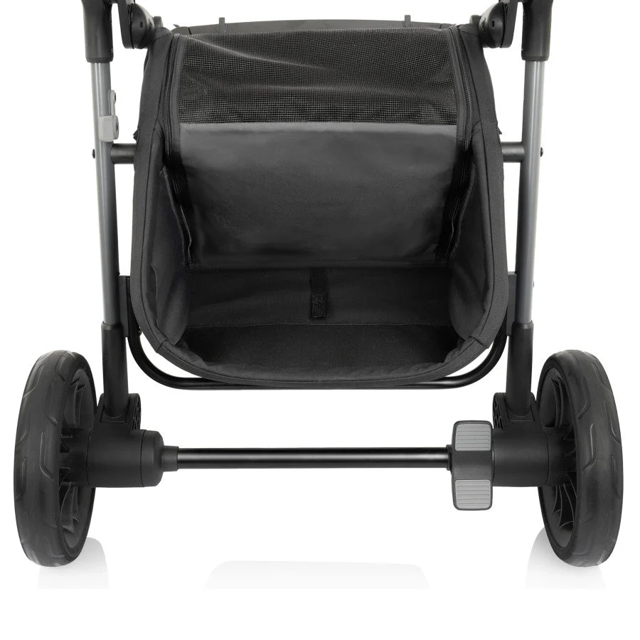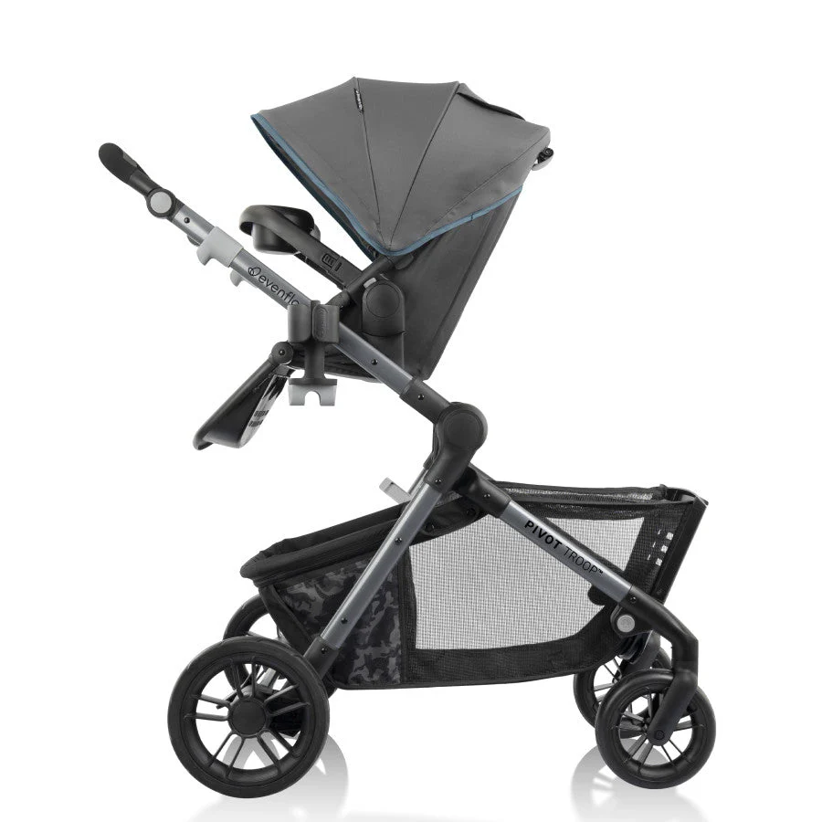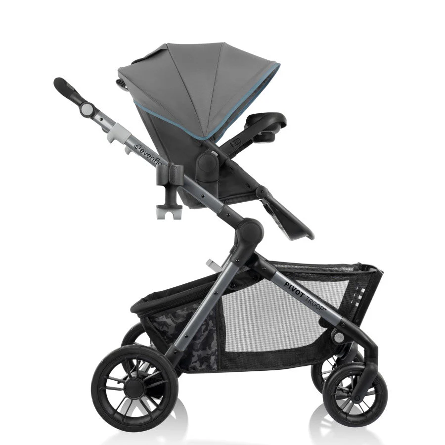 Pack up your very good peanut, your very good pup, and head out on a very good adventure TOGETHER in America’s first modular child and pet travel system: The Evenflo® Pivot Troop™ Child and Pet Modular Travel System! A unique addition to our popular Pivot® collection, the versatile Pivot Troop dog and baby stroller combo includes a LiteMax™ Infant Car Seat for easy transitions from your car to the stroller frame, designed to accommodate kids weighing from 4 to 35 lb (17 to 32 in.). As your infant grows, move them into the included 3-position recline toddler seat that holds a child up to 55 lb. With a 2-position footrest for comfort and a BPA-free child snack tray for nibbles and sippy cups, your little rider is all set for outings. Both the infant car seat and toddler seat can be parent-facing or forward-facing, providing the flexibility you need on the go. We made sure you have everything you need for more convenient outings with your kiddo — while paying special attention to your doggo! Here’s how easy it is to bring them along: Just drop down the Troop’s ramp to let your four-legged friend into and out of their very own space. The oversized, dividable basket is our largest yet and holds a small dog up to 35 lb, with a separate storage area that holds an additional 10 lb. To maximize space for your essentials, just roll down the basket divider to make room for up to 45 lb of storage — diaper bag, shopping bags, you name it! Because your pup will be excited to join your outings, we’ve added a zippered mesh top and D-ring for your own tether to the basket to help to keep eagerness contained.* This child stroller and car seat combo offers a few more perks for your furry little friend: a water bowl and treats container with lid that connect to stroller frame like a cup holder, as well as a convenient waste bag holder integrated into your removable parent cup holder for timely clean-ups (be sure to load the holder with your own bags before you leave home). Our child and pet stroller folds compactly for stowing in your vehicle or storing at home. Pivot Troop. The way to take your whole troop, so no one is left out of the fun! [*To avoid injury from your pet falling or sliding out of the basket, you may attach your own pet tether to the D-ring inside the basket. Tether should be 24 in. or less in length.]