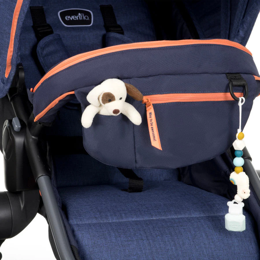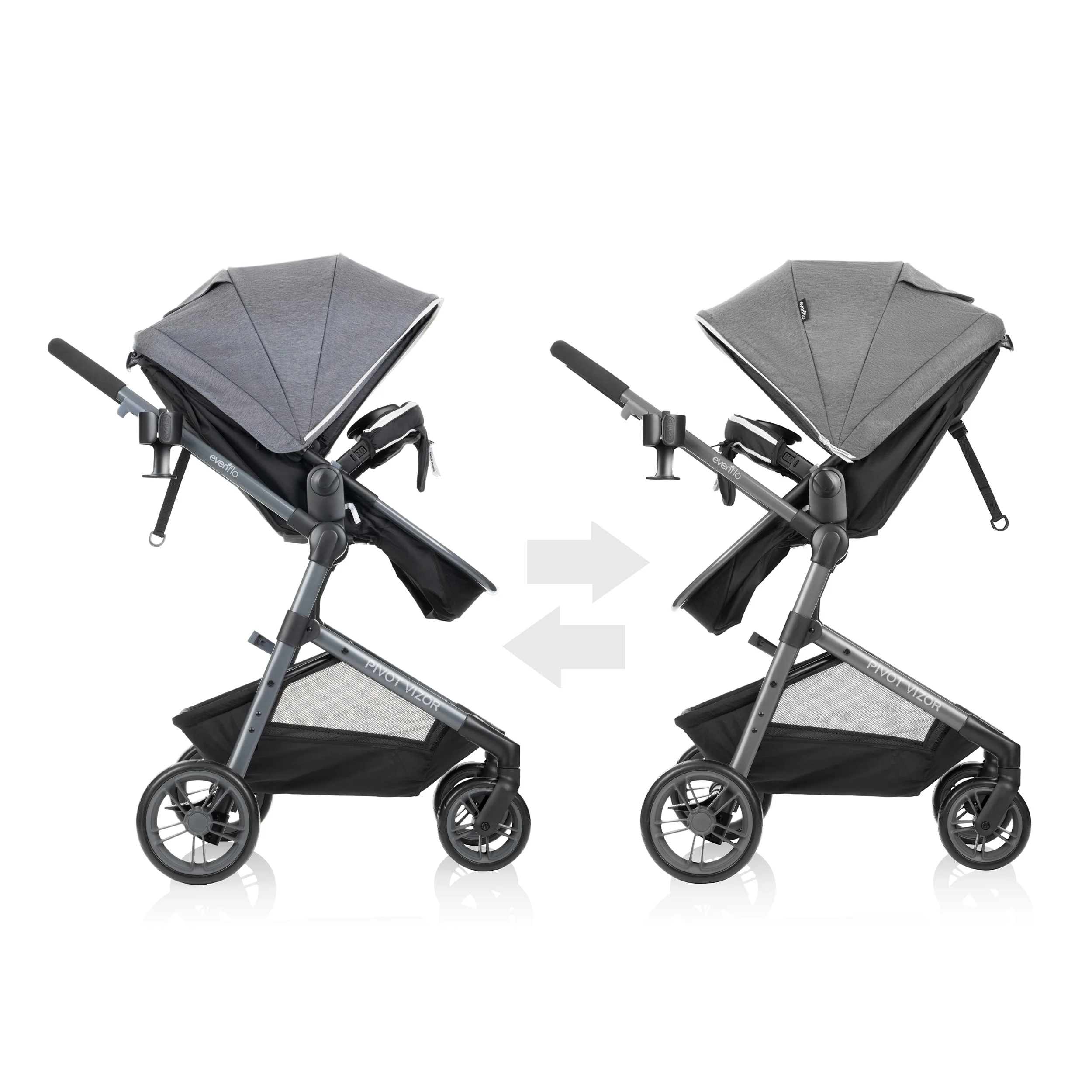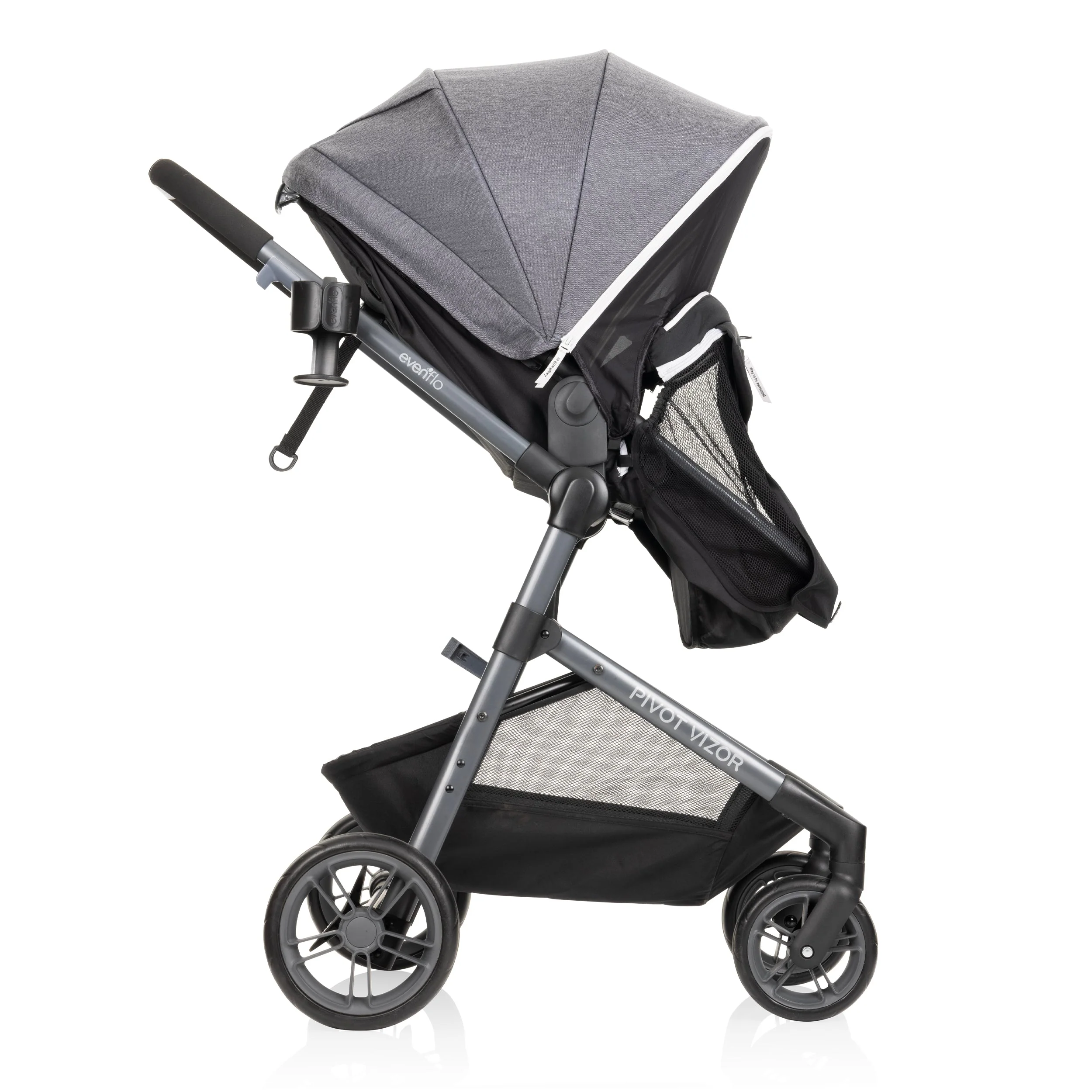 When your little one needs a quiet moment, Evenflo® Pivot Vizor™ Travel System has it covered – literally. This is the only travel system with a mesh privacy shade to accompany your infant's car seat and stroller in both toddler and carriage modes. The privacy shade stores in a handy bumper bar pouch so it's ready at a second's notice, then zips to either canopy in no time – no tools necessary! How does it work? When it's time to break out the two-piece cover, simply unzip the top portion and attach to the toddler seat. Or you can pull the bottom portion from the pouch's zippered pocket and attach it to either the toddler seat or infant seat. Our Pivot Vizor Travel System is wildly popular for a versatile design that grows with your child. The reversible, modular frame allows baby to face in or out – in carriage mode, car seat mode or toddler mode. Not just clever, convenient. In all, there are 6 modes of use to choose from. Why so many? Because, as every parent knows, it's a relief to have options! The Pivot Vizor Travel System brings together a modular stroller designed for a child up to 55 lb with the Evenflo LiteMax™ Infant Car Seat for infants weighing from 4 to 35 lb. With large cruiser tires, front-wheel swivel and rear-wheel suspension, baby will appreciate a smoother ride and superior maneuverability. With a flip-flop friendly brake to keep the stroller still as you take your child in and out, an oversized peek-a-boo window for keeping tabs on baby, an oversized storage basket, and a flex-hold cup holder for the driver that locks to keep beverages secure, you'll have plenty to be happy about, too. For even more riding options, you can also add the accessory Stroller Rider Board (sold separately). Use it for an extra passenger or simply to give your child a way to quickly hop on and off when little legs need a break.